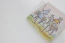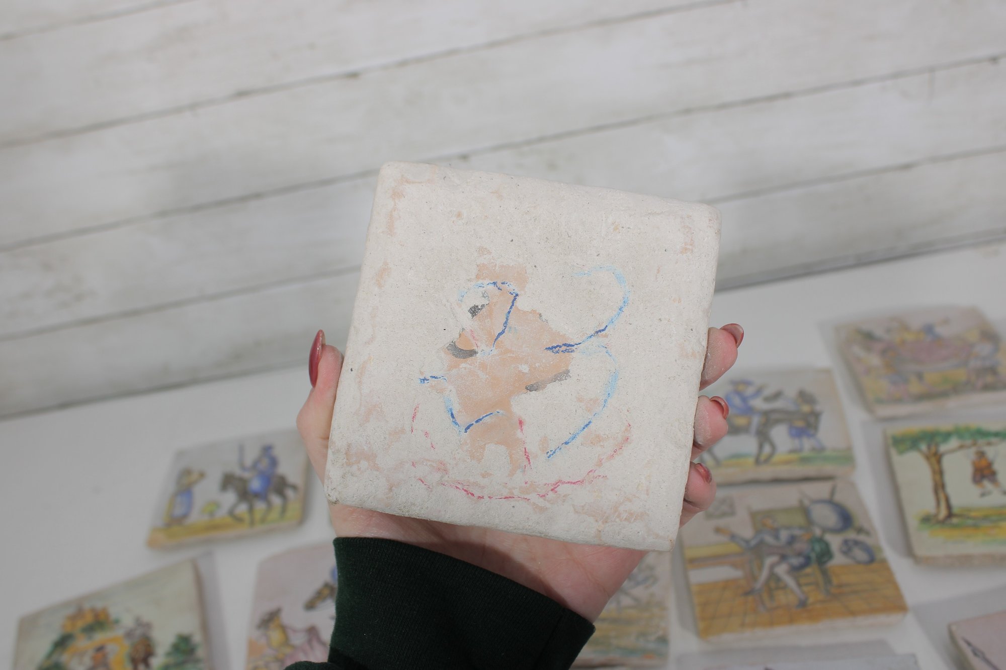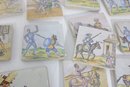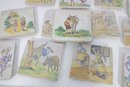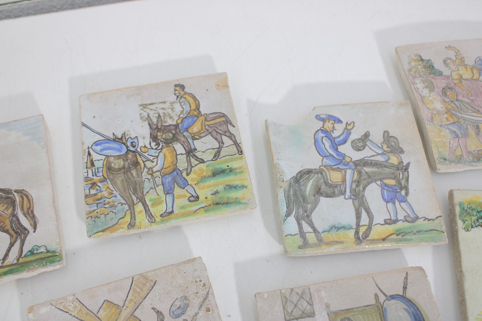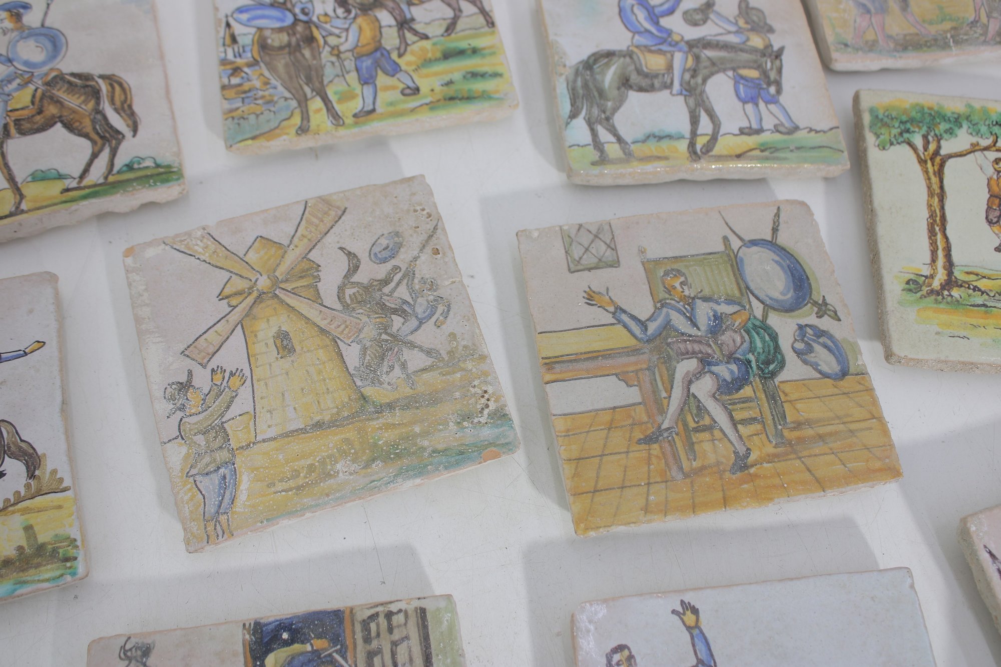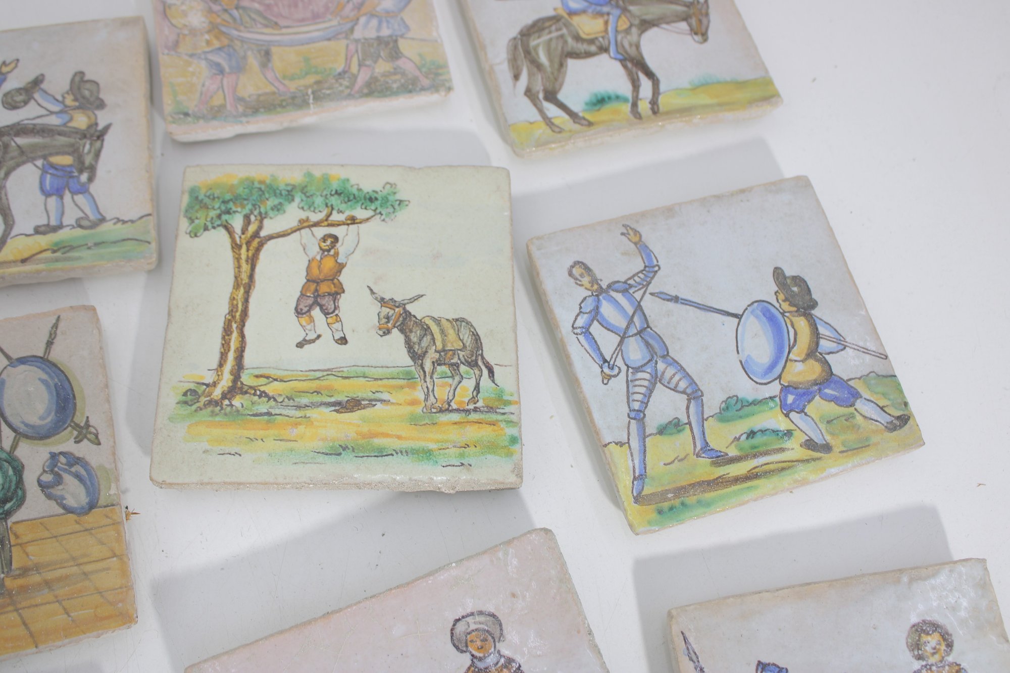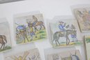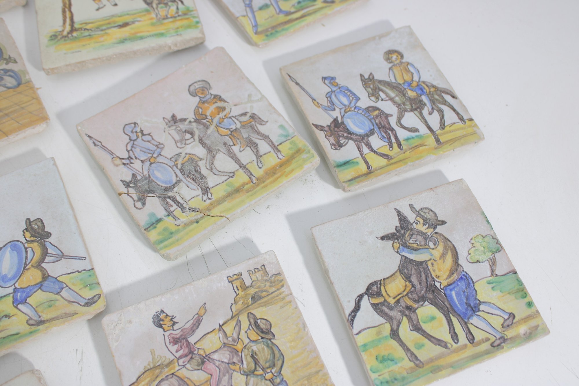 Wonderful large lot of vintage hand-painted ceramic tiles featuring medieval and Don Quixote–style scenes. Each tile showcases detailed illustrations of knights, horseback riders, windmills, and classic storybook battle scenes in soft earthy tones and pastel colors.