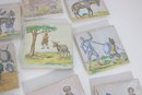 The tiles appear to be individually hand decorated, with slight variations in shading and line work that add to their charm and character. Most are square and feature a matte glazed finish with natural age wear visible on some pieces.
