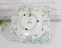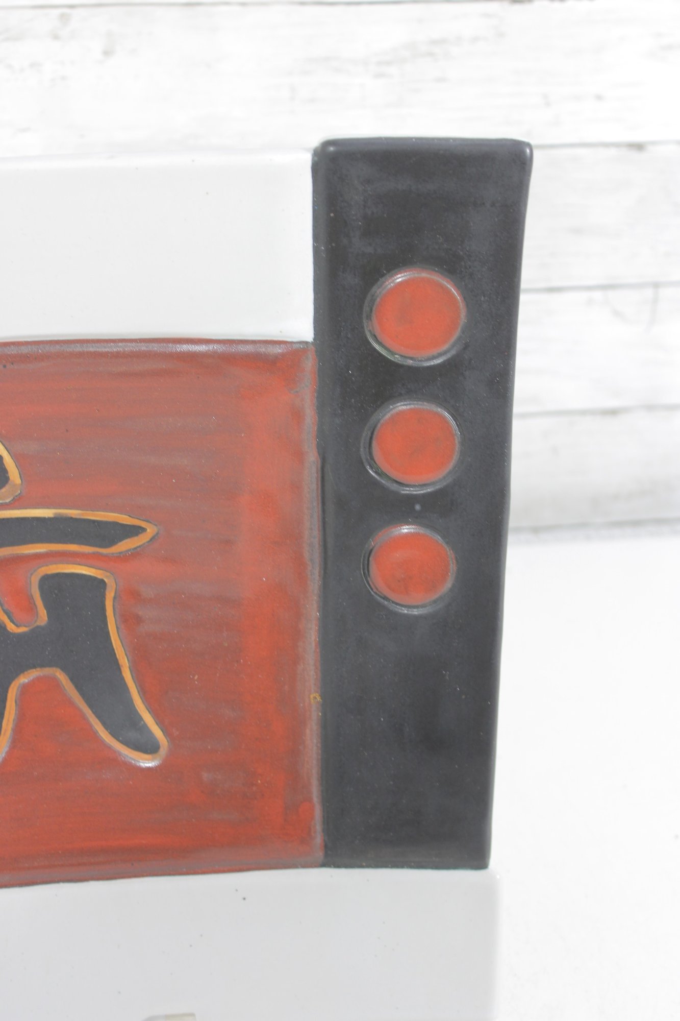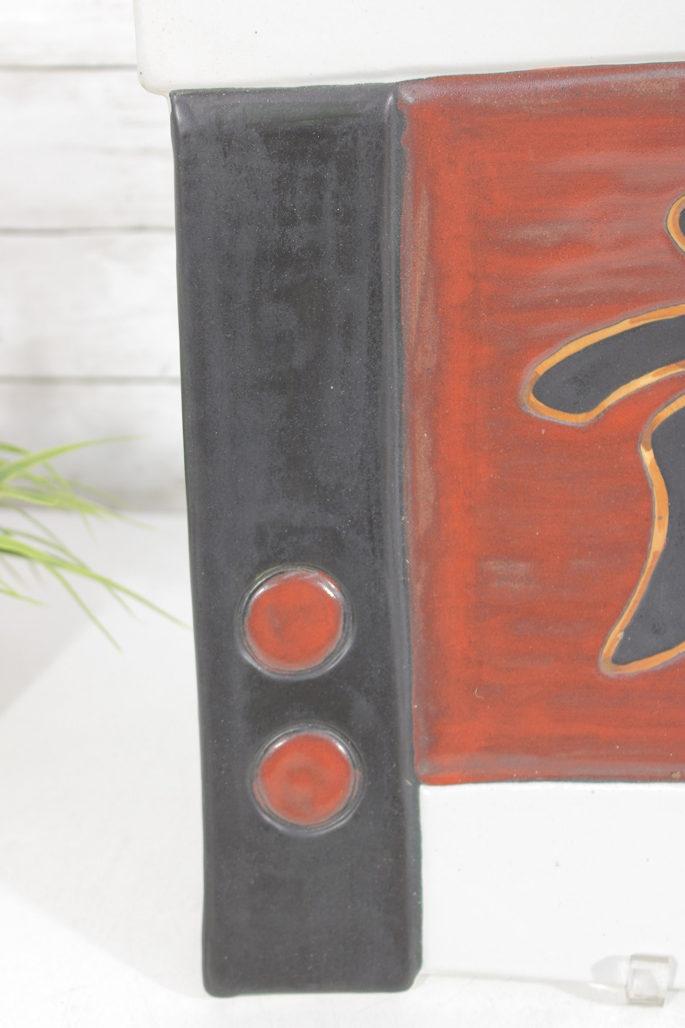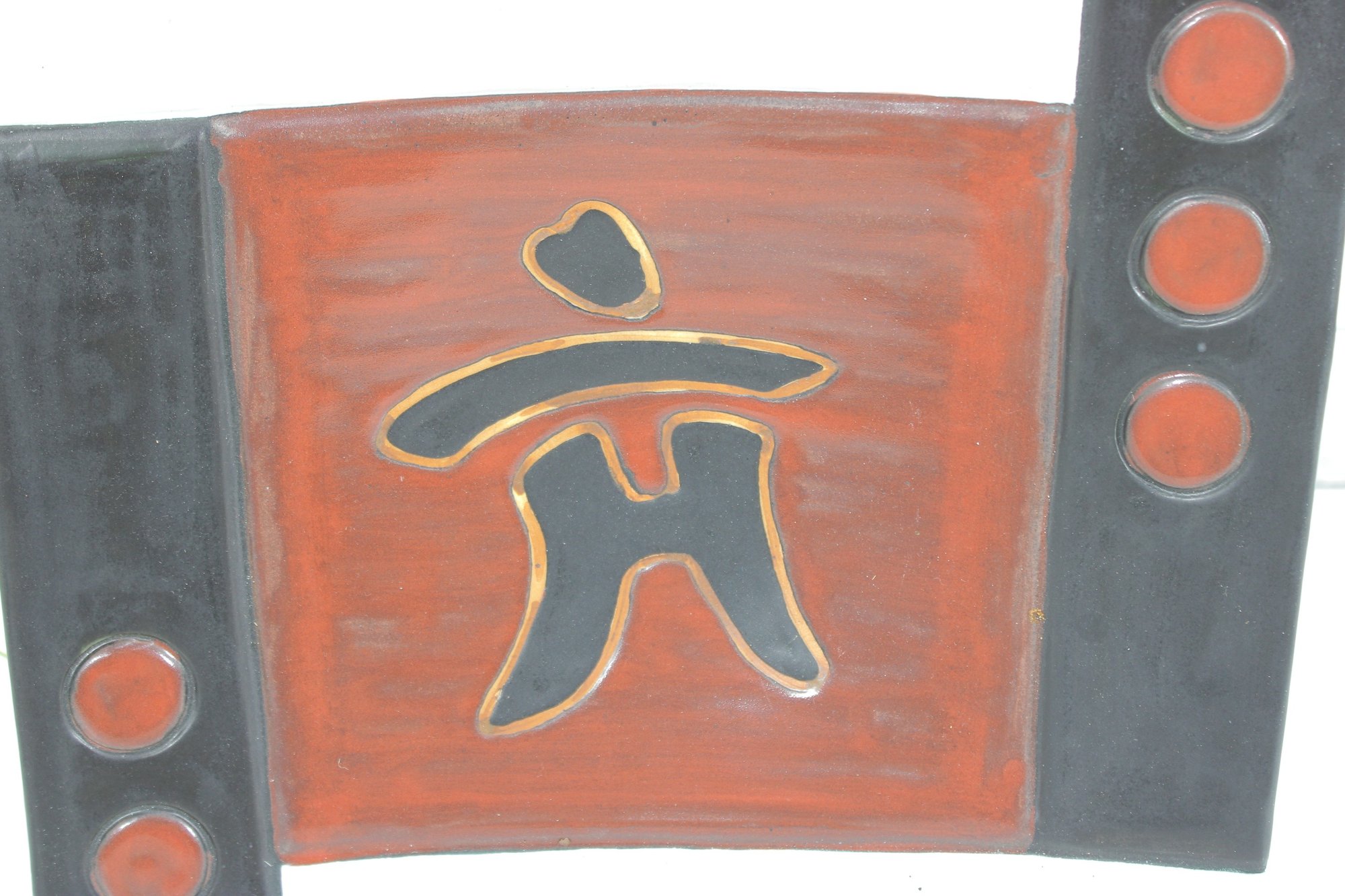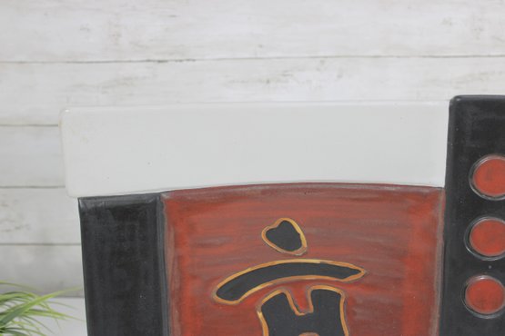 hand-painted ceramic wall plate featuring a bold Asian-inspired design. This large 15" square piece showcases a central character motif in raised relief, set against a rich red ground and framed by contrasting black panels with circular accents.