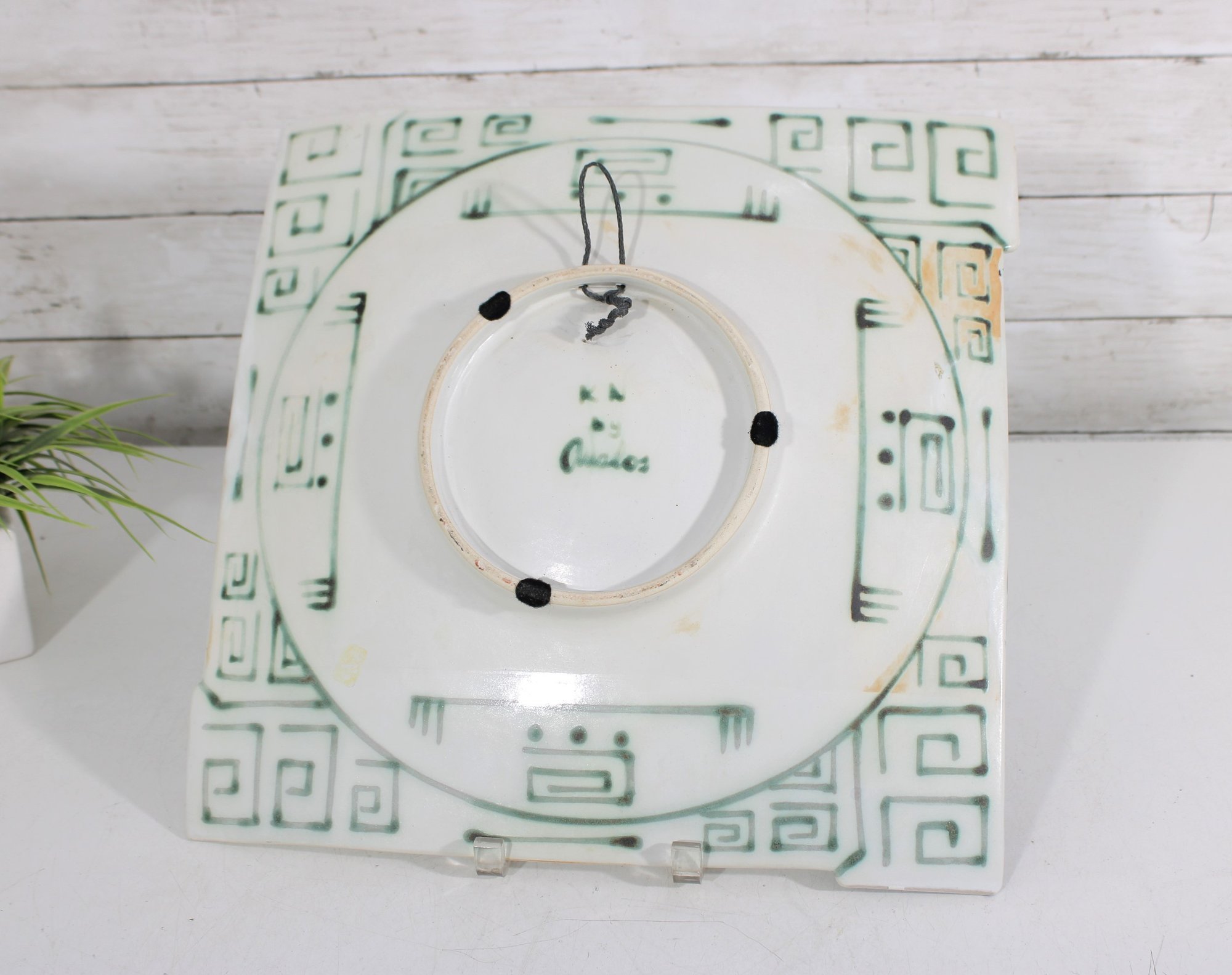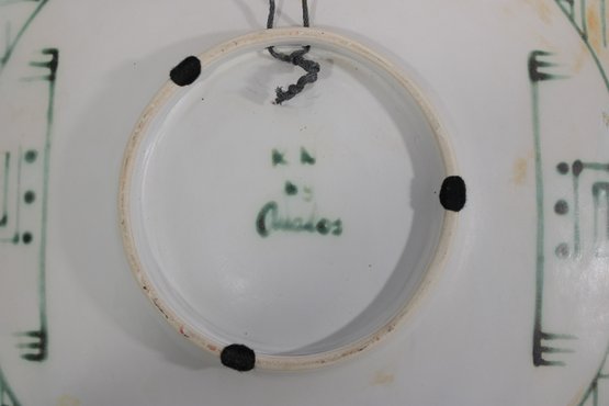 The reverse reveals a complementary geometric pattern in green tones and appears to be signed by the artist, adding to its uniqueness and collectible appeal. The plate is designed for wall display and makes a standout decorative statement in any space.