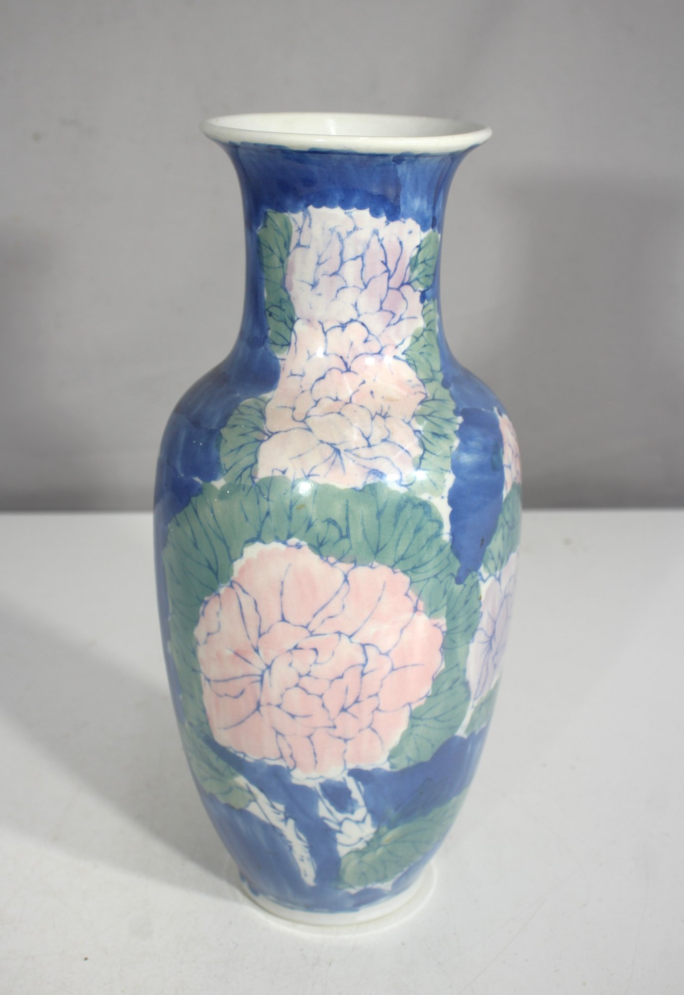 vintage Chinese porcelain vase, standing 12 inches tall, featuring a striking hand-painted floral design in shades of blue, pink, and green. The artwork showcases large blooming flowers against a deep blue background, creating an elegant and timeless aesthetic.