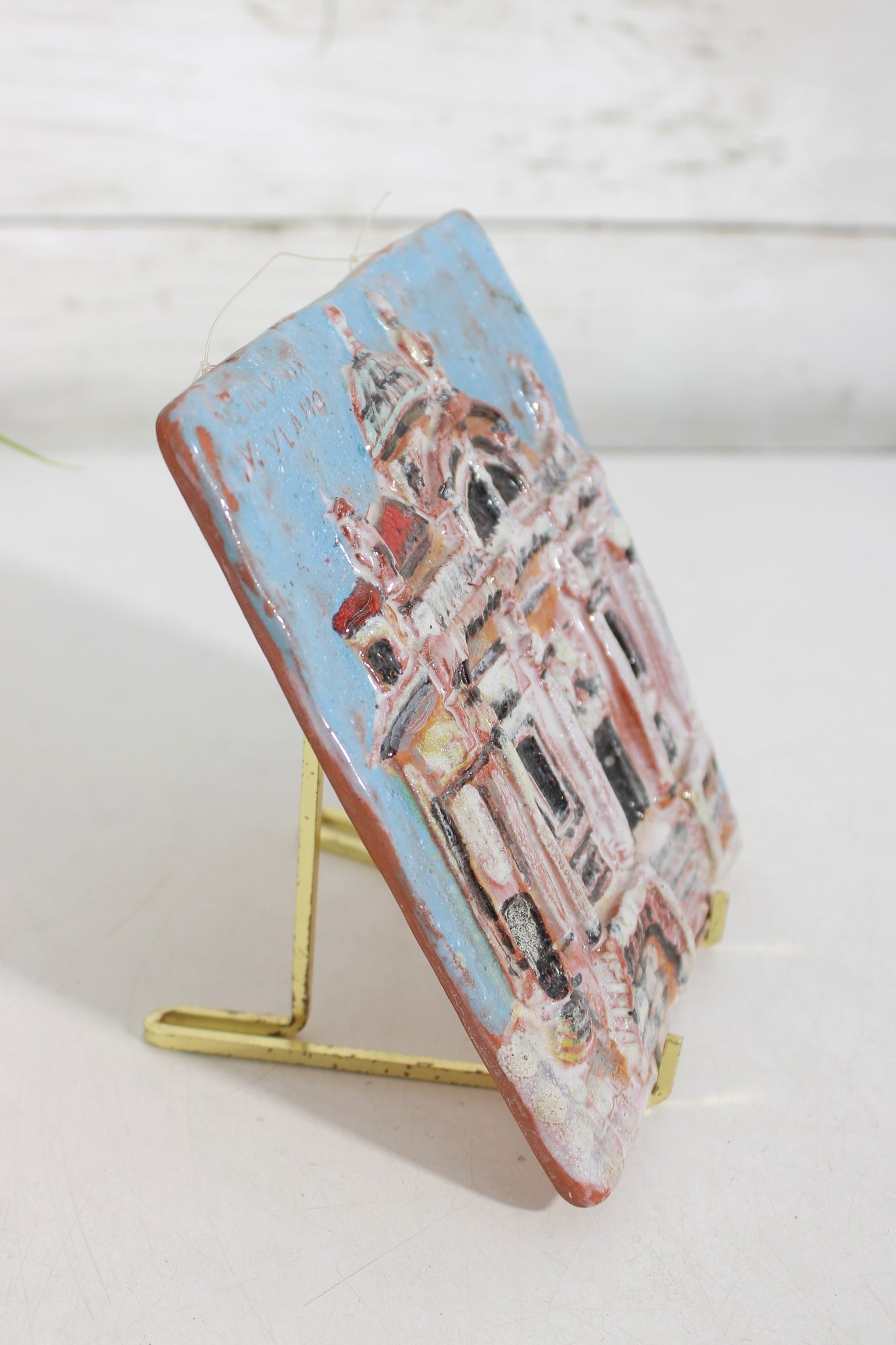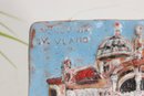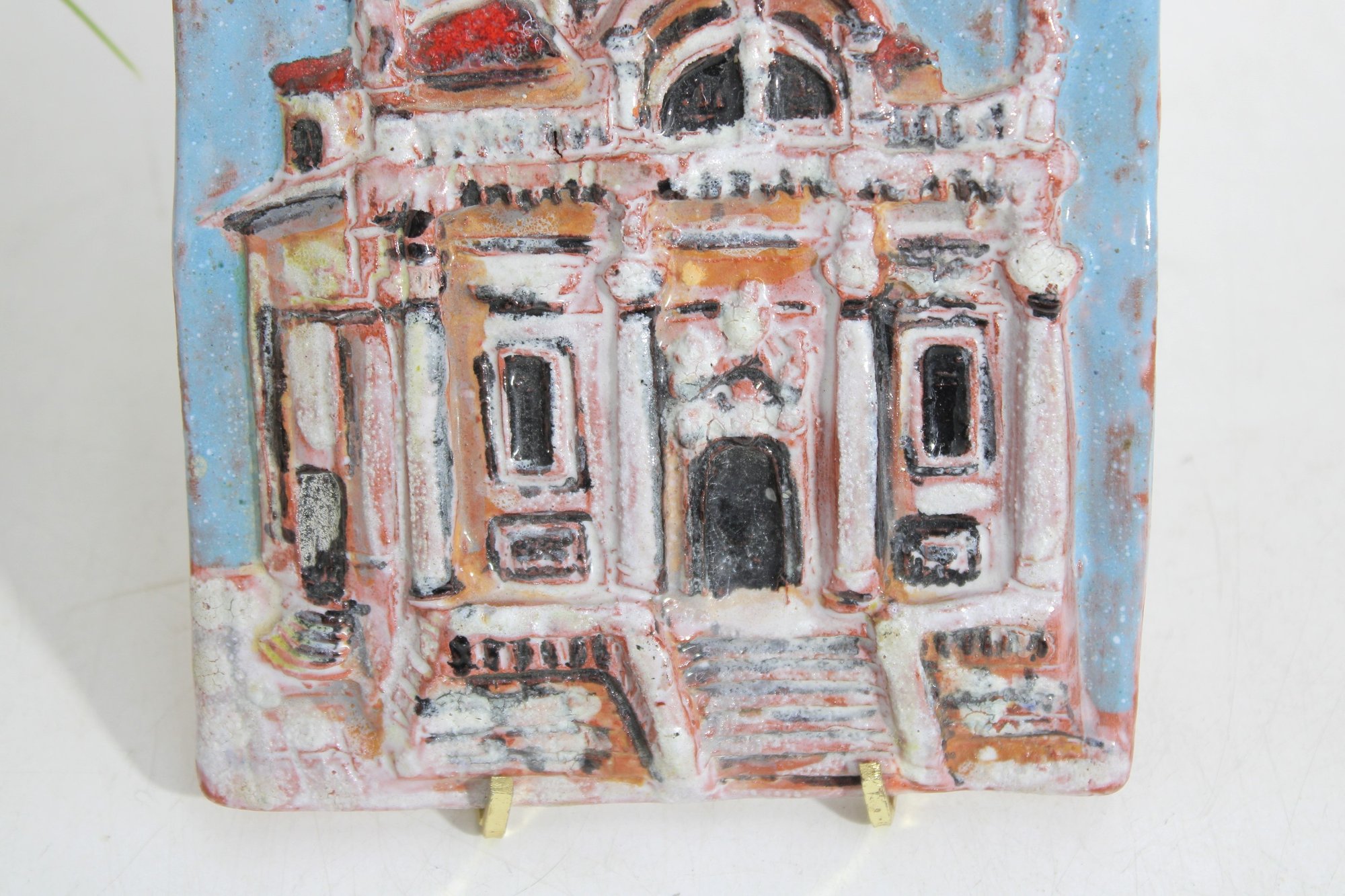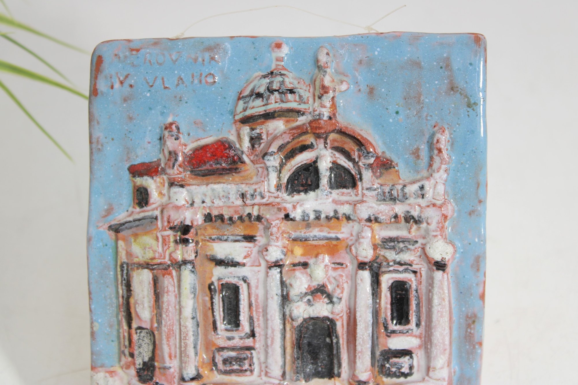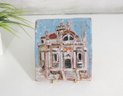 Charming vintage hand-painted ceramic tile plaque depicting a detailed architectural scene from Dubrovnik, Croatia. The raised relief design showcases a historic building—likely a church or cathedral—rendered in soft pastel tones with textured glazing that adds depth and character.