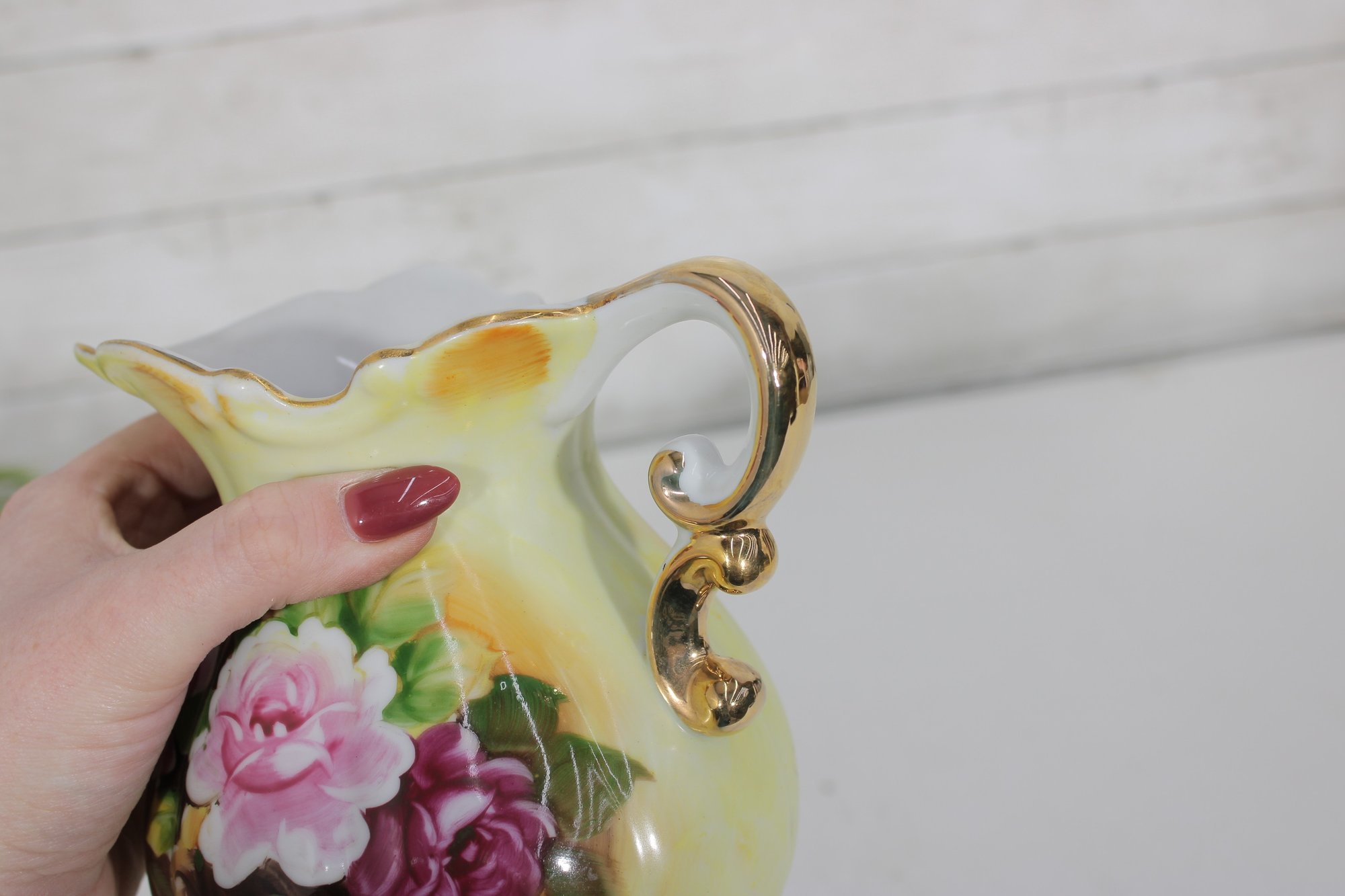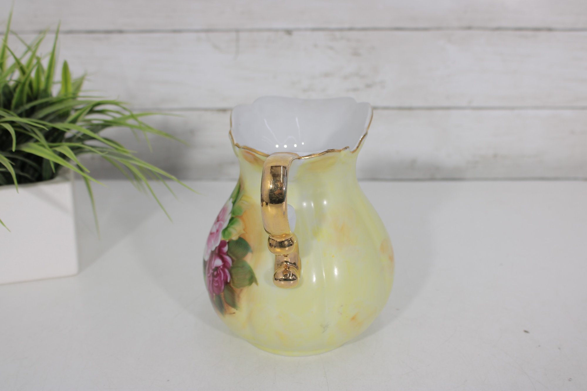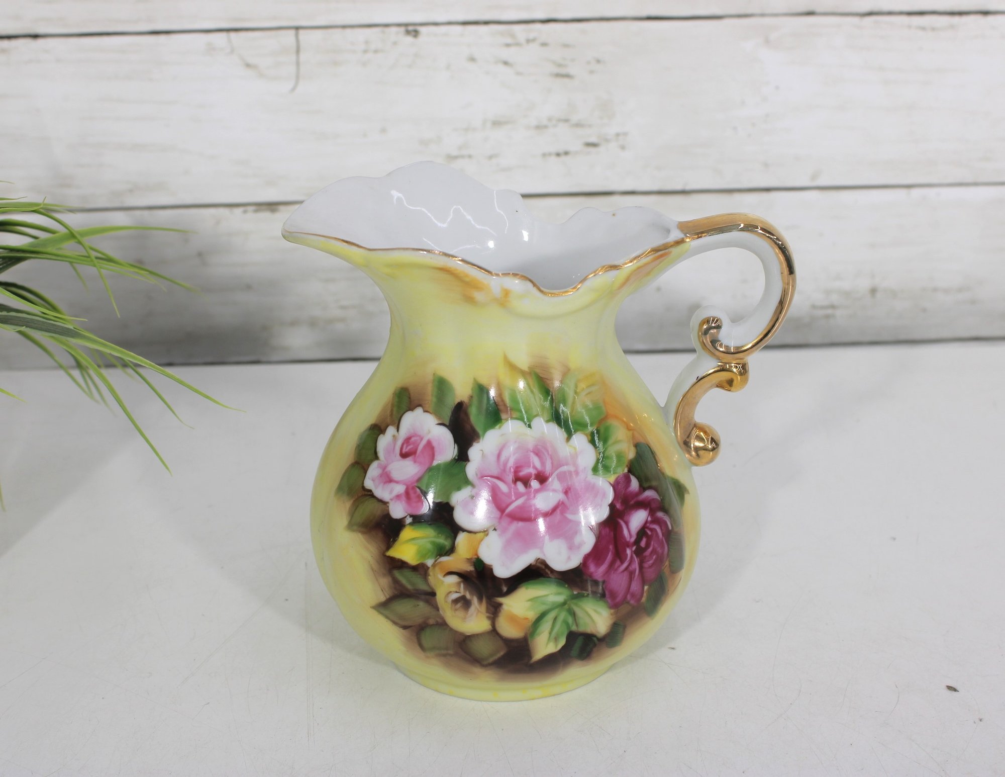 The floral artwork is vibrant and detailed, giving this pitcher a classic Victorian or cottage-style appeal. Perfect as a decorative accent, small water pitcher, or vase for fresh flowers.