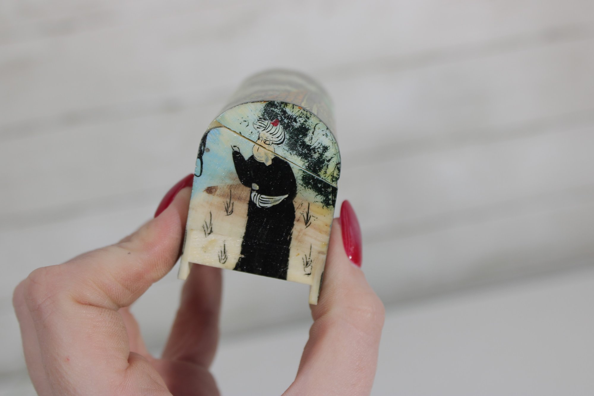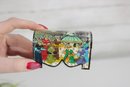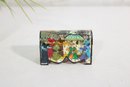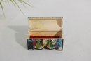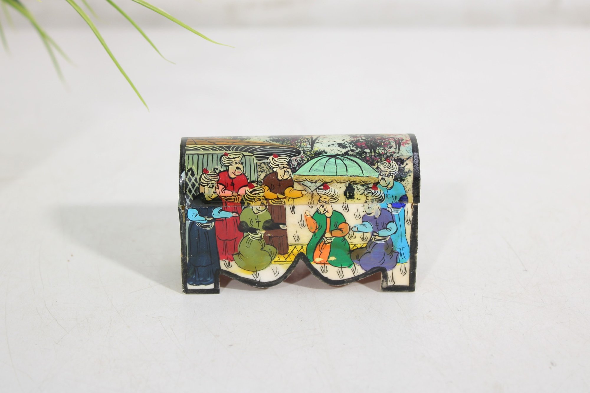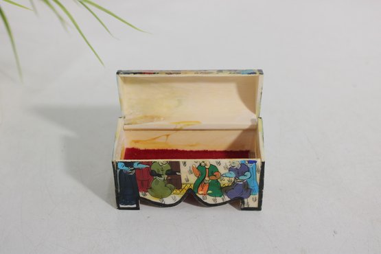 vintage miniature trinket box crafted in the traditional Kalamdan style, made from hand-painted bone and originating from India. This charming piece features finely detailed scenes influenced by Persian art, including figures in traditional attire set within a lush, decorative landscape.