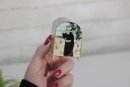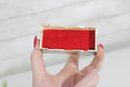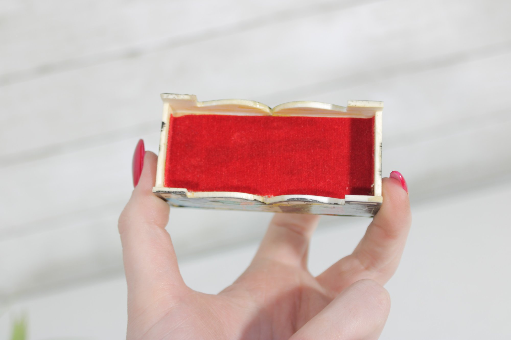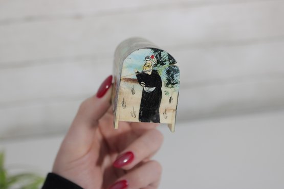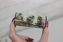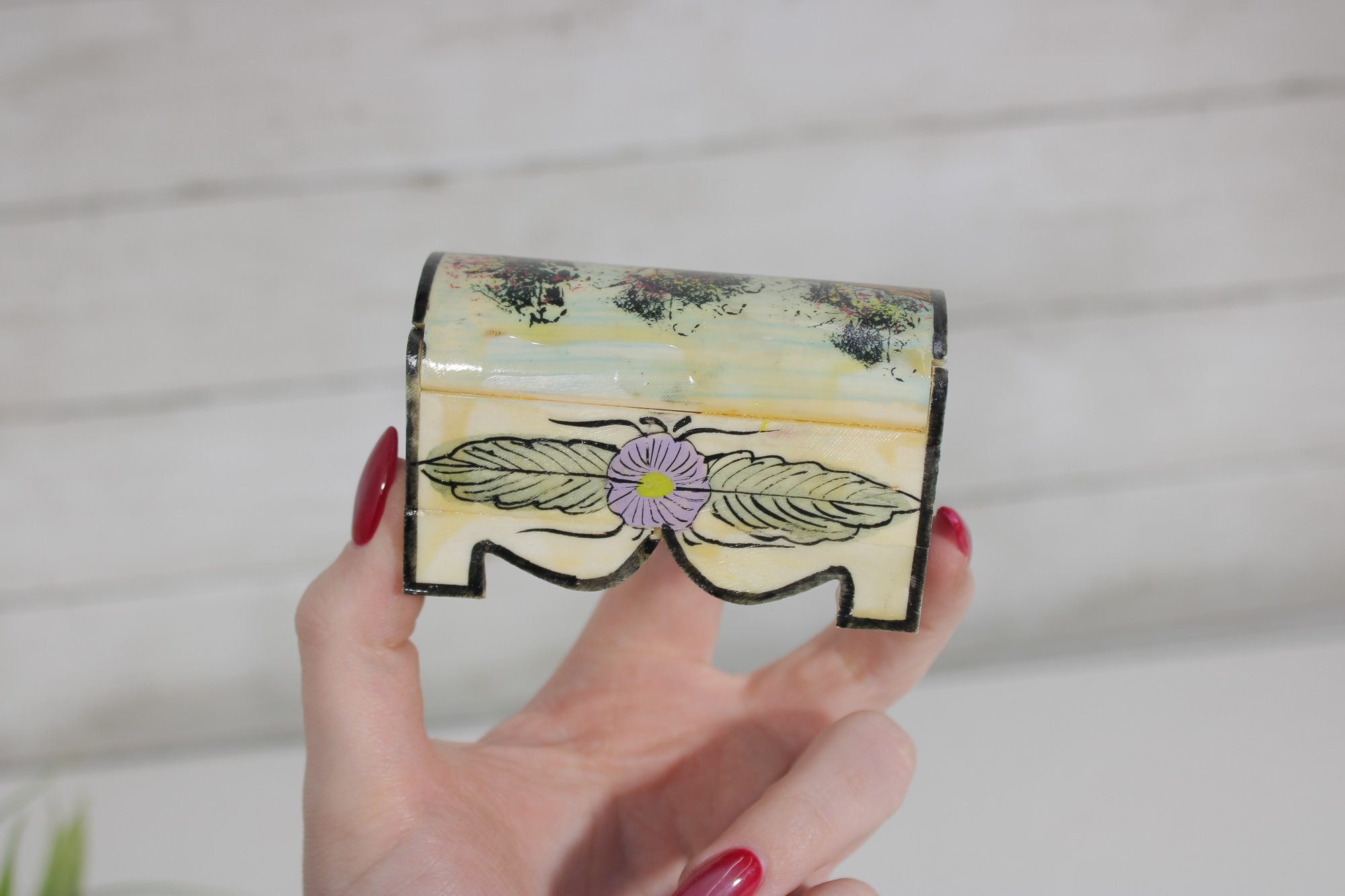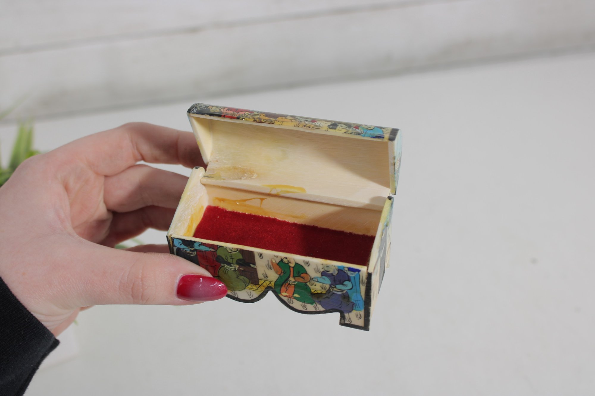 vintage miniature trinket box crafted in the traditional Kalamdan style, made from hand-painted bone and originating from India. This charming piece features finely detailed scenes influenced by Persian art, including figures in traditional attire set within a lush, decorative landscape.