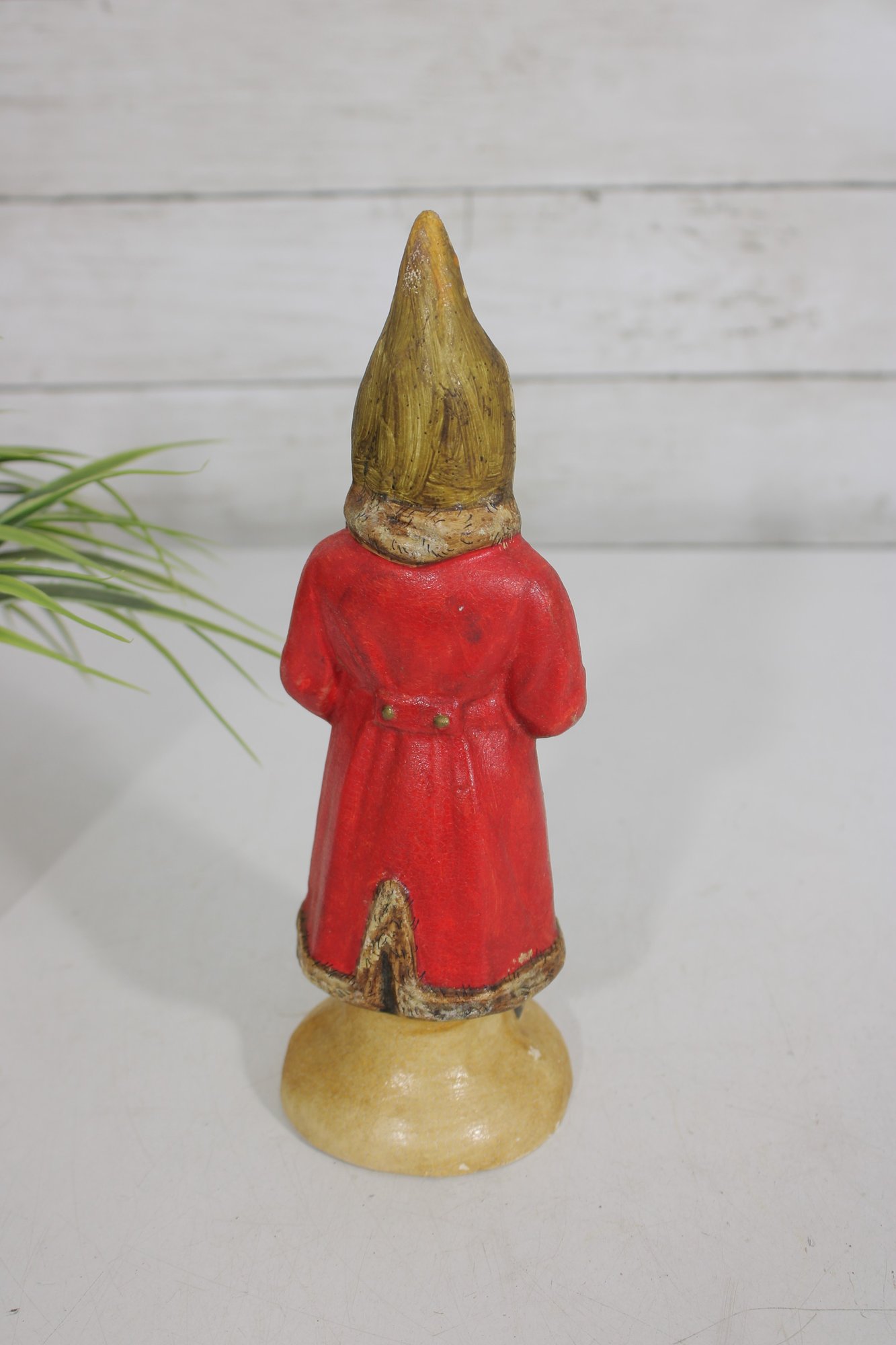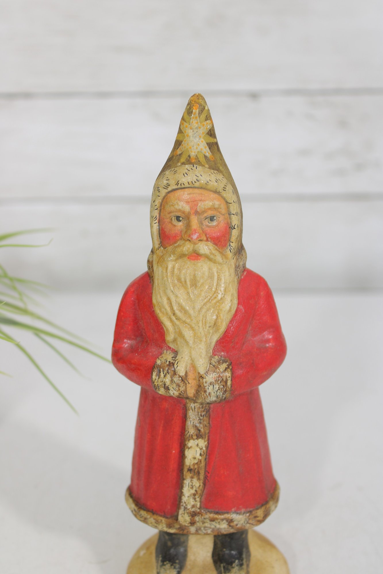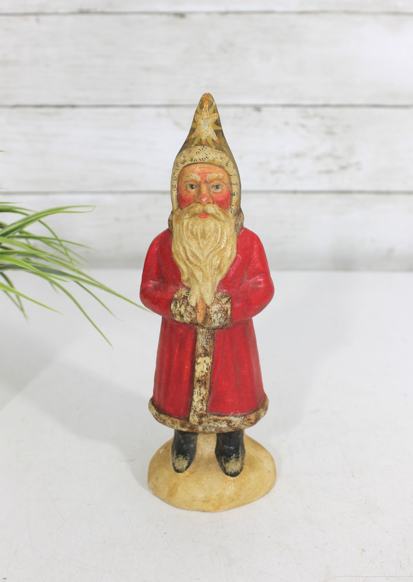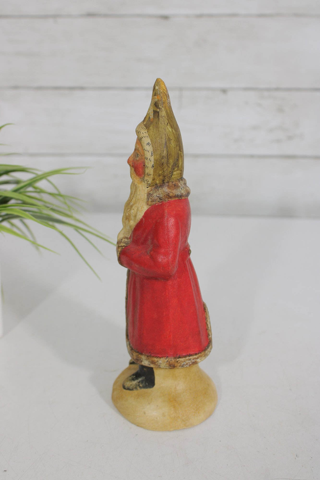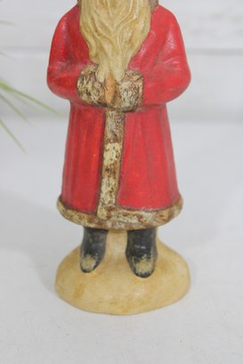 Bring nostalgic holiday charm to your décor with this vintage hand-painted Santa Claus figurine. Standing approximately 9 inches tall, this delightful piece features a classic Santa design with a long beard, red coat, and gold accents.
