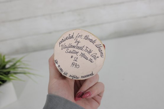 The underside is hand-inscribed, noting it was painted for a holiday event in 1990, adding a unique and personal touch that enhances its folk art appeal. The craftsmanship and hand-painted details give this piece warmth and character, making it a standout addition to any Christmas collection.