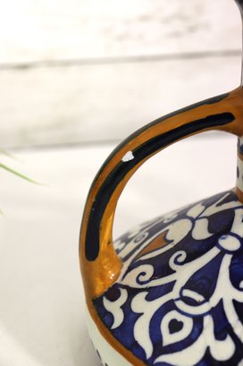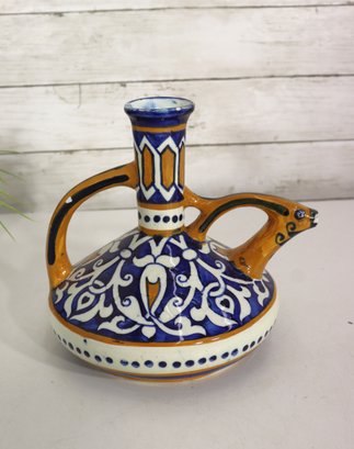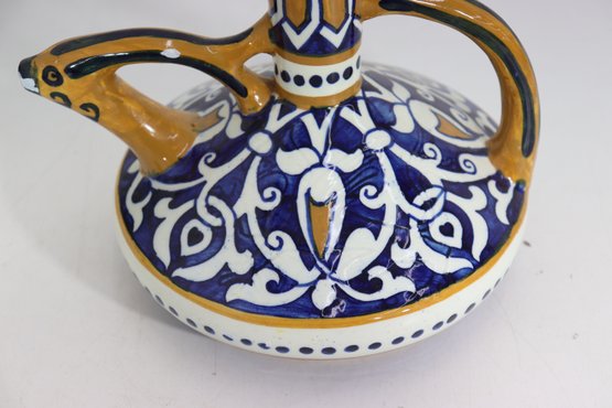 Charming vintage Majolica style ceramic pitcher / ewer featuring bold deep cobalt blue and mustard yellow glaze with intricate hand painted swirling floral décor. Unique sculpted animal head spout and matching formed handle create a wonderful folk art style look.