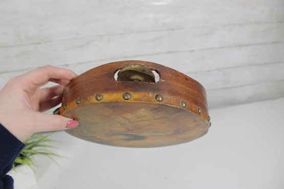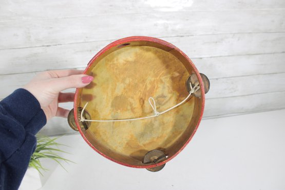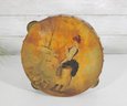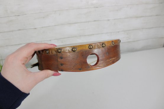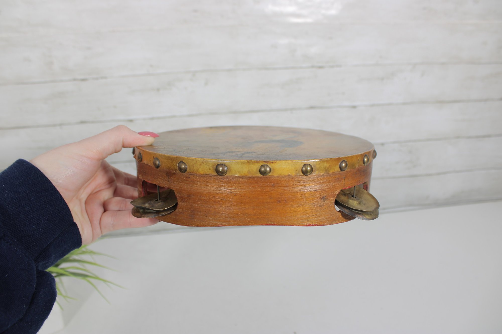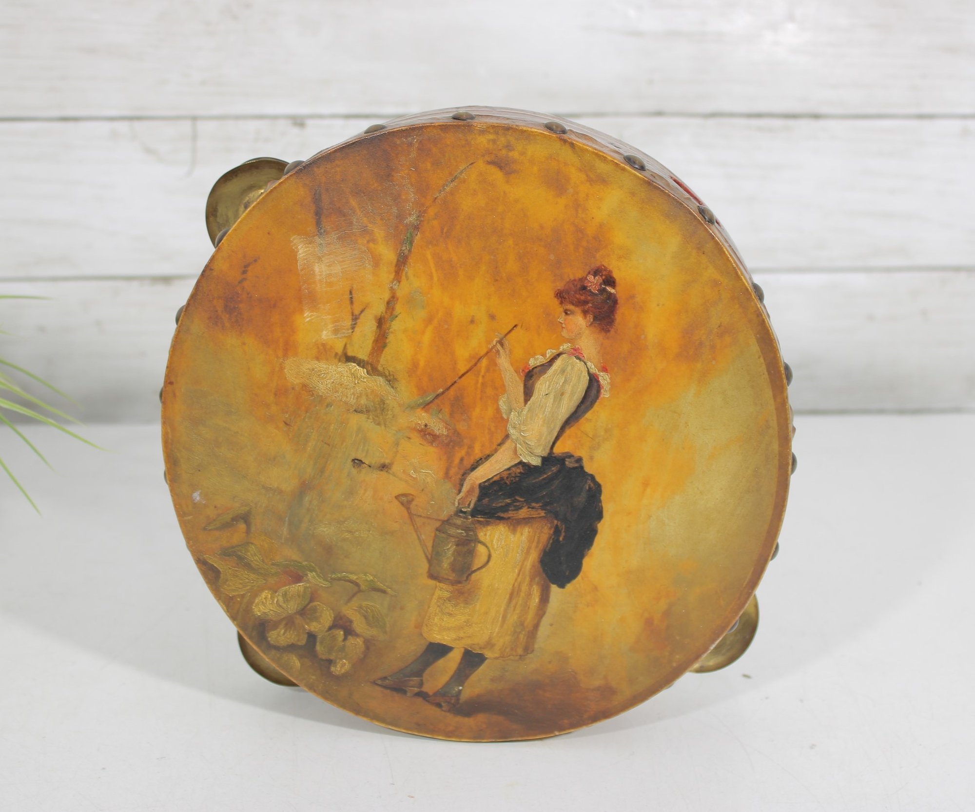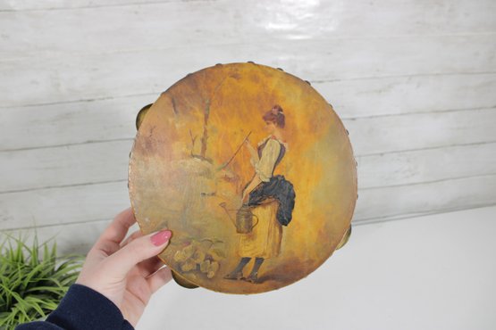 The tambourine is constructed with a wooden frame and metal jingles, and the side includes a handle for playing. With its detailed painted scene and aged patina, it makes a wonderful decorative wall piece, musical instrument collectible, or folk art display item.