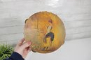 Vintage hand-painted tambourine featuring a charming scene of a young boy sitting outdoors with a small dog beside him. The artwork has a warm, rustic look with soft earthy tones that give the piece a decorative folk art feel.