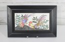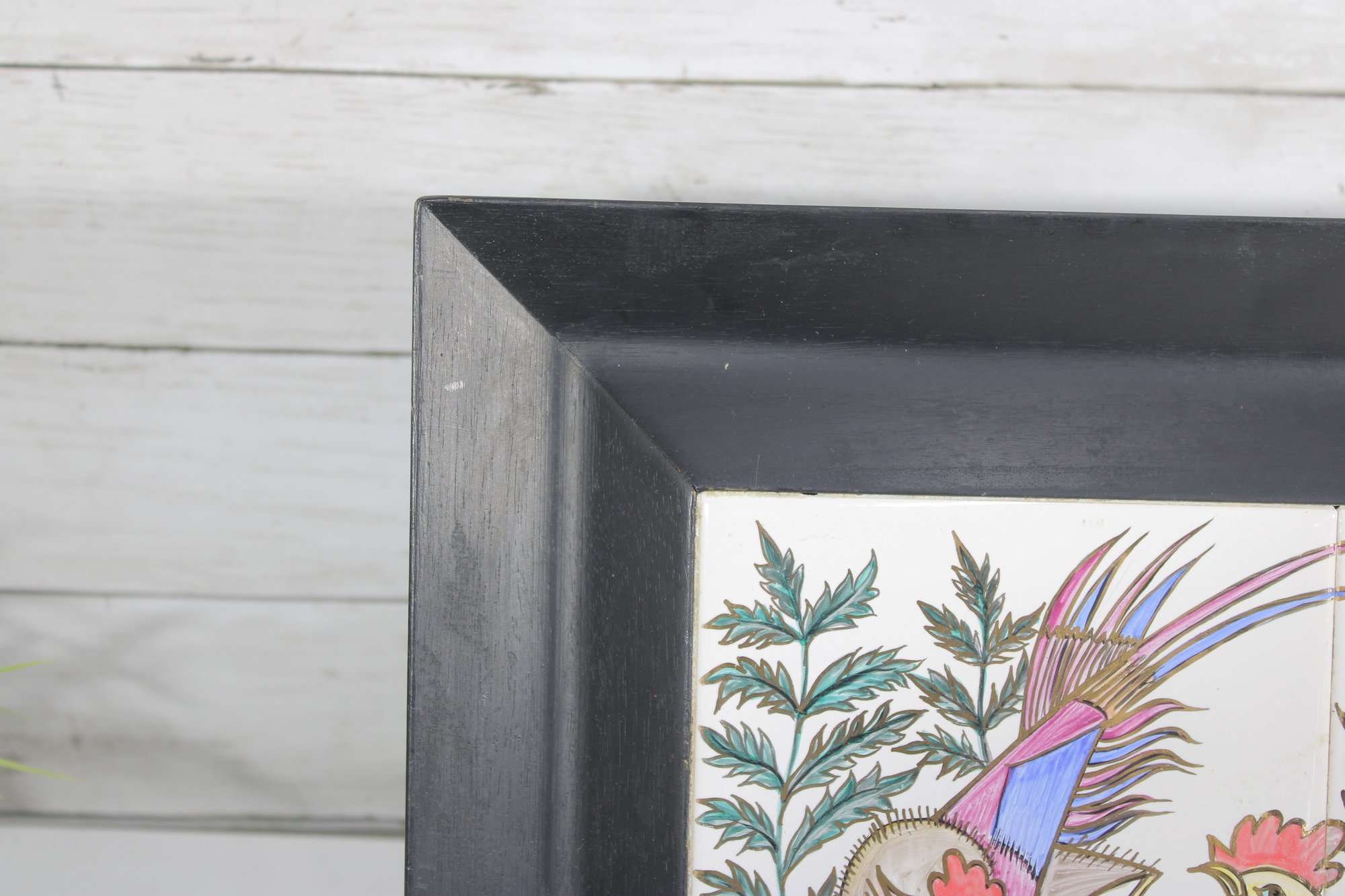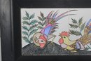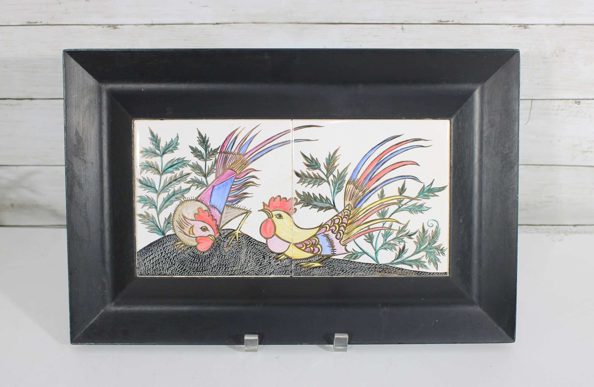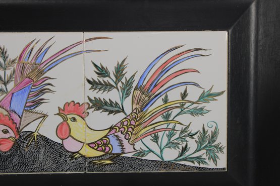 Charming vintage wall art featuring two hand-painted ceramic tiles depicting a colorful rooster and hen in a whimsical folk-art style. The vibrant feathers and detailed line work are set against leafy greenery, creating a lively and decorative composition.
