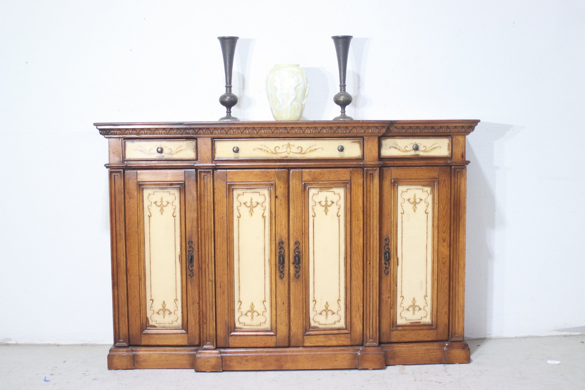 This stunning vintage sideboard buffet cabinet showcases exquisite craftsmanship, featuring hand-painted floral details on the drawer fronts and cabinet panels. The rich wood finish is beautifully accented by ornate carved trim and elegant detailing, making it a sophisticated statement piece.