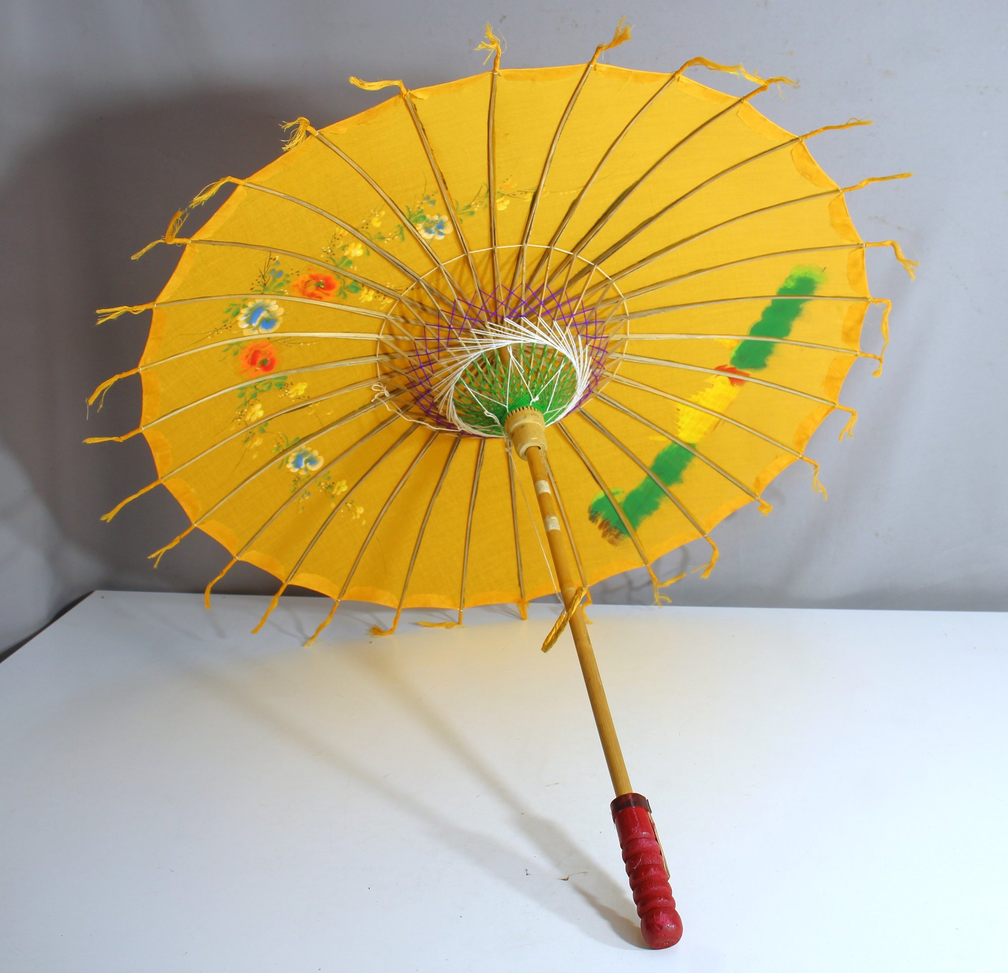 This beautiful vintage paper parasol features a vibrant yellow canopy adorned with hand-painted floral patterns and a serene scenic motif. Delicate brushstrokes depict colorful flowers and a tranquil landscape, capturing the elegance of traditional craftsmanship. The parasol has a sturdy bamboo handle with a carved red grip, though there is minor wear on the handle, adding to its antique charm. Ideal as a decorative piece or a unique gift, this parasol brings an exotic and artistic touch to any setting.