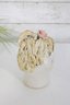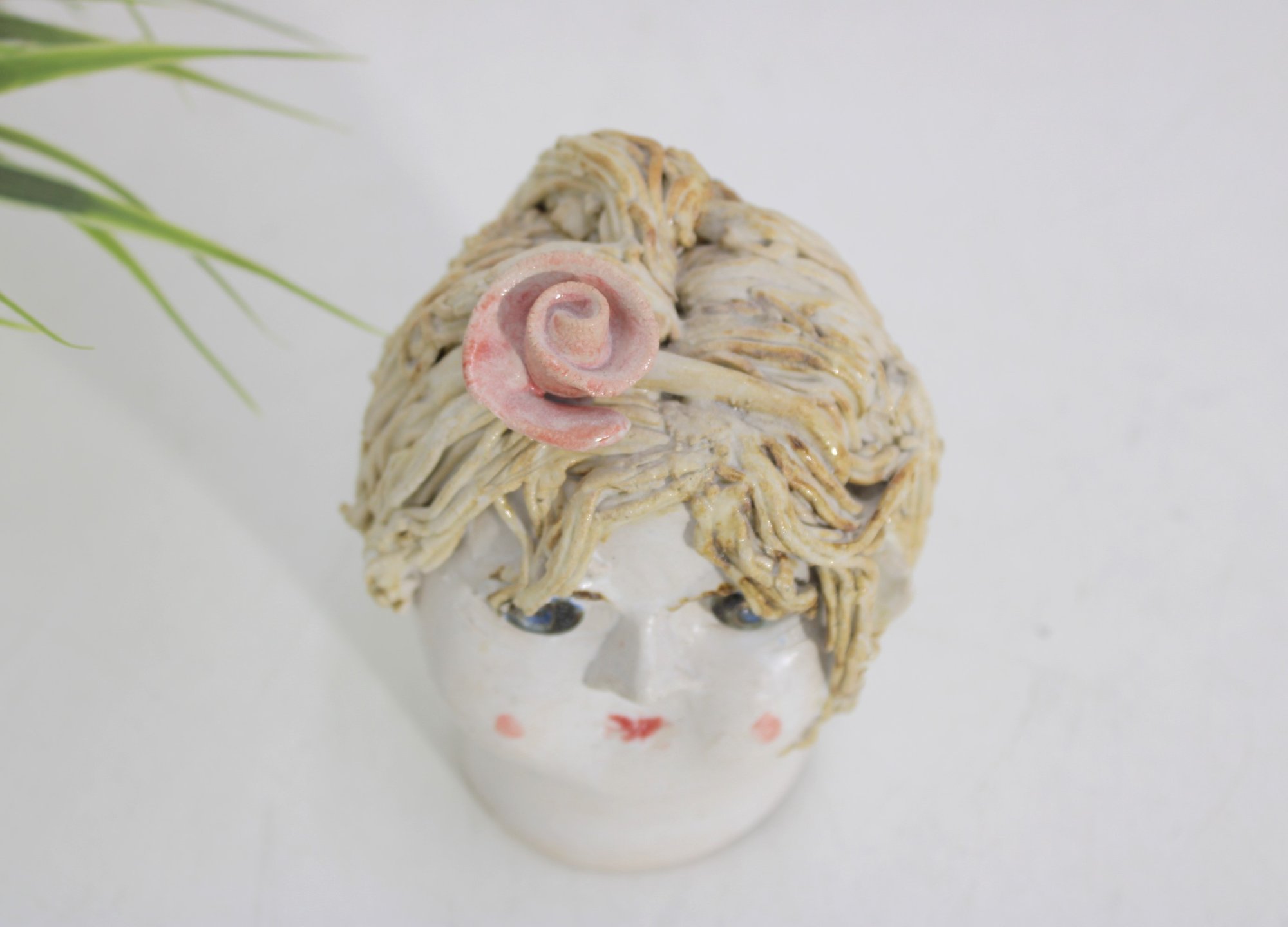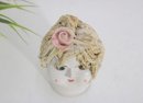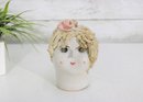 Charming vintage ceramic lady head vase measuring approximately 6 inches high. This delightful piece features a hand-painted face with soft rosy cheeks and expressive eyes, topped with textured applied blonde hair and a pink rose accent.