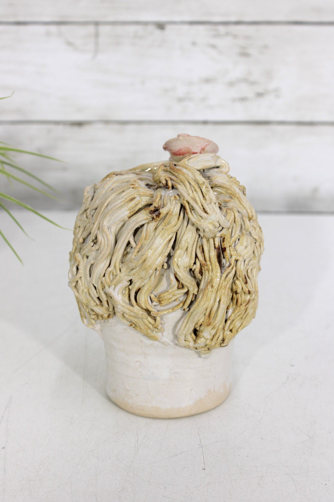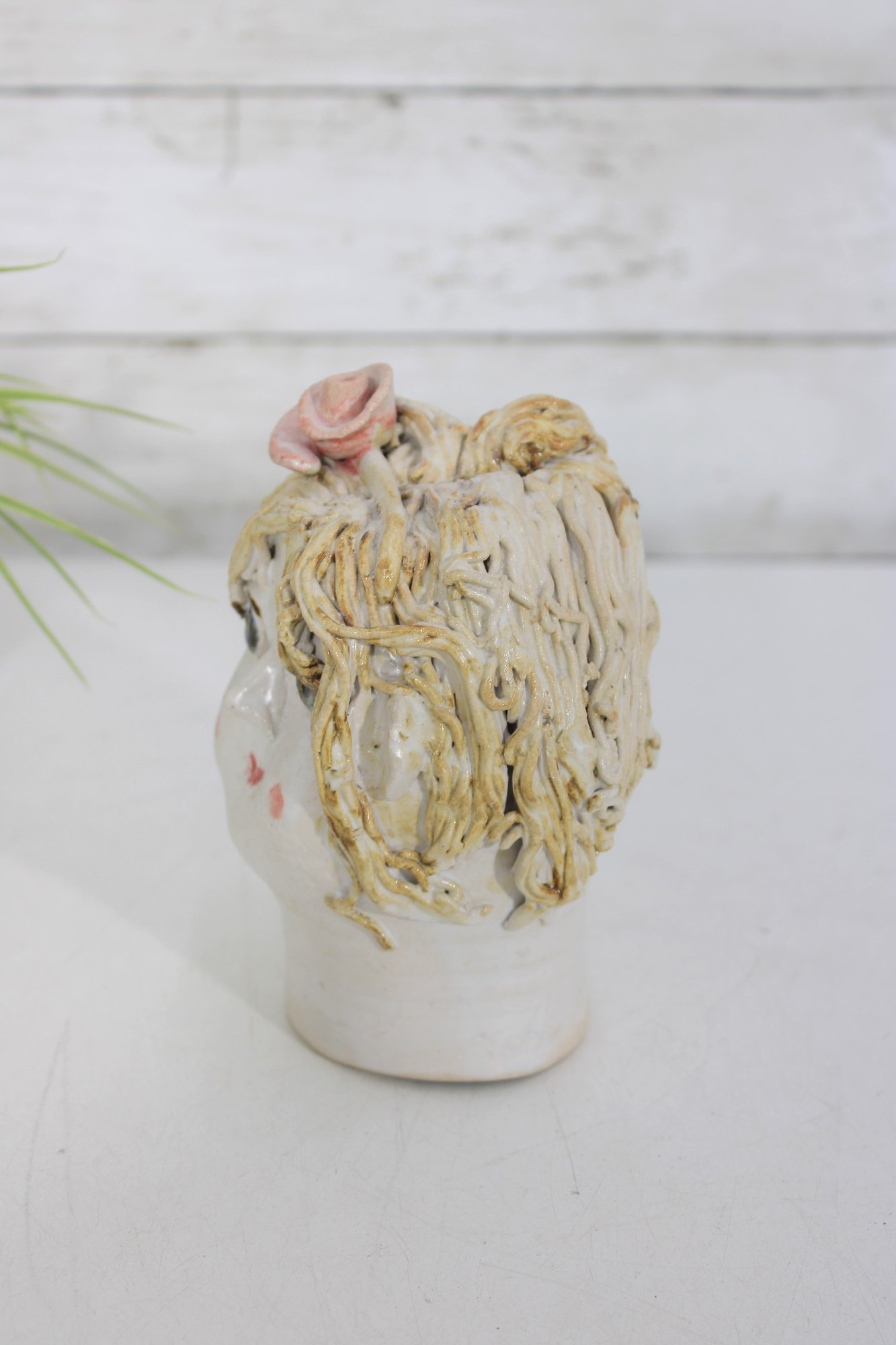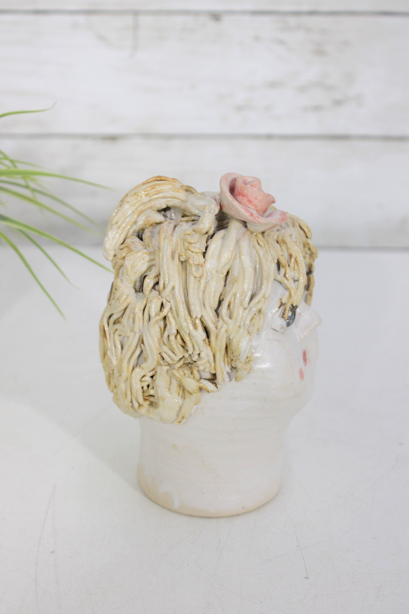 The sculpted hair detailing adds wonderful dimension and character, making this a standout decorative piece. The open top allows it to be used as a small vase, planter, or simply as a collectible display item.