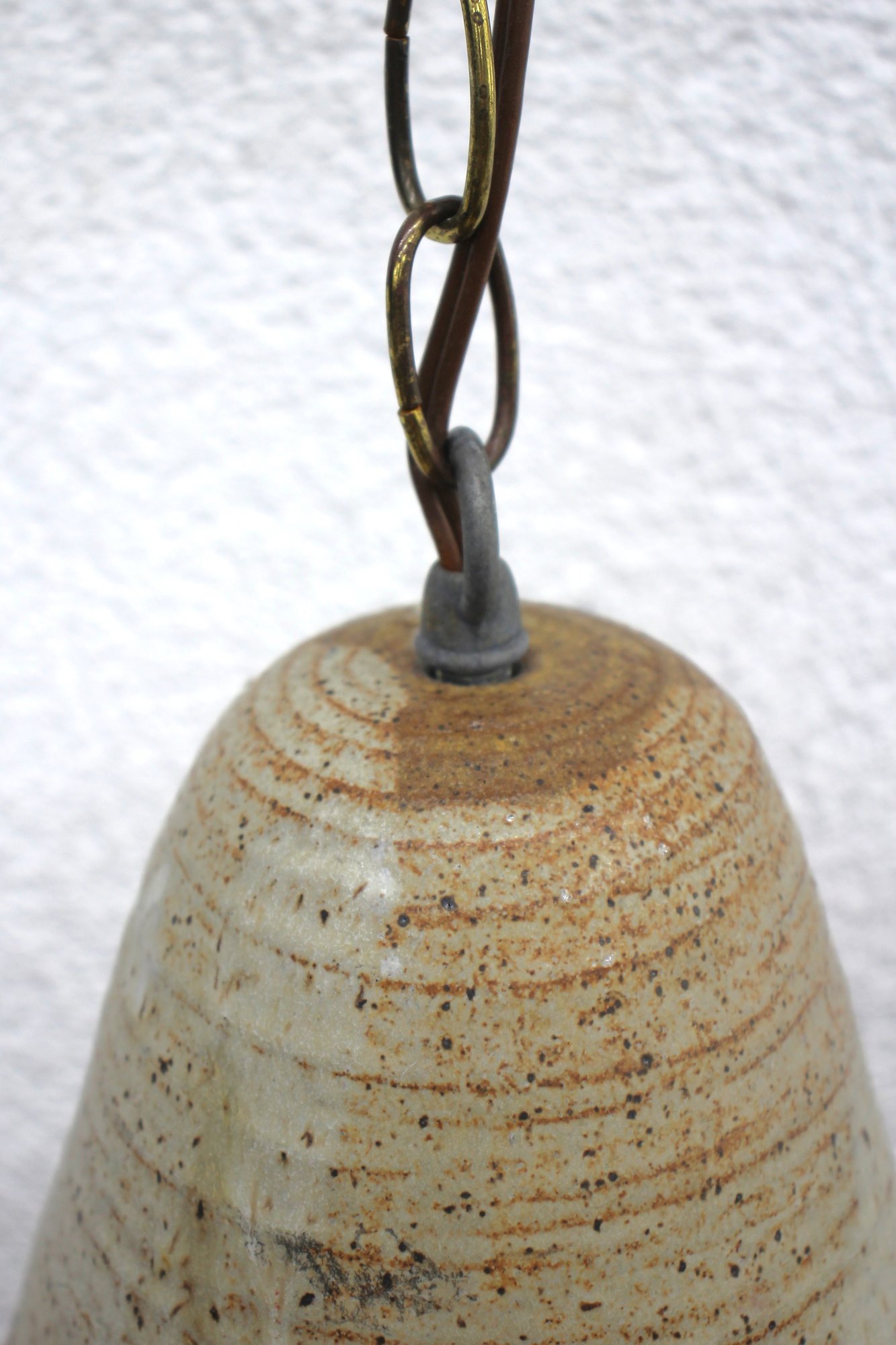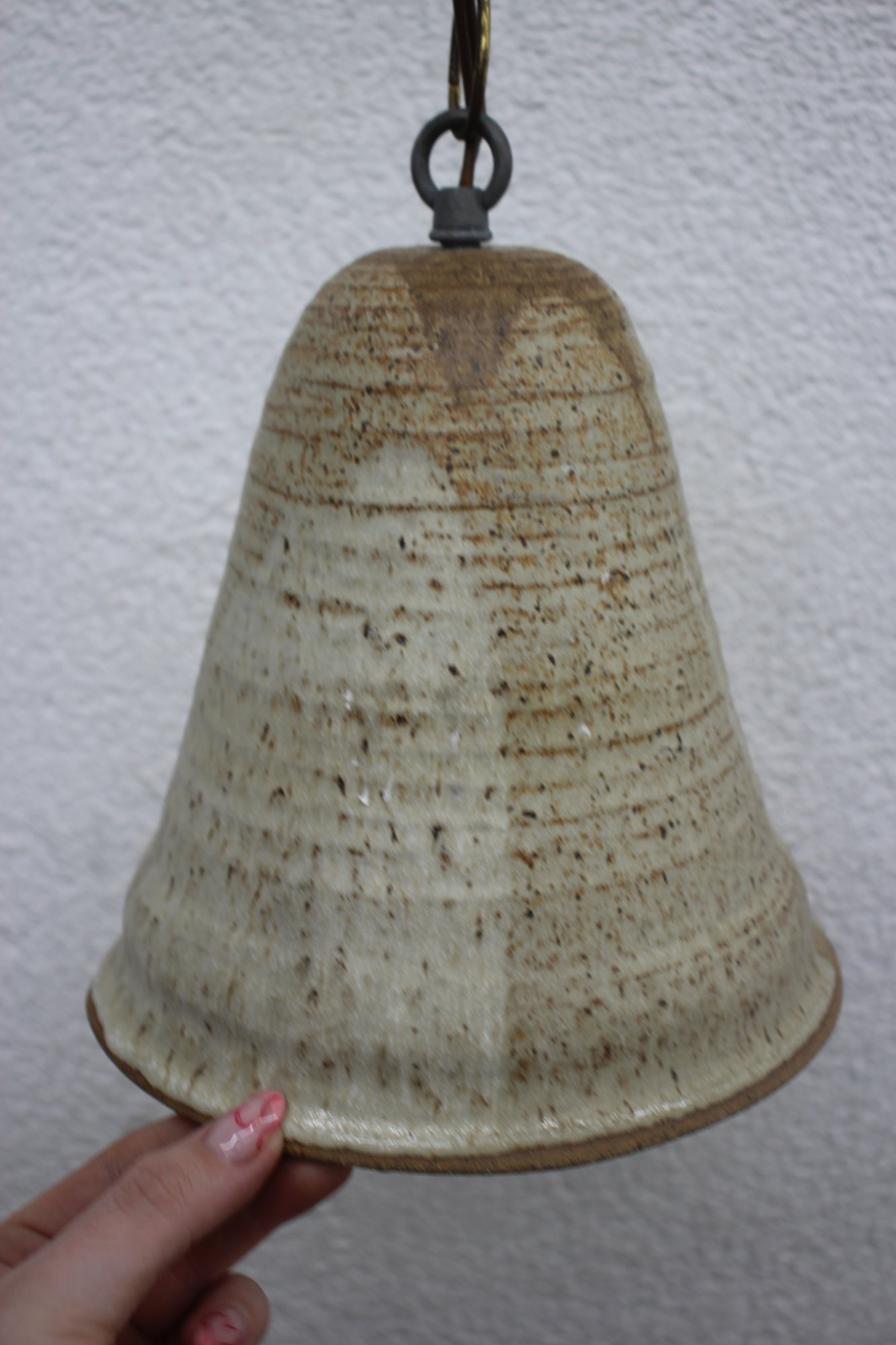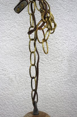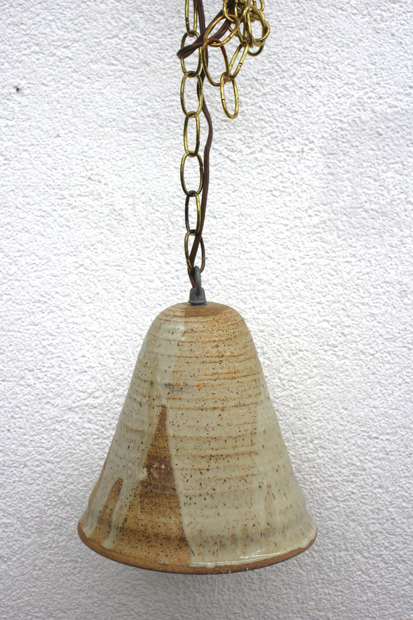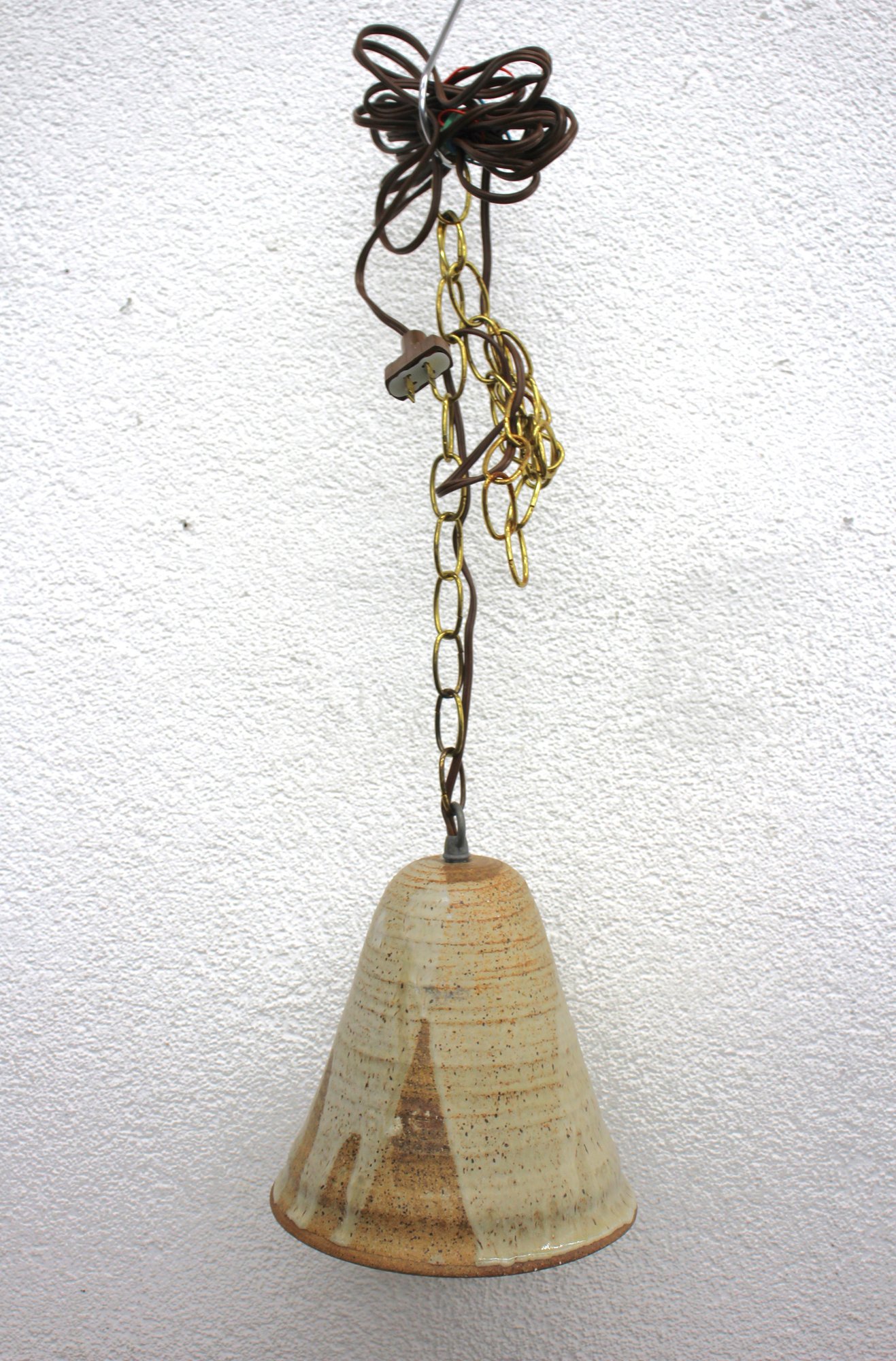Suspended from a vintage chain and cord, this pendant light brings a warm, artisanal feel to any space, making it a perfect addition to bohemian, farmhouse, or mid-century modern decor. It retains its original wiring, but may require updating for modern use.