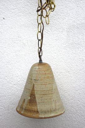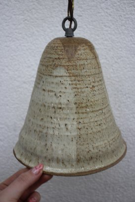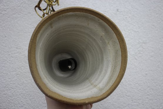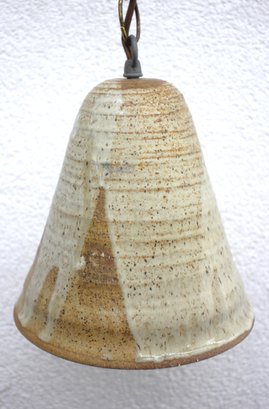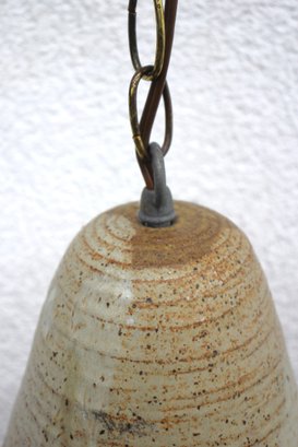 This unique hand-thrown ceramic pendant light features an earthy speckled glaze in soft beige and brown tones, giving it a rustic, organic aesthetic. The cone-shaped ceramic shade, measuring 8 inches high, showcases subtle texture and natural variations in glaze, enhancing its handcrafted charm.