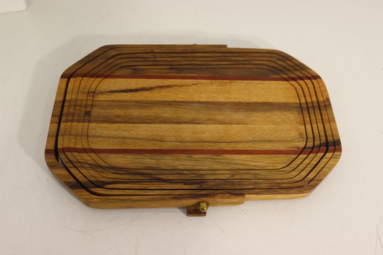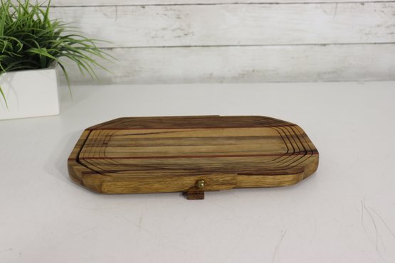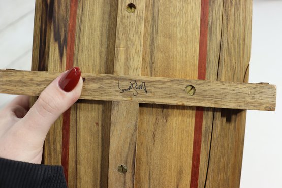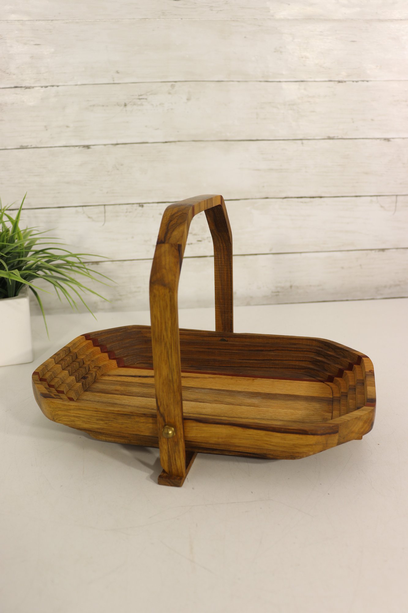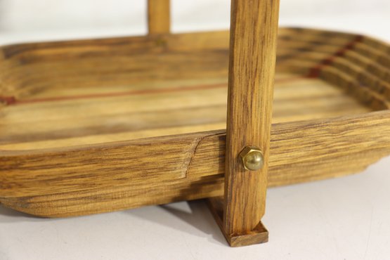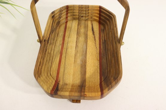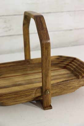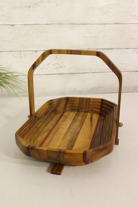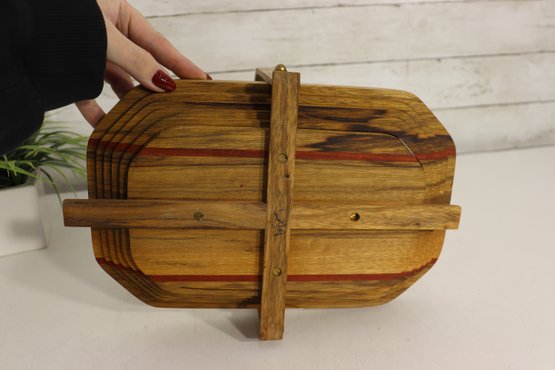 Vintage handmade wood basket / tray with hinged folding handle. Beautiful layered wood design with mixed wood strip pattern including darker and reddish tone accent strips. Signed underneath by maker (see photo). Great primitive craft / folk art look.