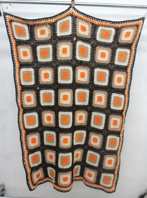vintage charm to your home with this beautiful handmade crochet granny square afghan blanket! Measuring 62” x 40”, this cozy throw features a classic mid-century color palette of brown, orange, cream, and beige, arranged in an eye-catching granny square pattern.