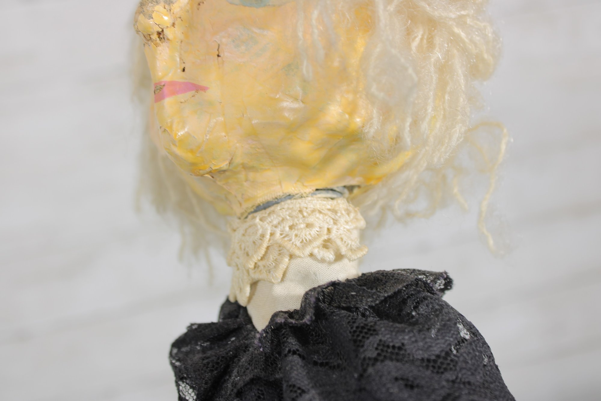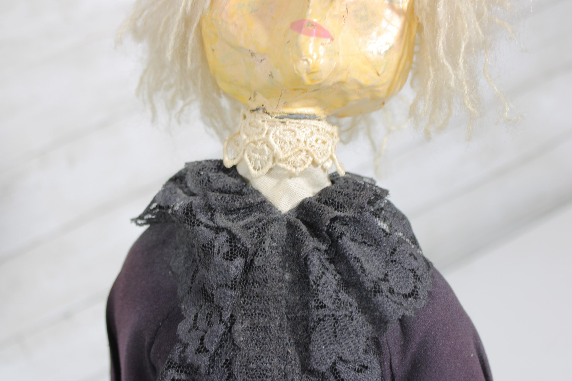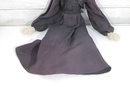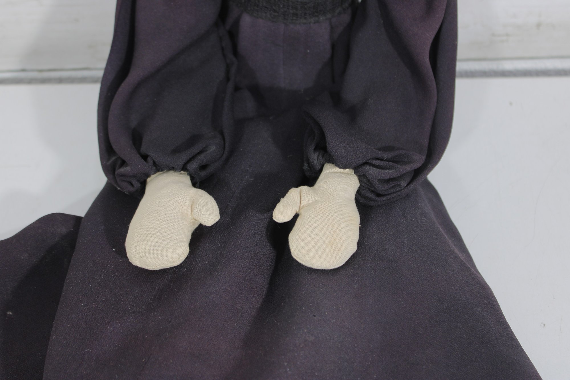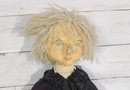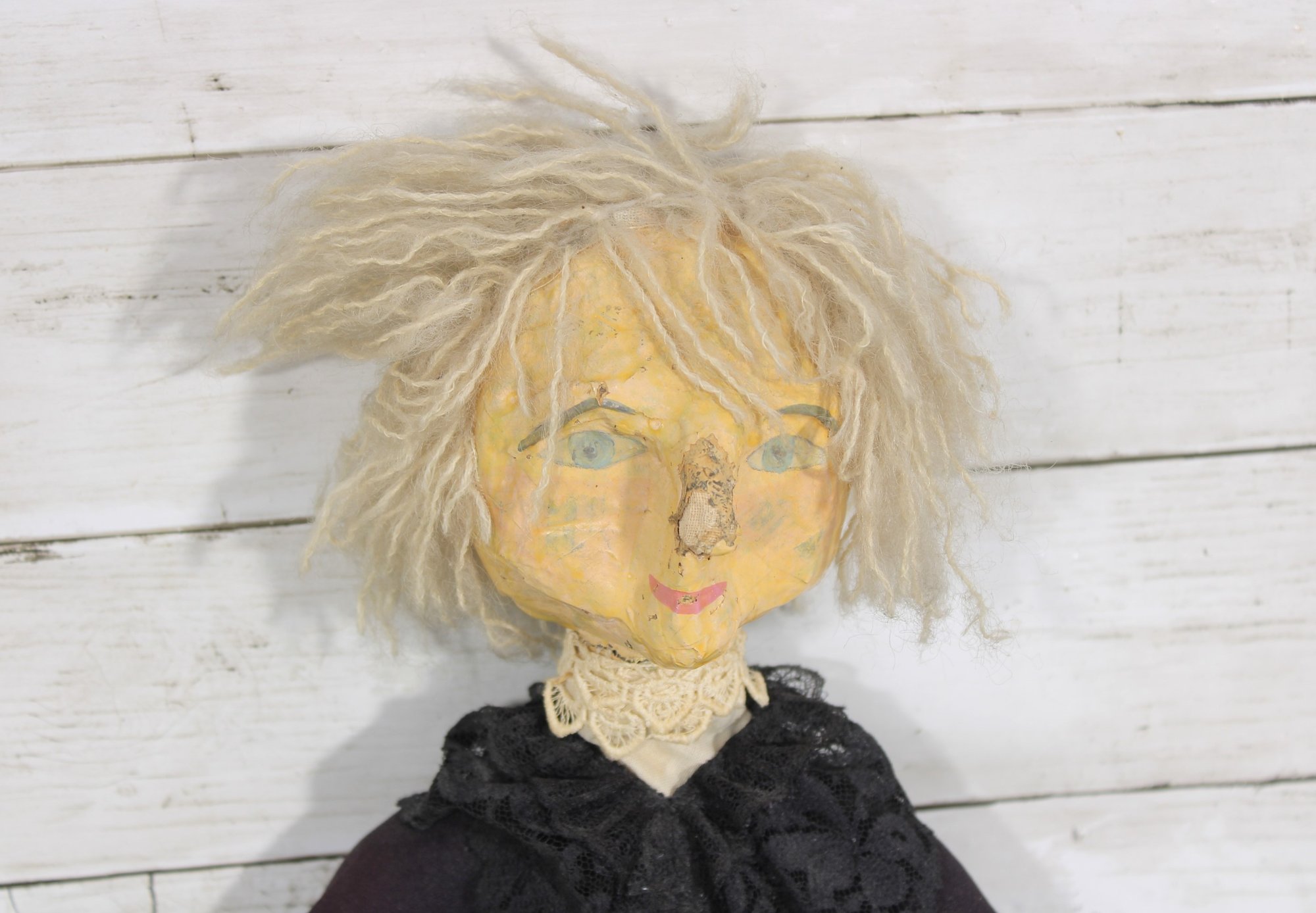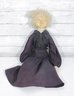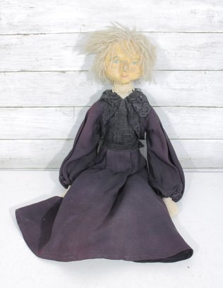 Charming vintage handmade folk art cloth doll featuring a primitive, rustic design and expressive hand-painted facial features. The doll has yarn hair, a fabric head and body, and a long dark dress with lace collar and decorative trim, giving it a wonderful handmade character.