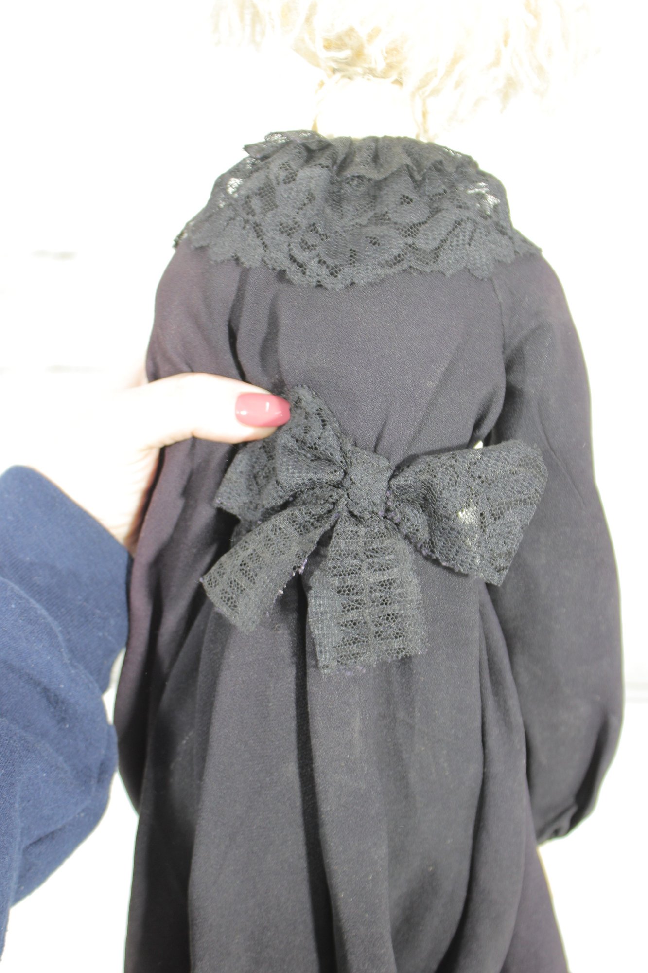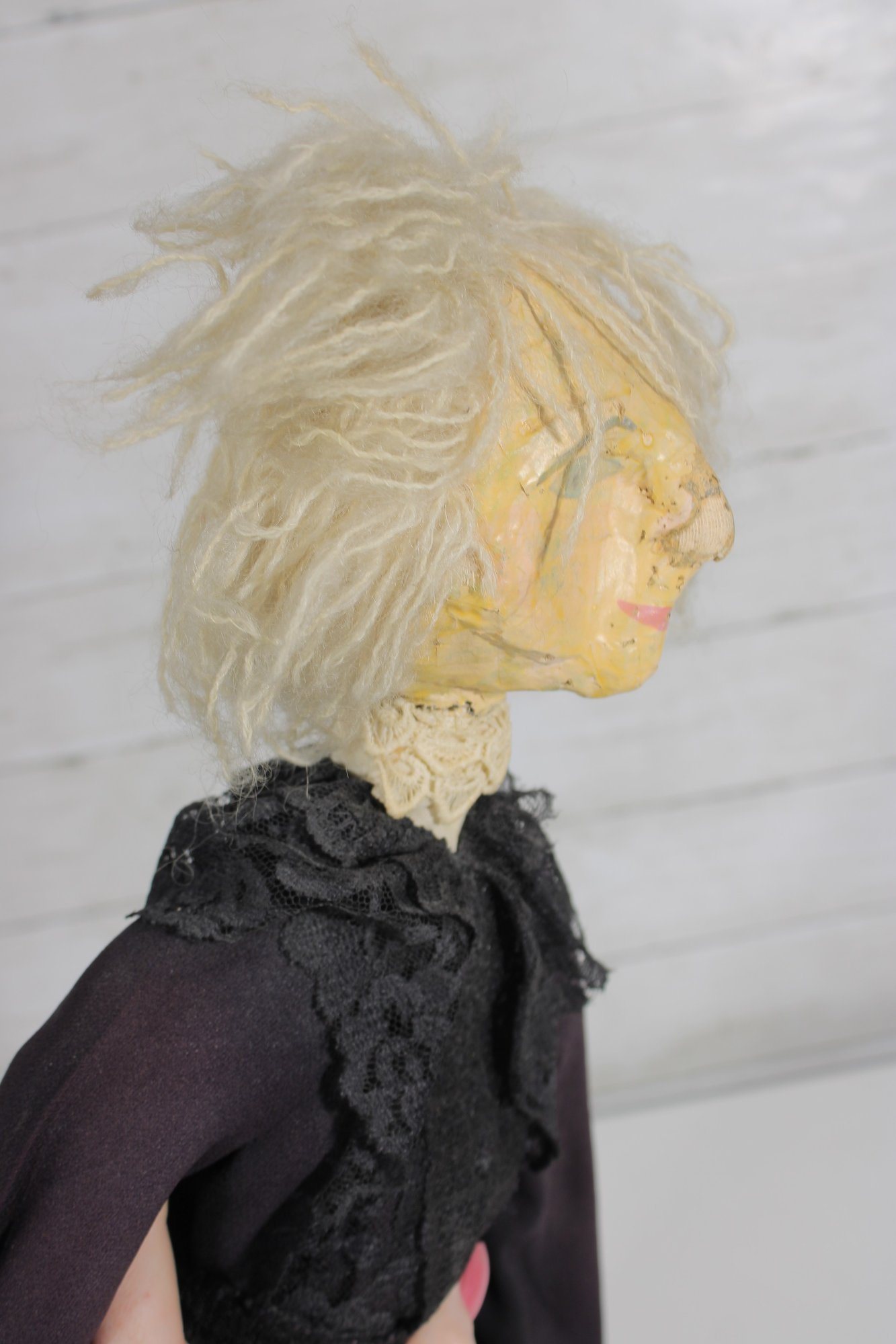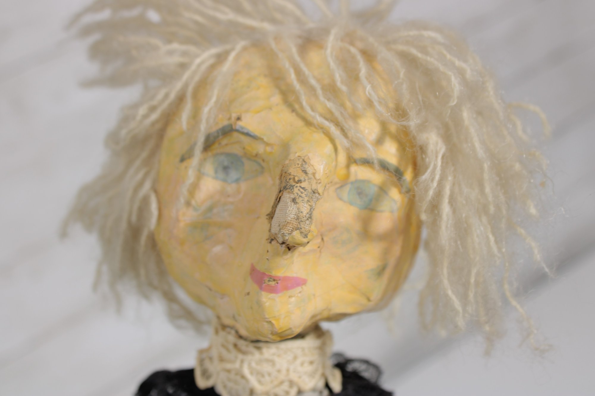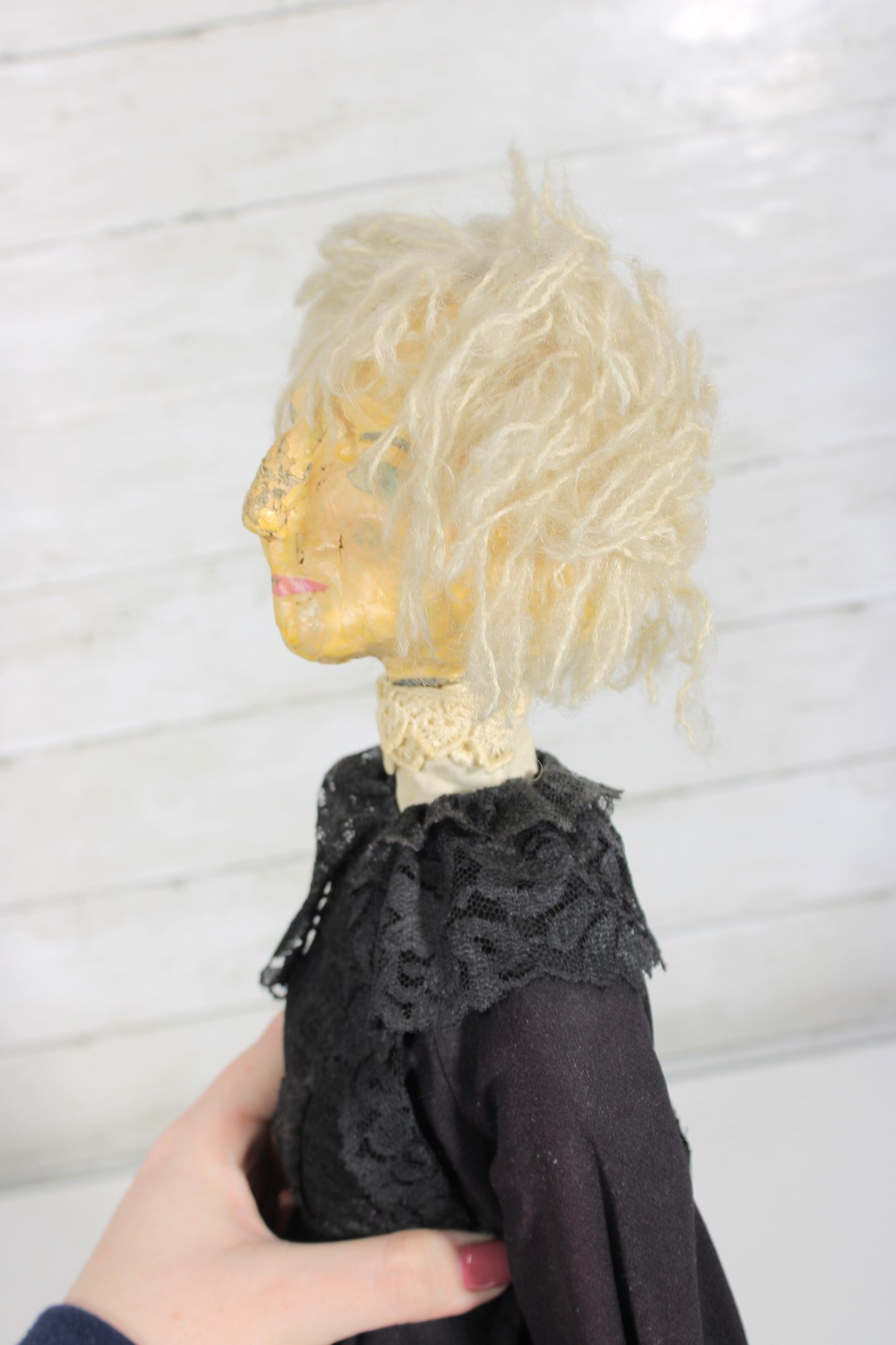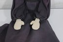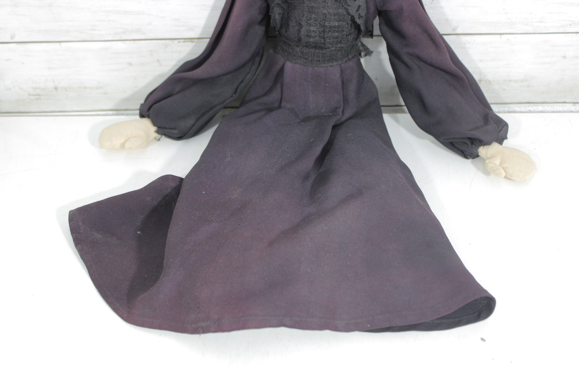 Charming vintage handmade folk art cloth doll featuring a primitive, rustic design and expressive hand-painted facial features. The doll has yarn hair, a fabric head and body, and a long dark dress with lace collar and decorative trim, giving it a wonderful handmade character.