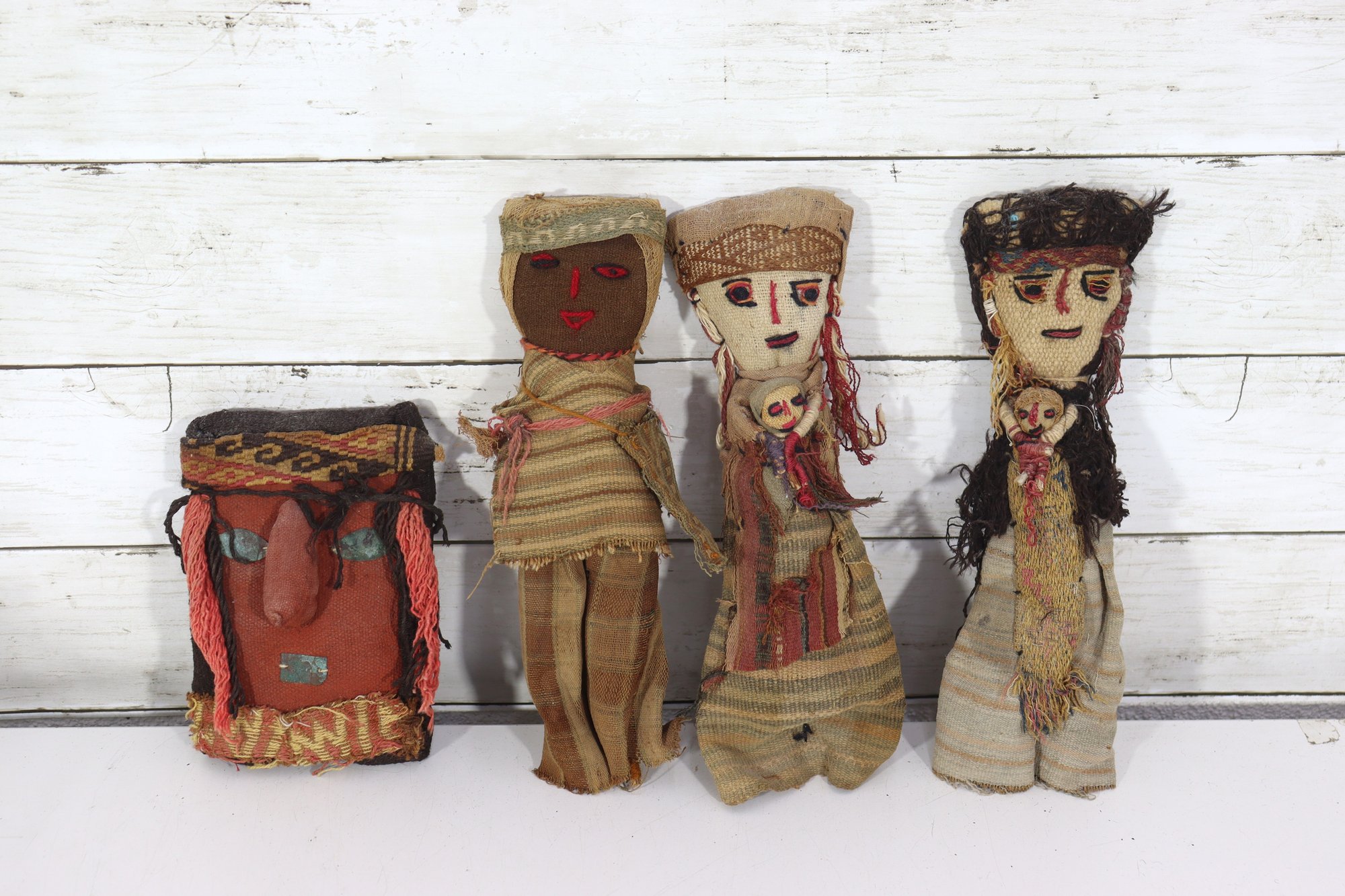 Charming vintage handmade folk art doll collection, featuring four cloth dolls and one matching textile pouch. Each piece is crafted from layered fabrics with stitched facial features, yarn hair, and rustic detailing, giving them wonderful character and primitive charm.