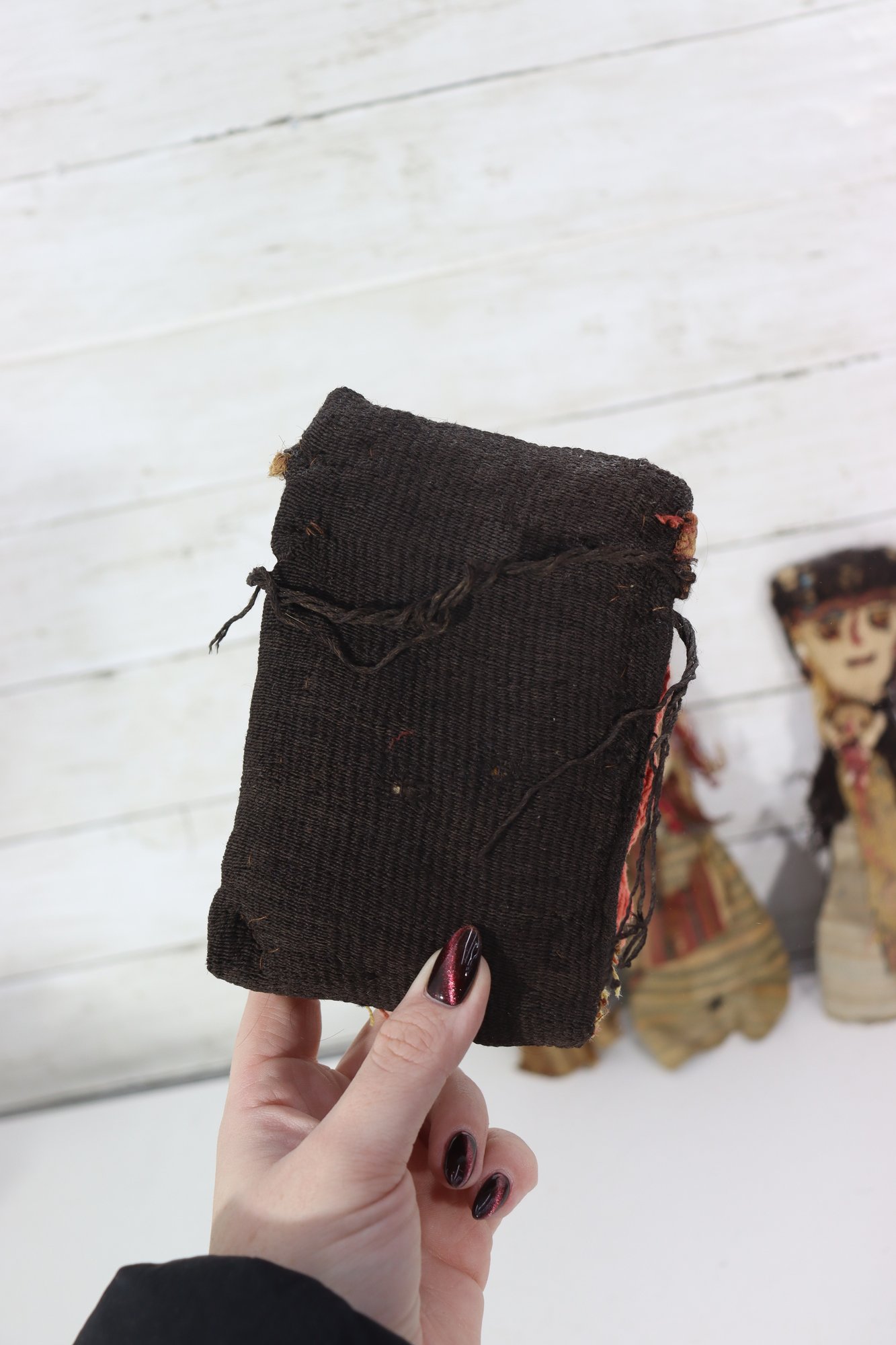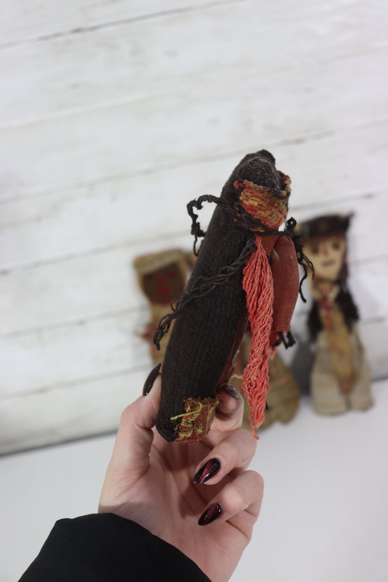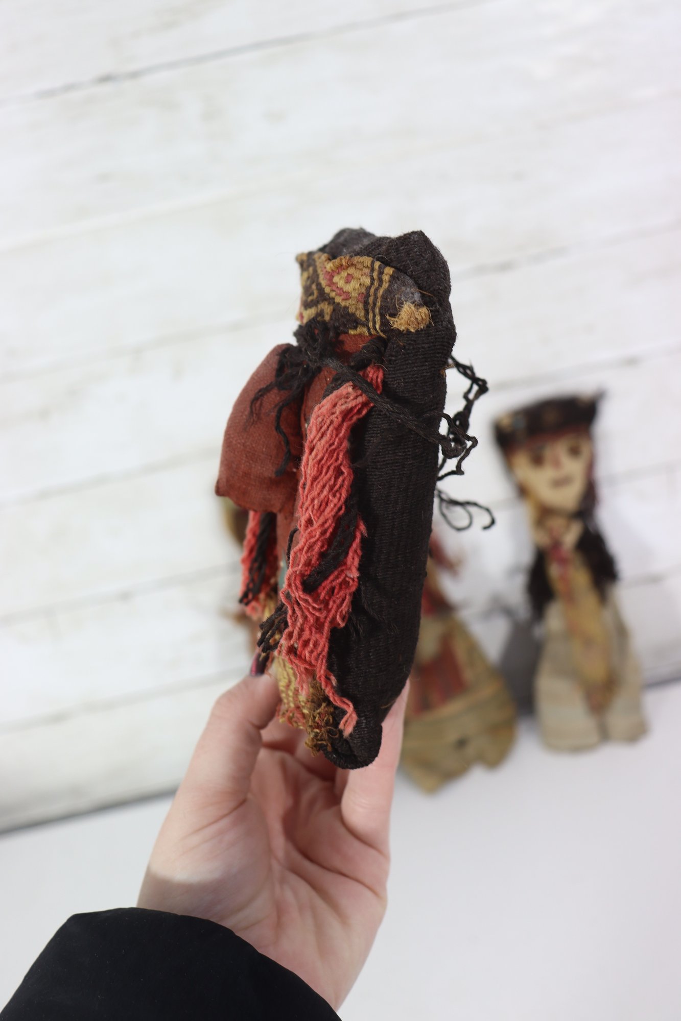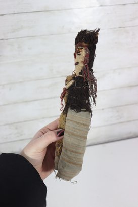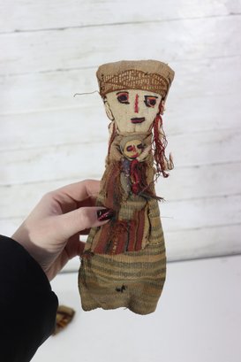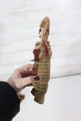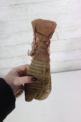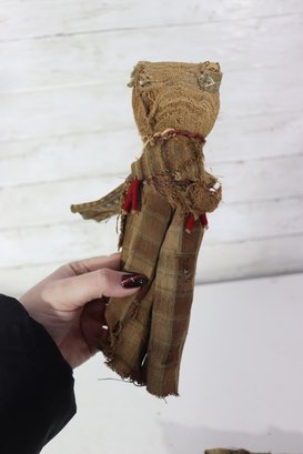 These figures appear to be artisan-made, possibly representing traditional or cultural folk dolls. Their imperfect stitching, hand-dyed fabrics, and aged textiles add to their authentic handmade appeal. A wonderful addition for collectors of folk art, primitive décor, or textile art.
