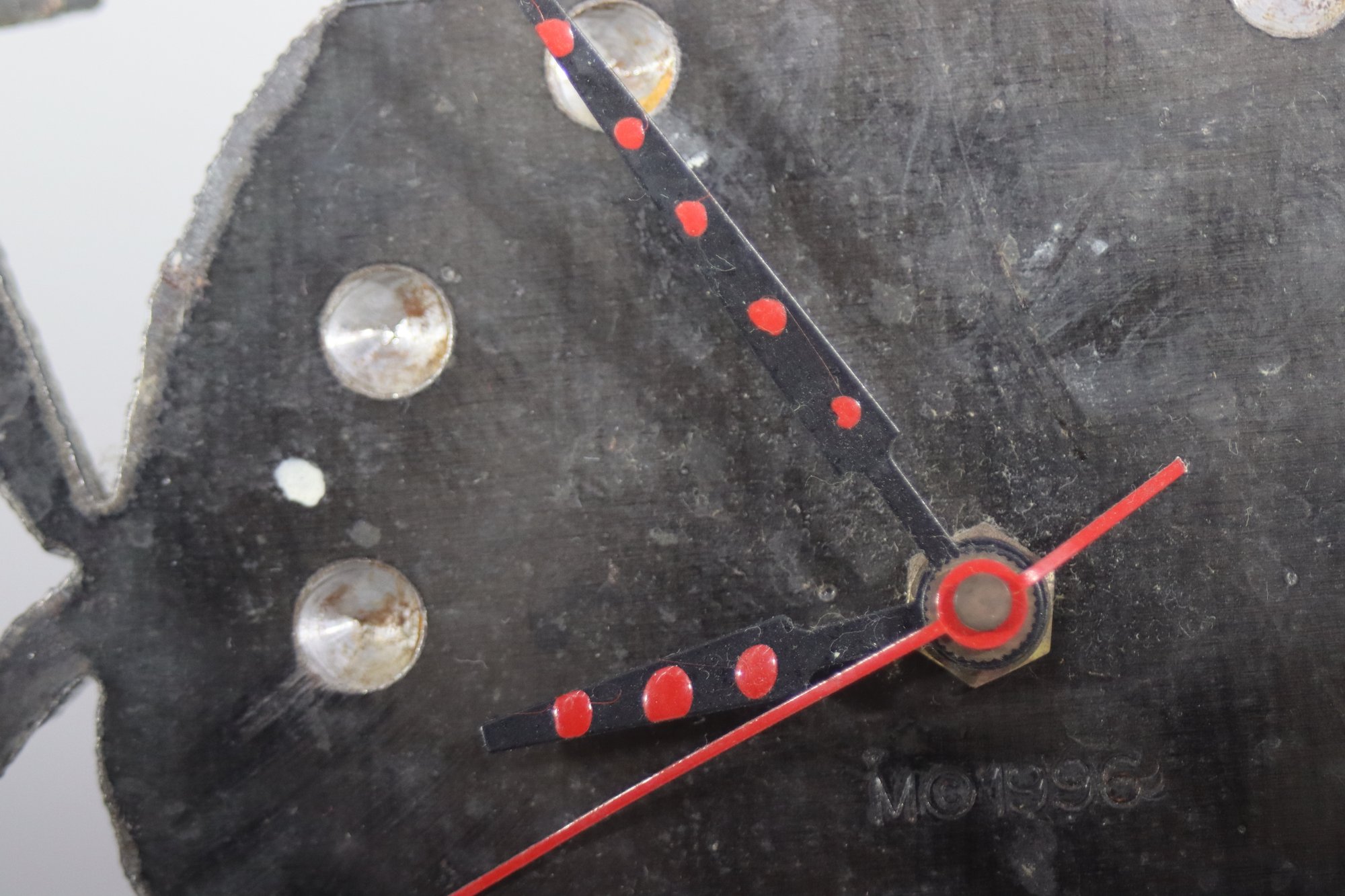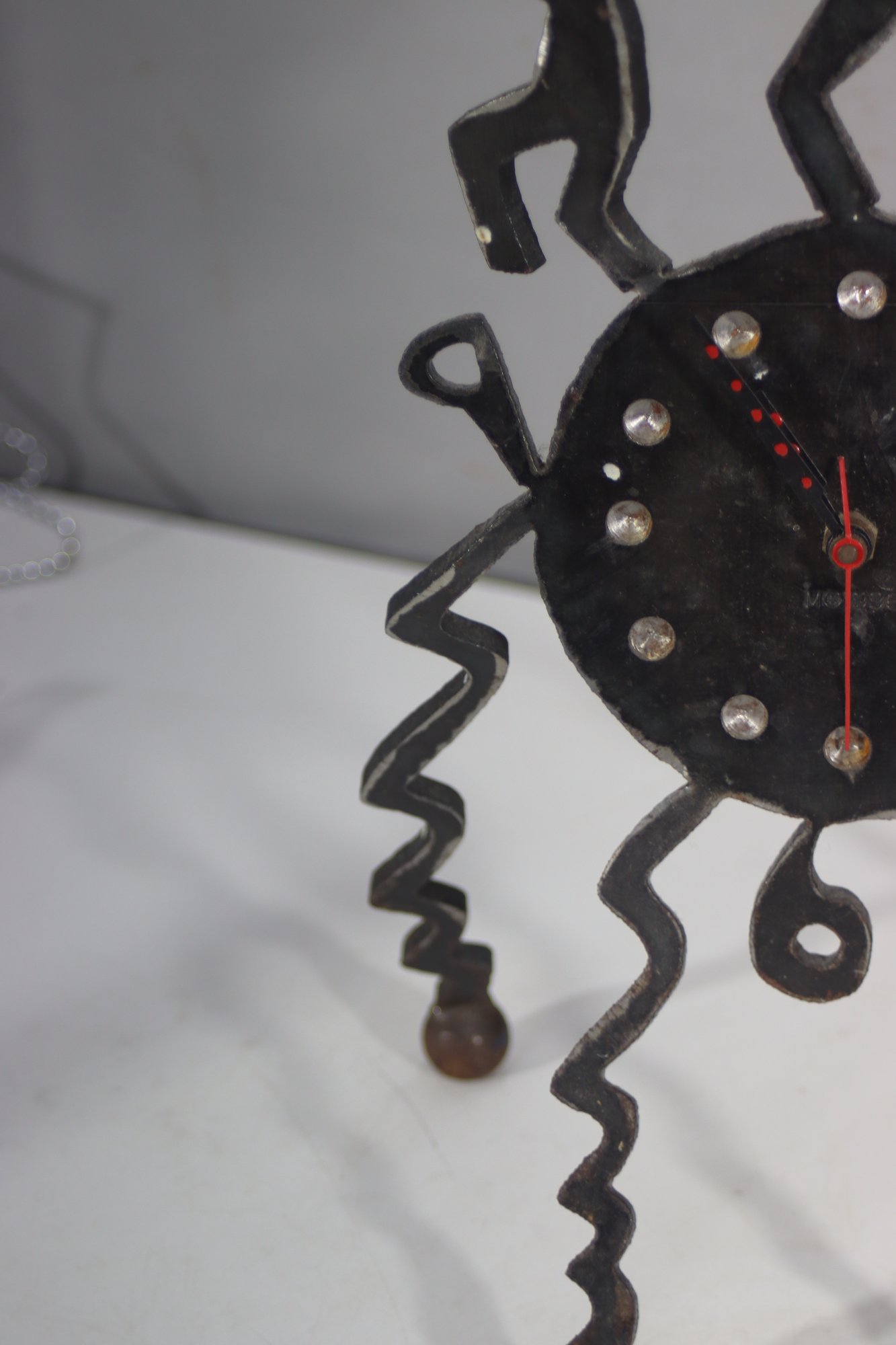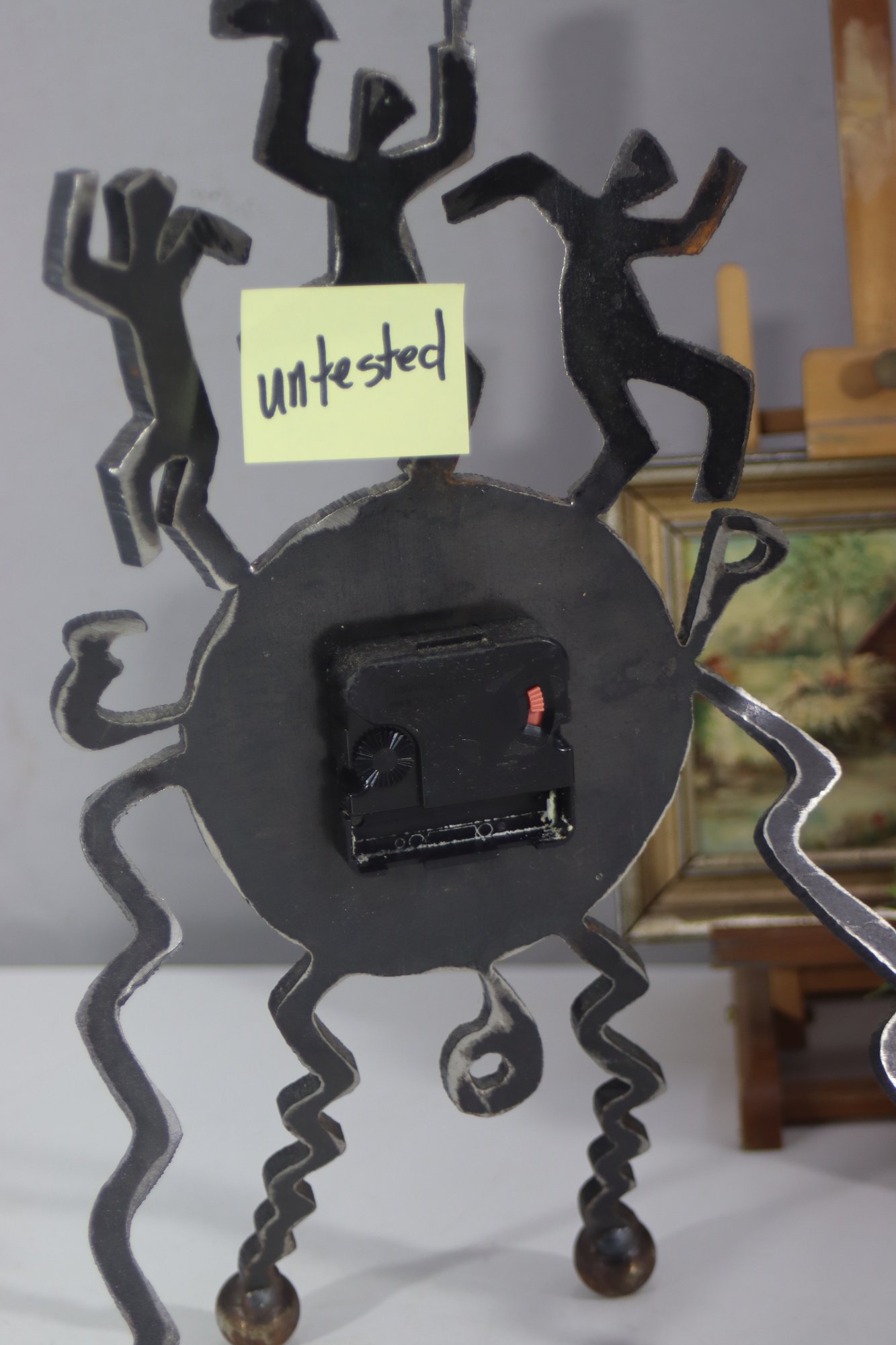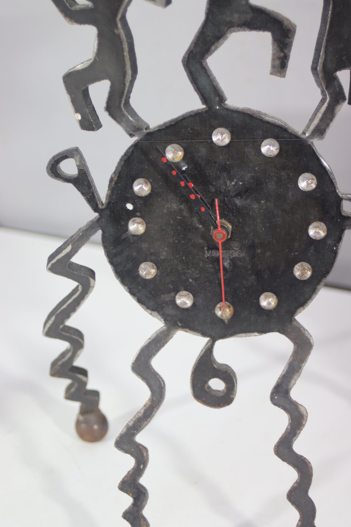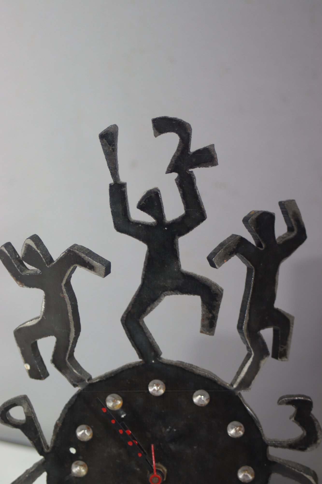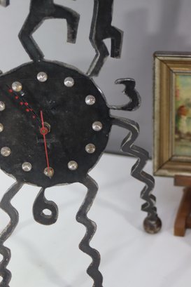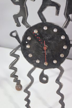 This one-of-a-kind vintage handmade metal art clock features an eye-catching folk art design with dancing figures, spiral legs, and a unique rustic aesthetic. A statement piece that blends art and function, making it perfect for collectors or those looking for an eclectic décor piece.
