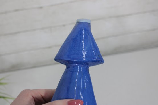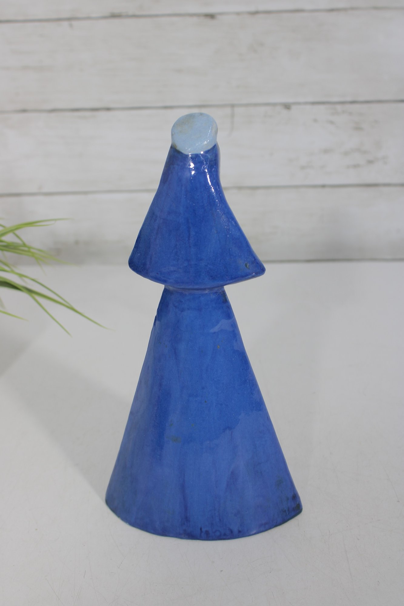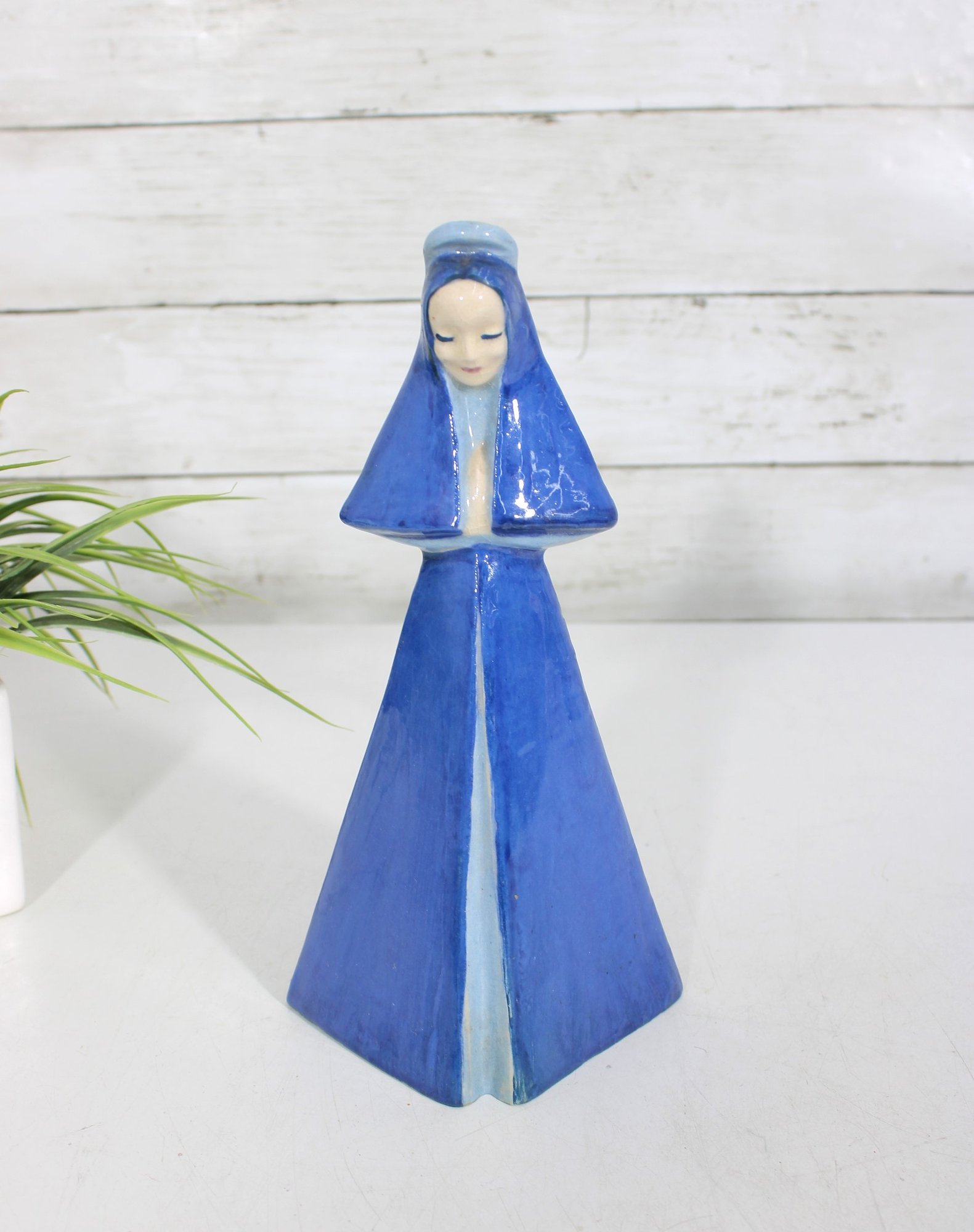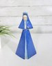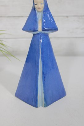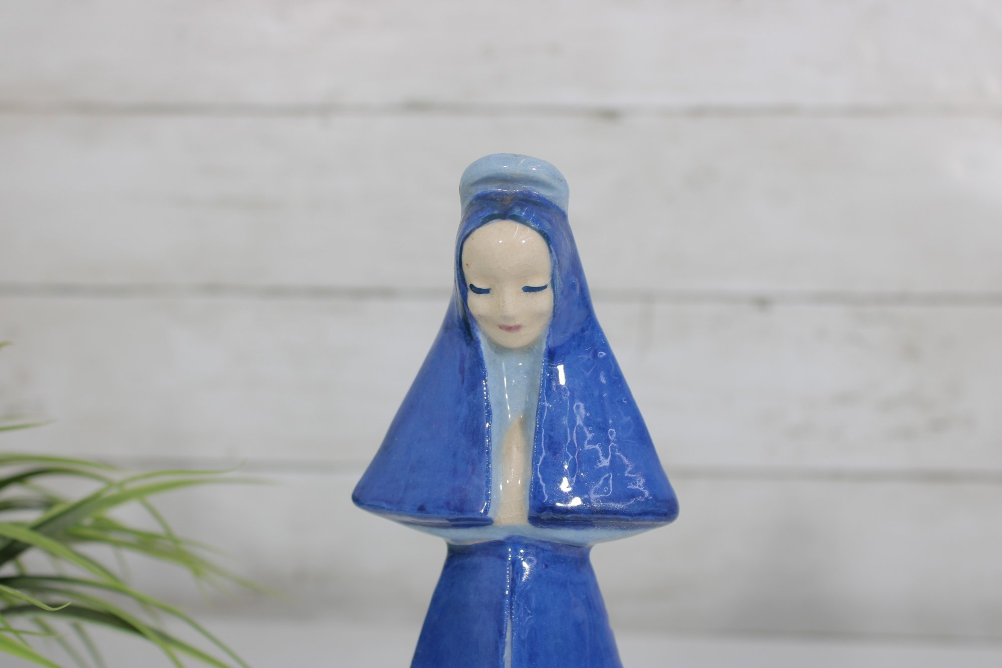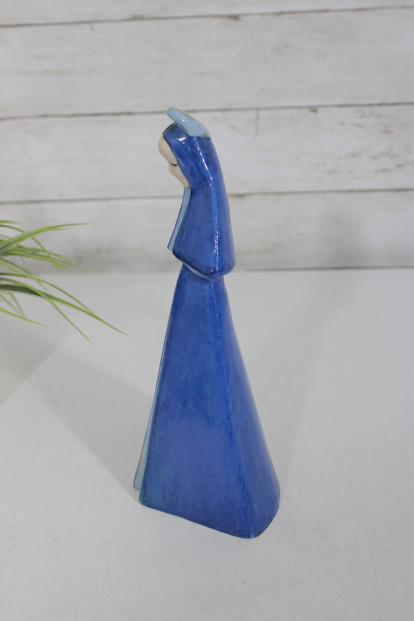 Charming vintage handmade pottery figurine depicting a stylized nun in a serene pose, finished in a rich blue glaze with soft facial detailing. The minimalist, elongated form gives this piece a modern yet folk-art feel, blending religious subject matter with artistic simplicity.