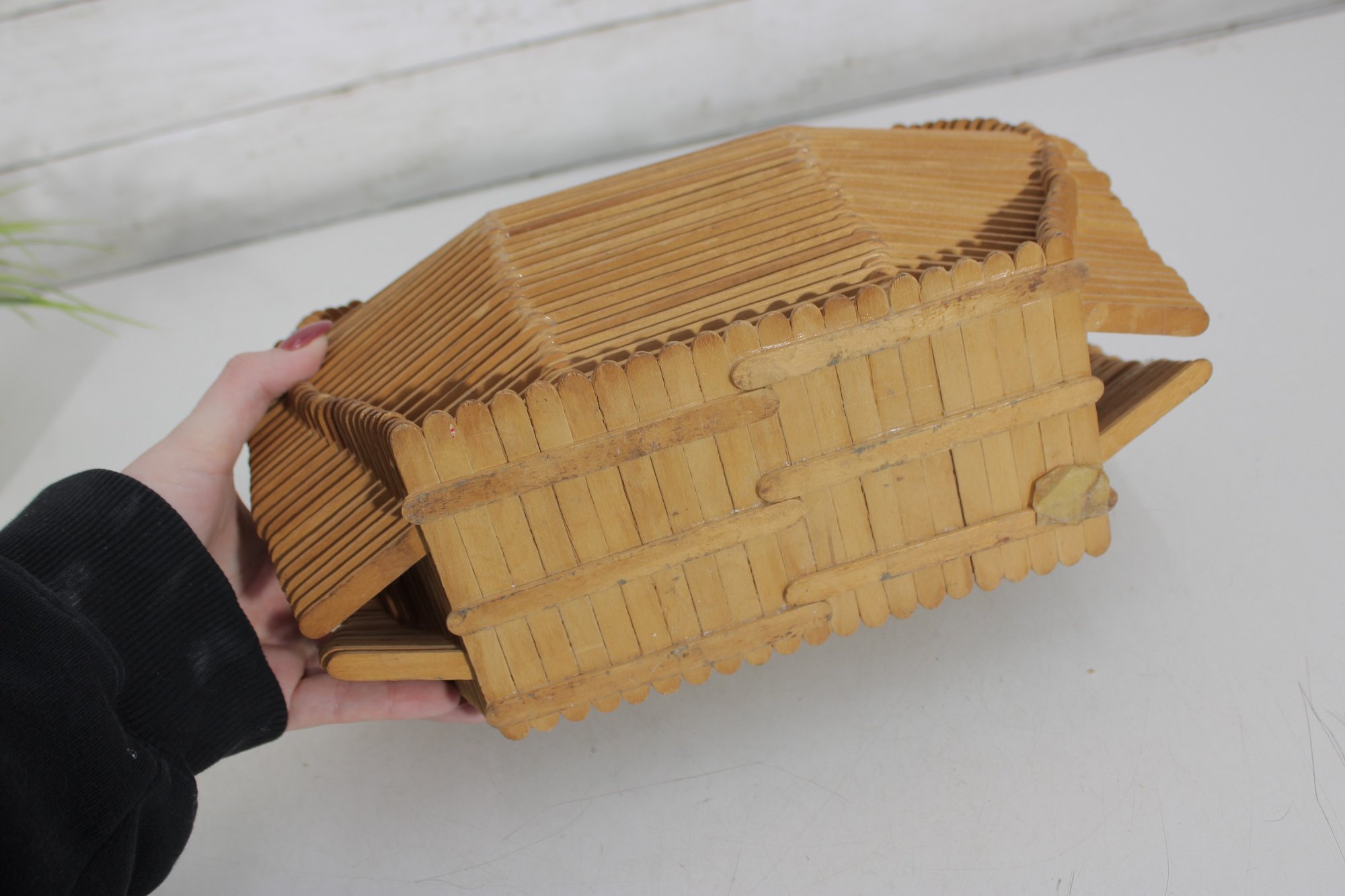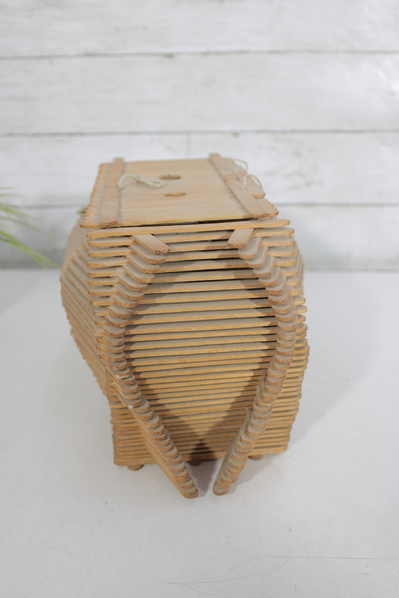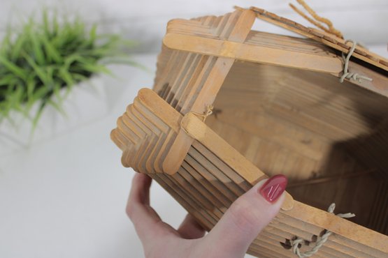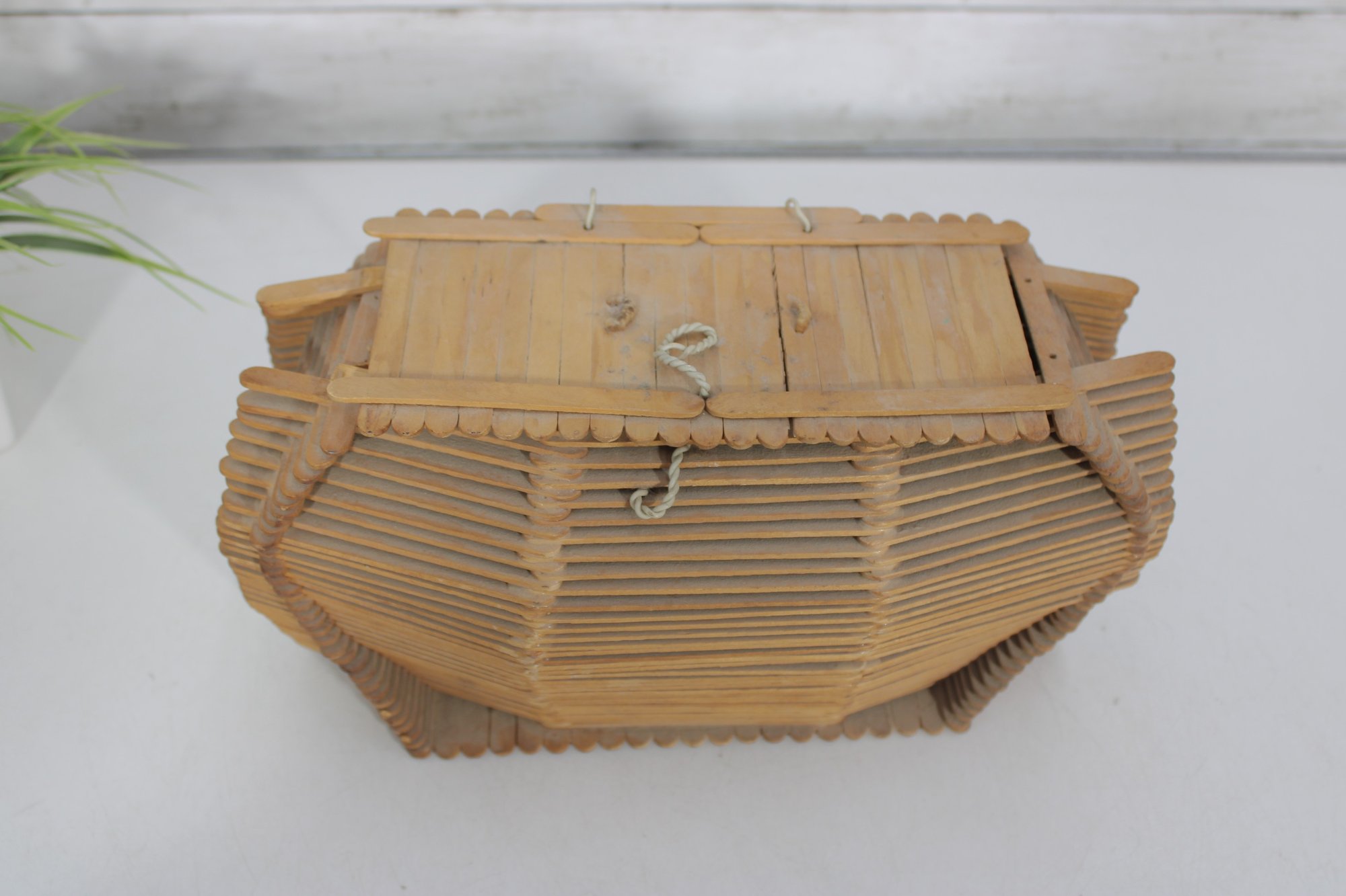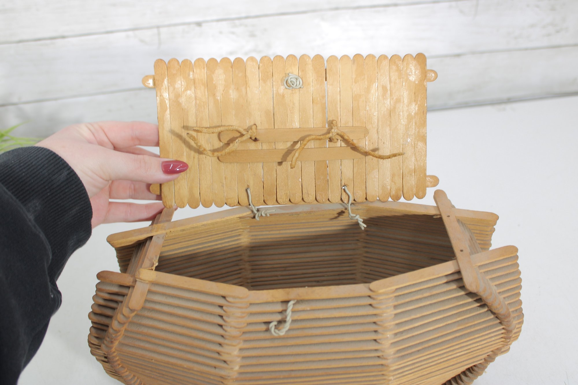 Vintage Handmade Wood Popsicle Stick Basket | Rustic Folk Art Storage Box | 6.5"H x 13"W x 6"📌Please be sure to review all photos carefully before bidding, as they are part of the description.