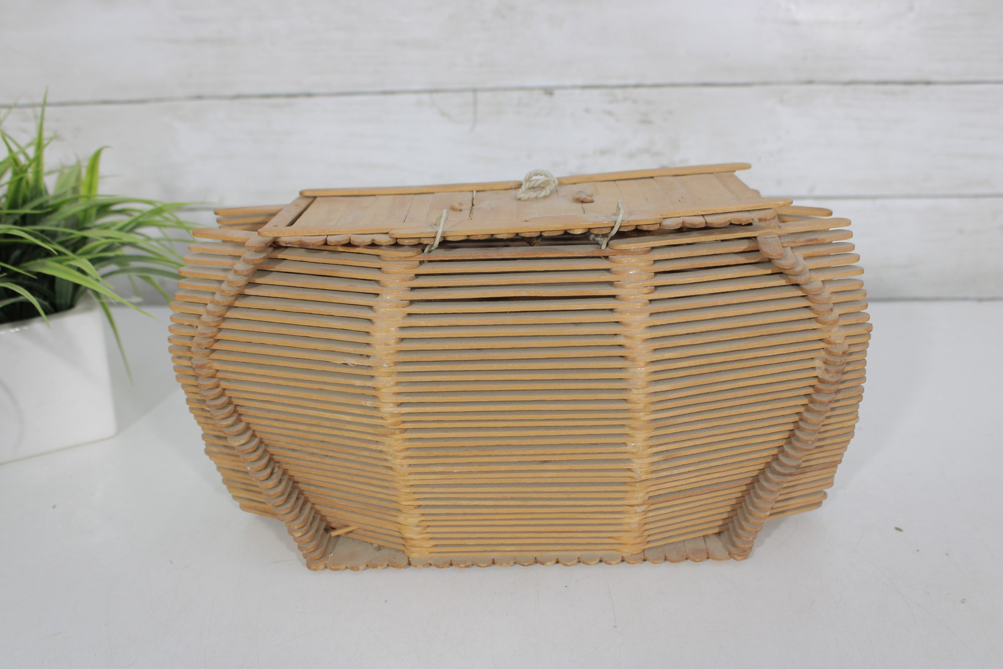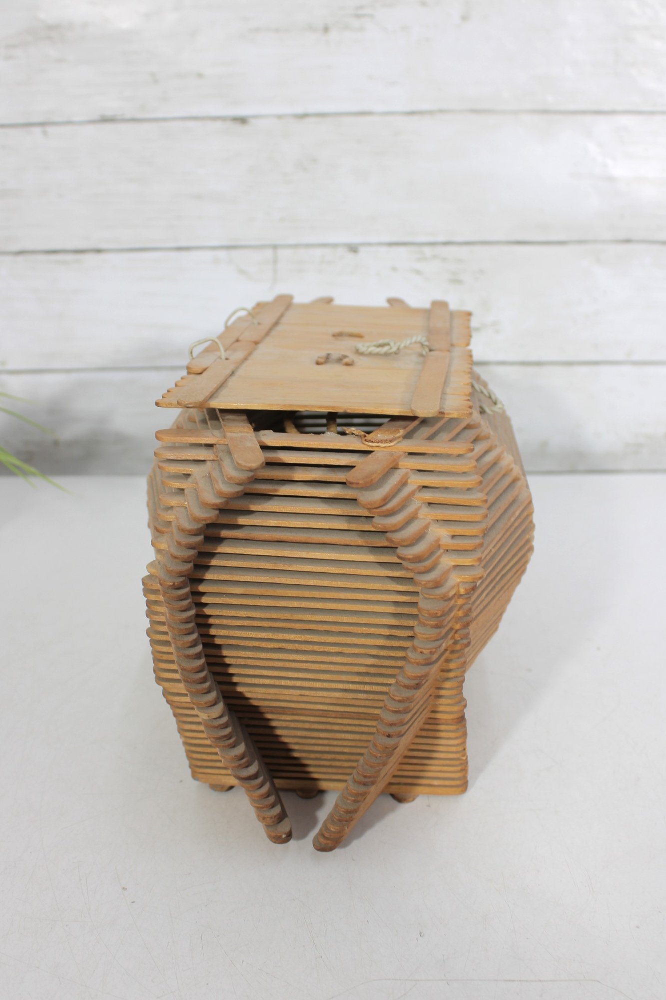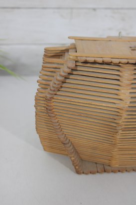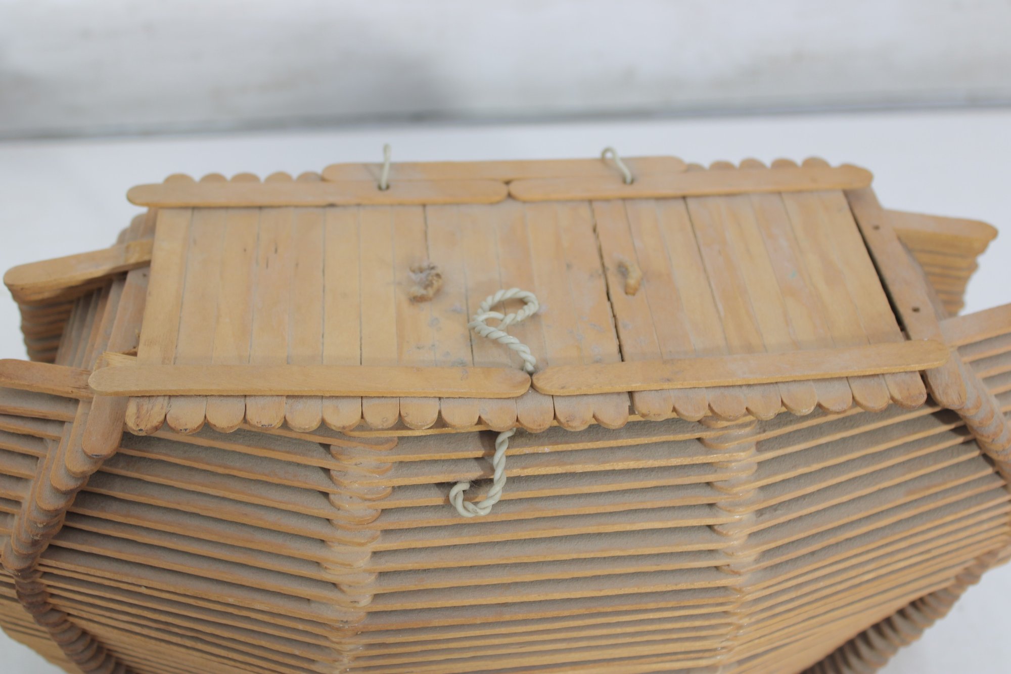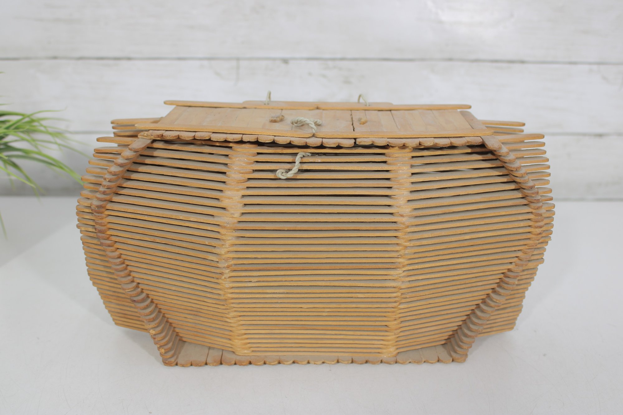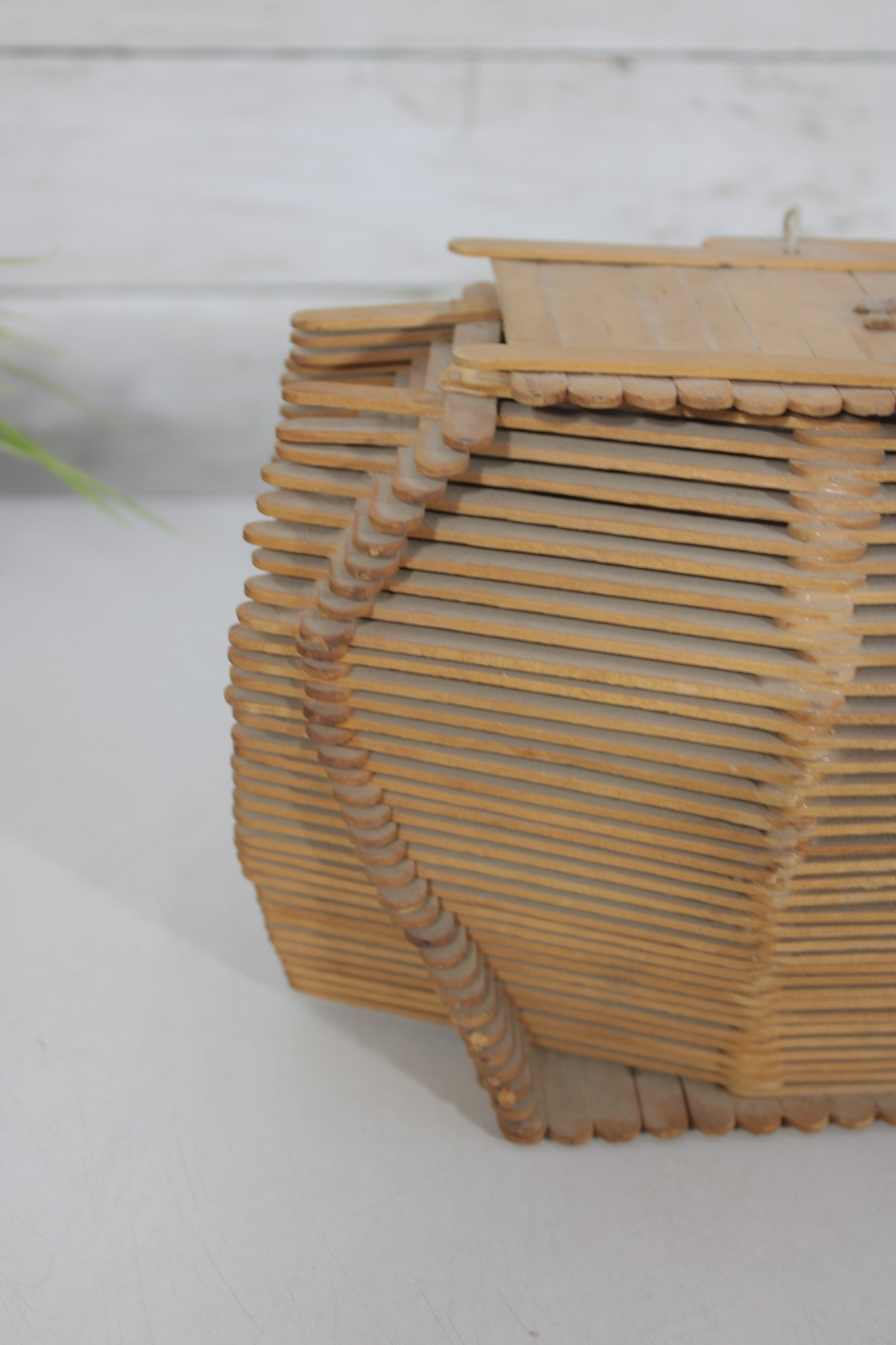 Vintage Handmade Wood Popsicle Stick Basket | Rustic Folk Art Storage Box | 6.5"H x 13"W x 6"📌Please be sure to review all photos carefully before bidding, as they are part of the description.