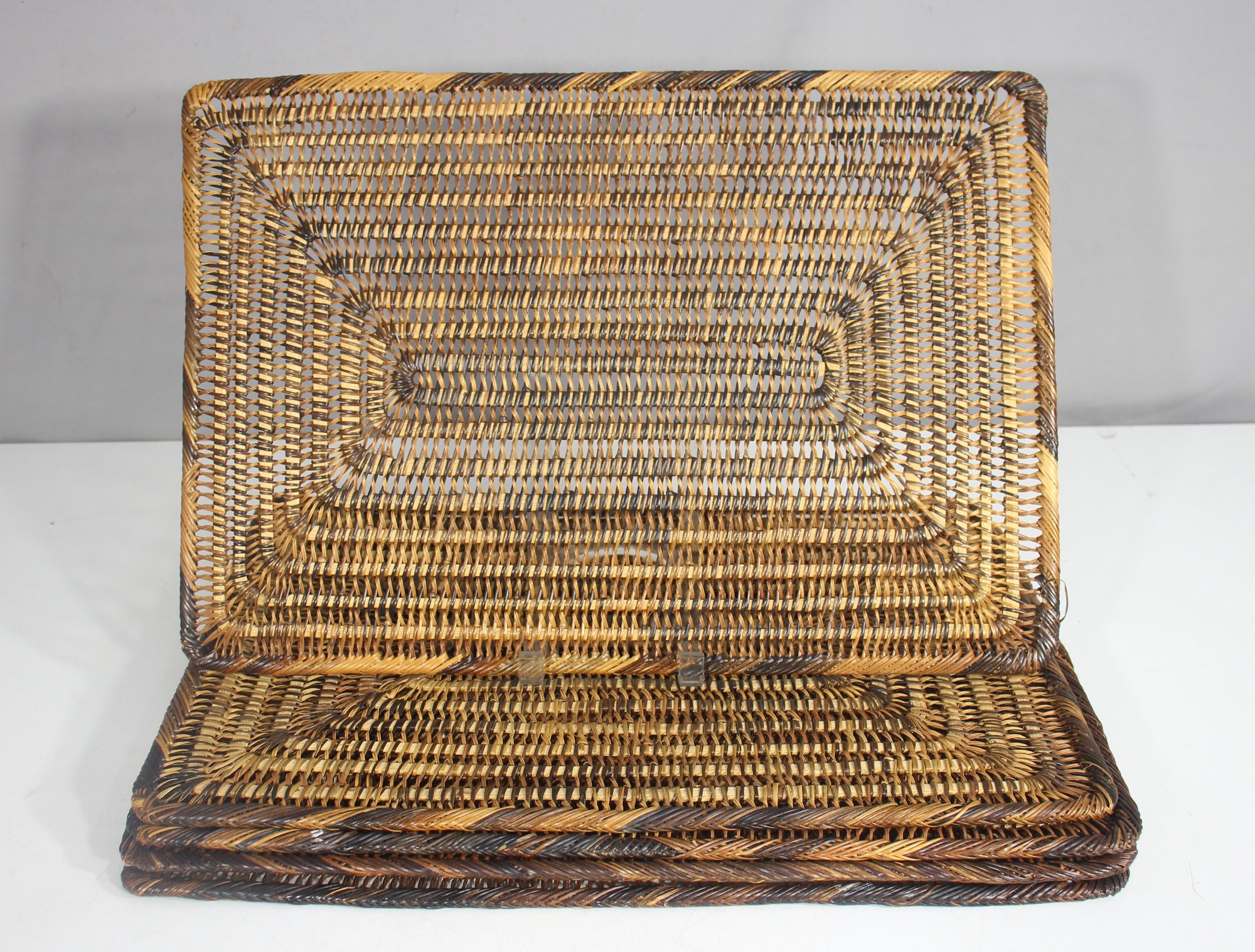 Add rustic charm to your dining experience with this set of five vintage handwoven rattan placemats. Crafted with intricate weaving, these placemats feature a classic rectangular shape with warm natural tones. Perfect for everyday use or special occasions, they bring an elegant yet casual touch to any table setting. Some wear consistent with age. See photos for details.