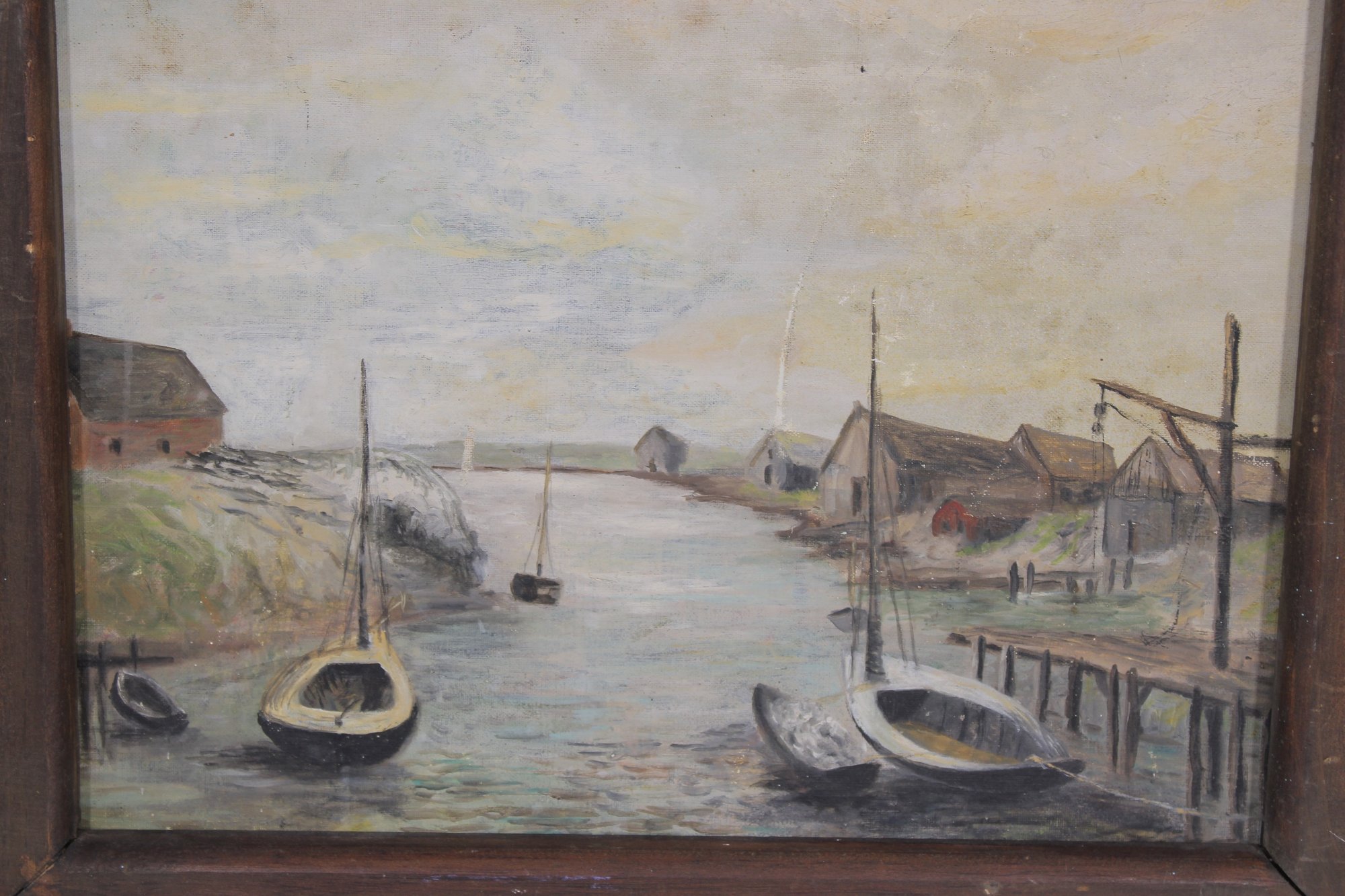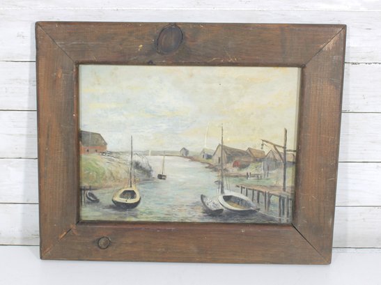 A charming vintage harbor landscape painting depicting a quiet waterfront scene with small sailboats moored along a dock and buildings lining the shoreline. The peaceful composition captures a calm inlet or harbor with muted sky tones and softly rendered water, creating a serene coastal atmosphere.