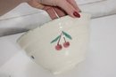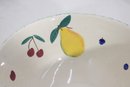This charming multi-fruit pattern features colorful pears, cherries, plums, blueberries, and other fruit motifs on a warm cream background with ribbed exterior detail.