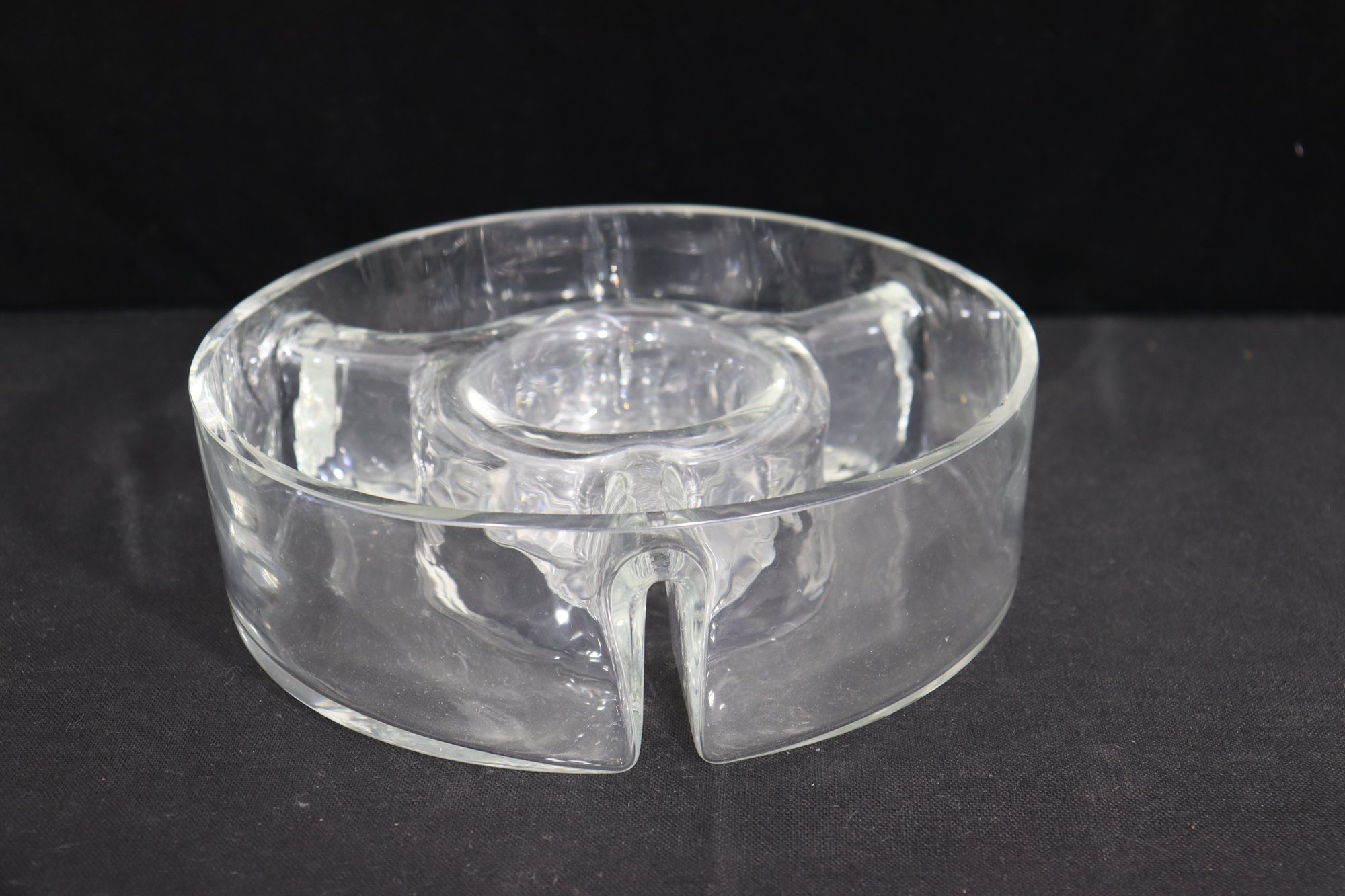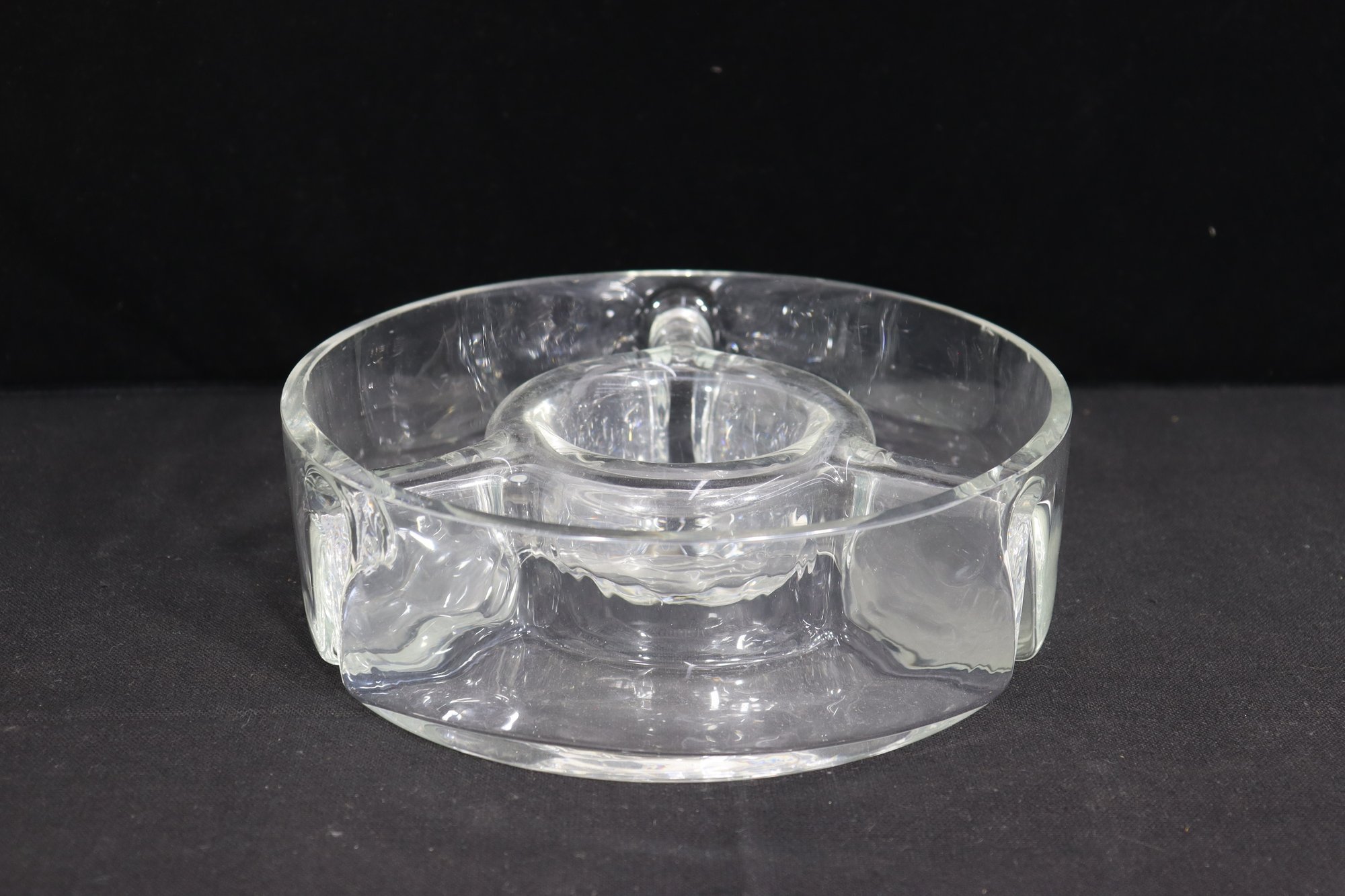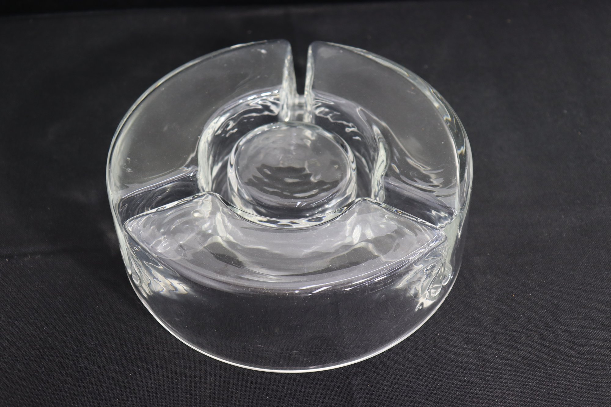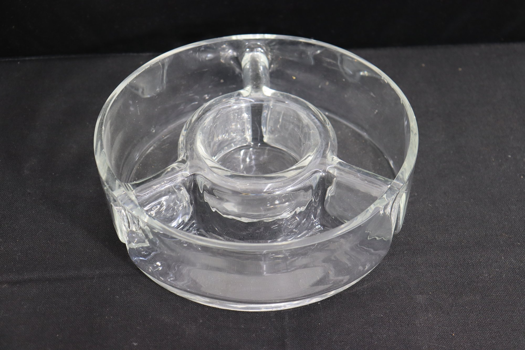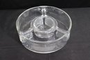 Vintage heavy clear glass divided serving dish / relish bowl. Features a 3-section round design with a raised center well – perfect for dips, olives, nuts, garnishes, sauces or party entertaining display.