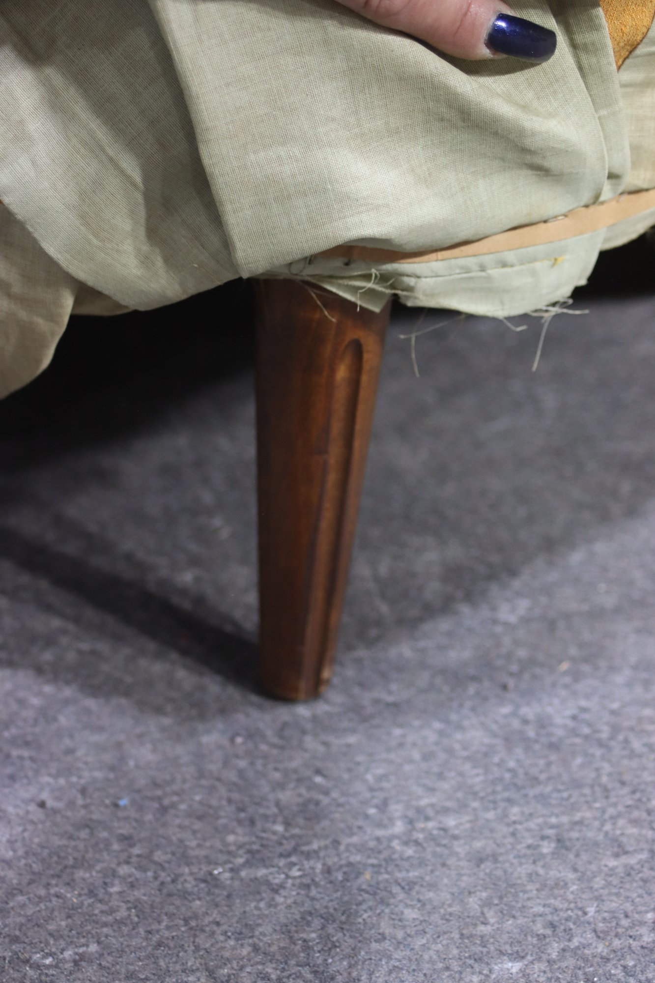 Iconic tall backrest, elegant curved arms, and pleated skirt detail