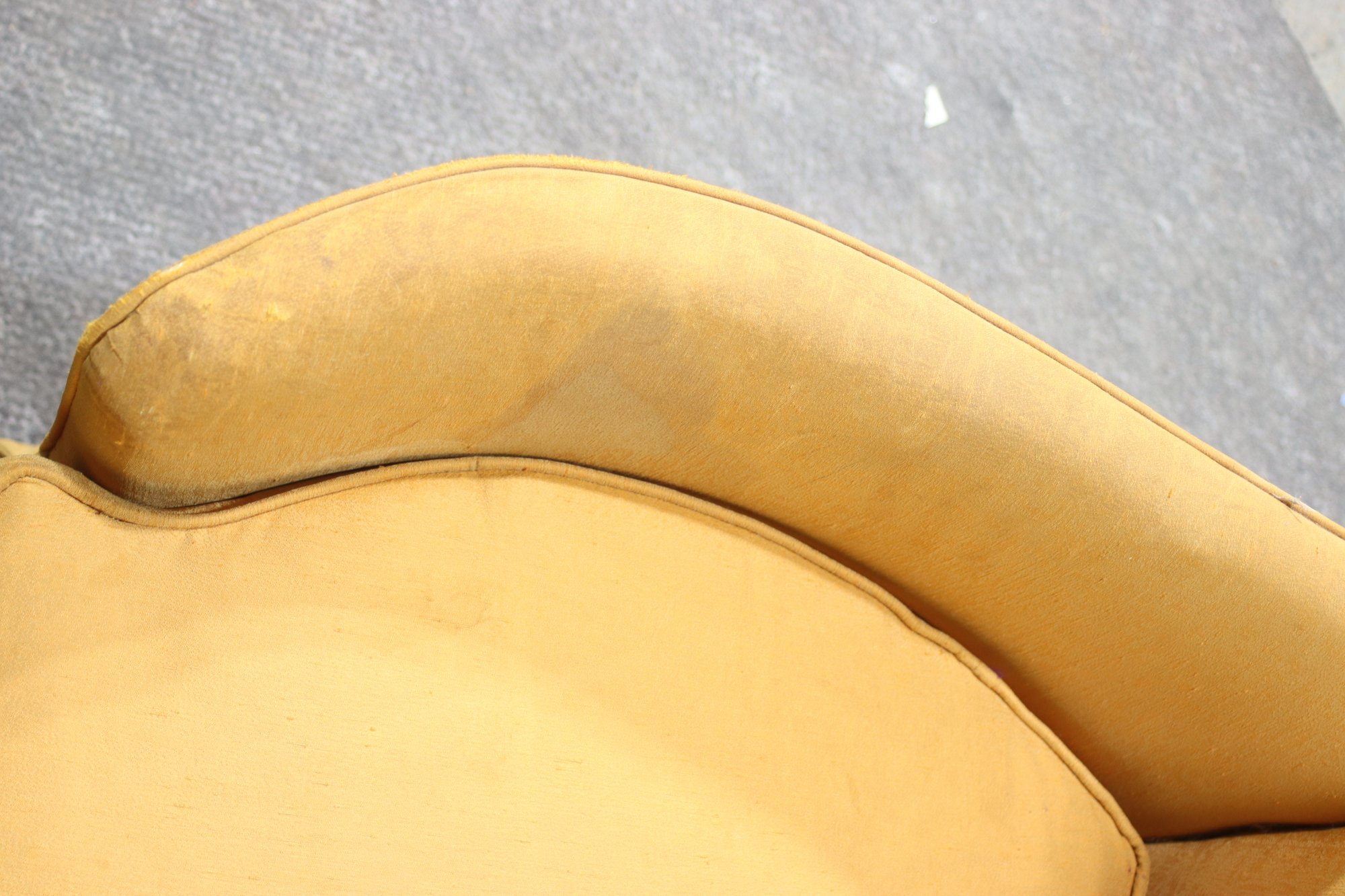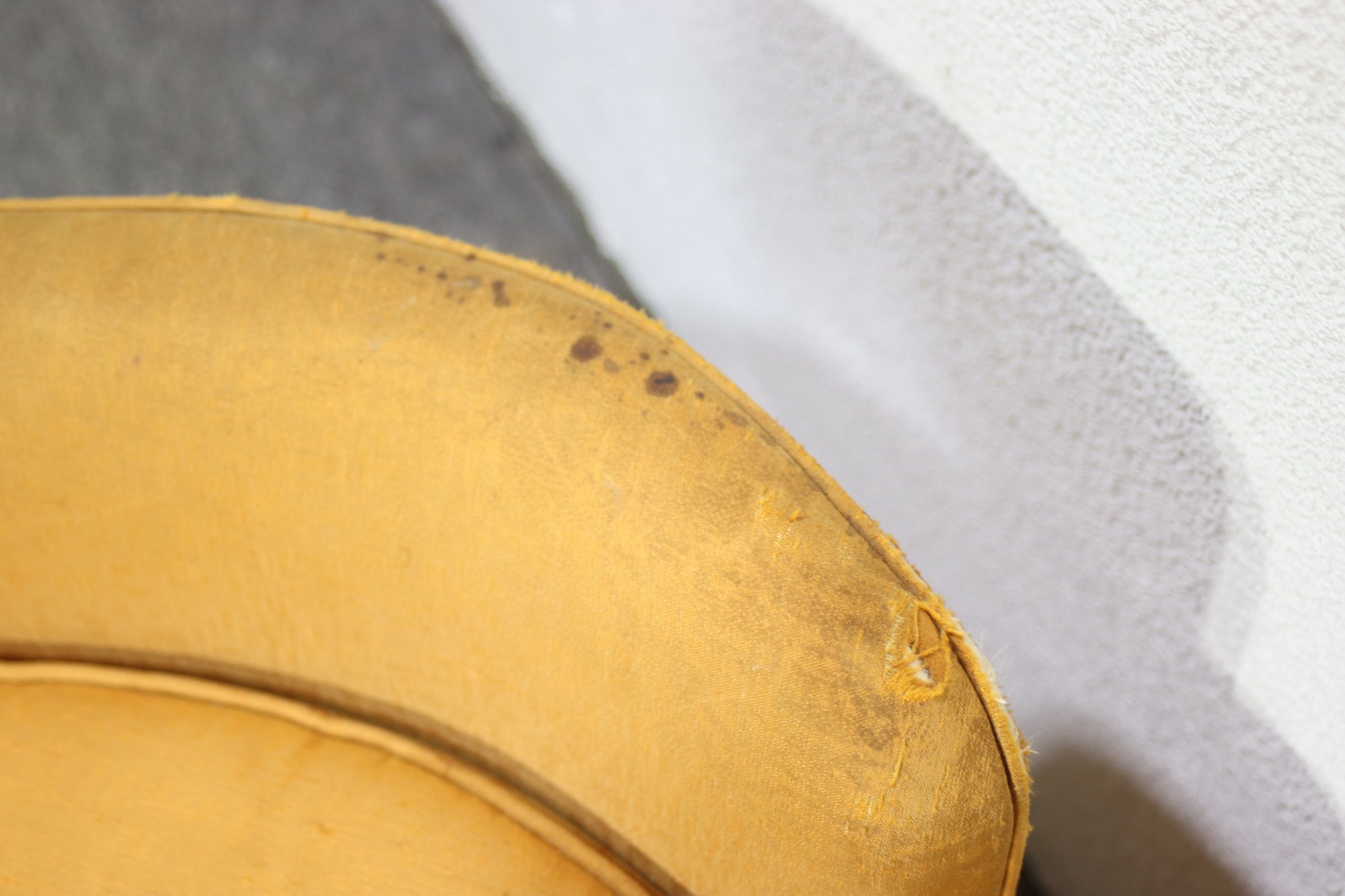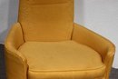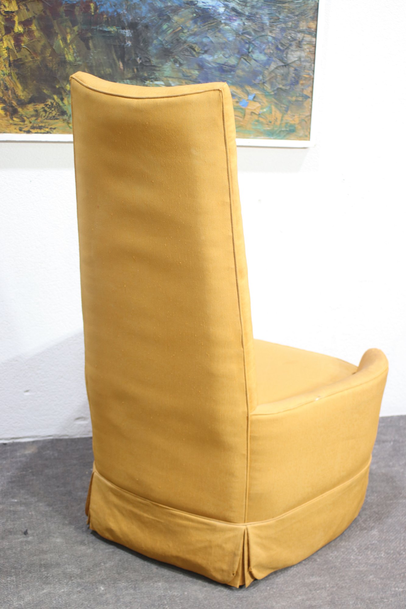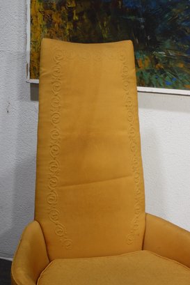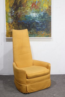 vintage high-back lounge chair features a bold mid-century modern design with a dramatic tall back, plush cushioning, and a mustard yellow velvet upholstery. Its sculptural form makes it a statement piece, perfect for adding a touch of retro glamour to any space.
