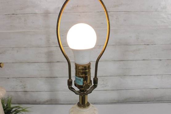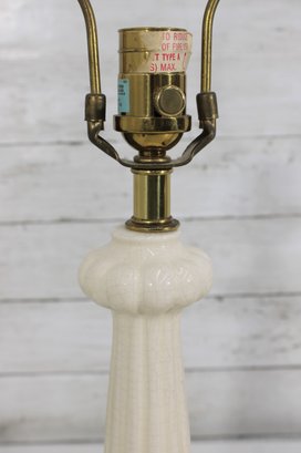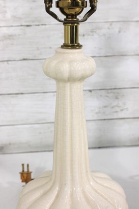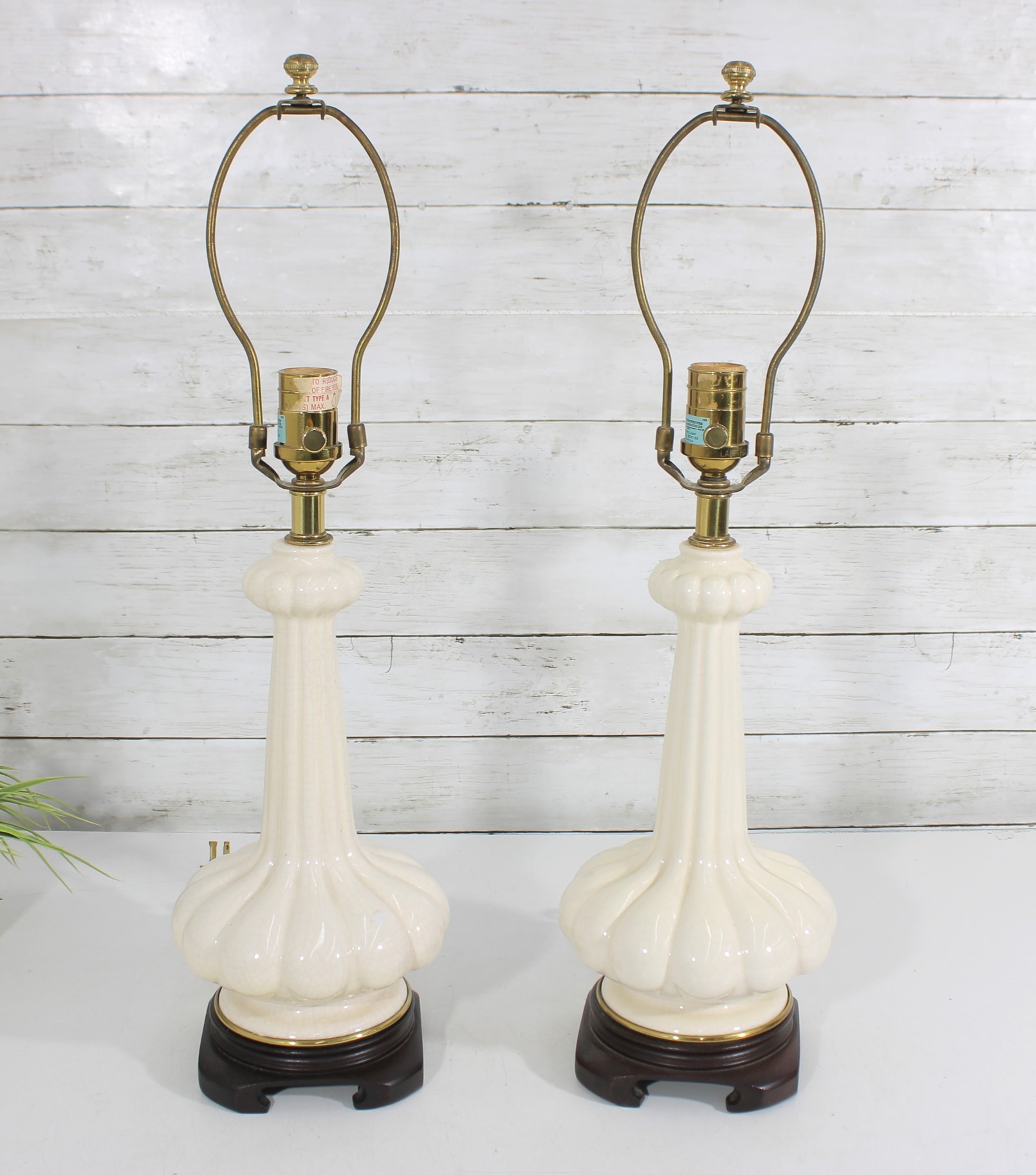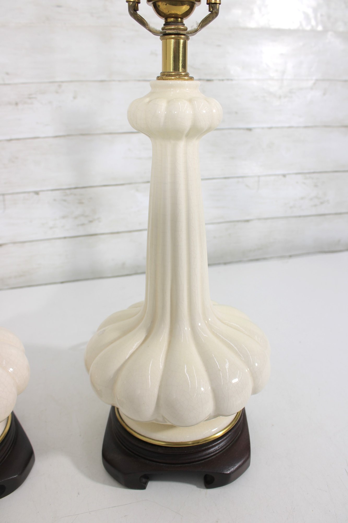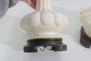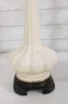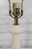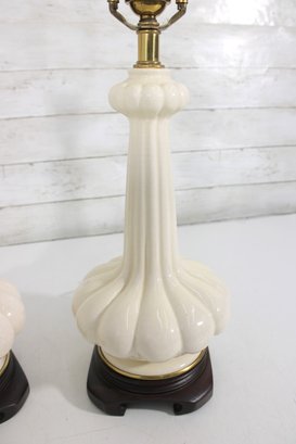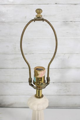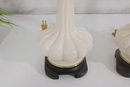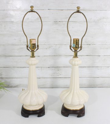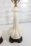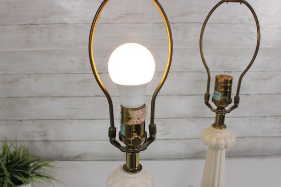 this beautiful pair of vintage Hollywood Regency table lamps, dating to the 1960s. Crafted in classic white milk glass, each lamp features a sculptural, fluted form with raised neoclassical relief detailing that exudes refined, traditional style.