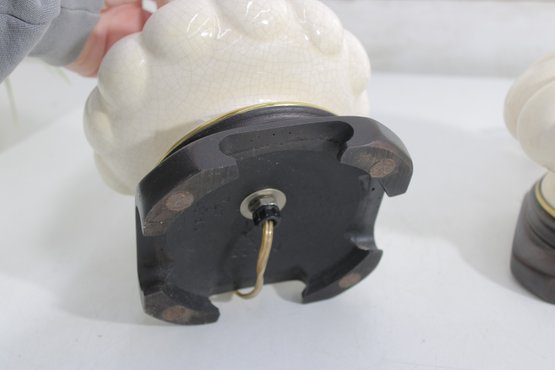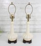 The lamps are complemented by warm brass-tone hardware and sit on dark wood bases, creating a striking contrast that enhances their sophisticated presence. Their tall, slender silhouette makes them perfect for bedside tables, living room end tables