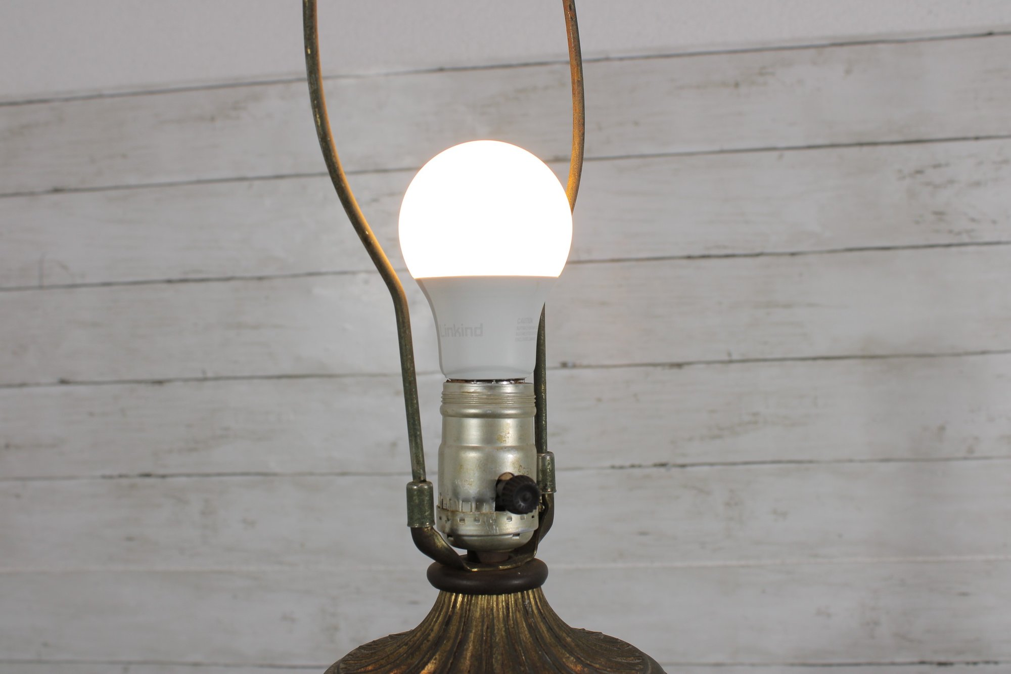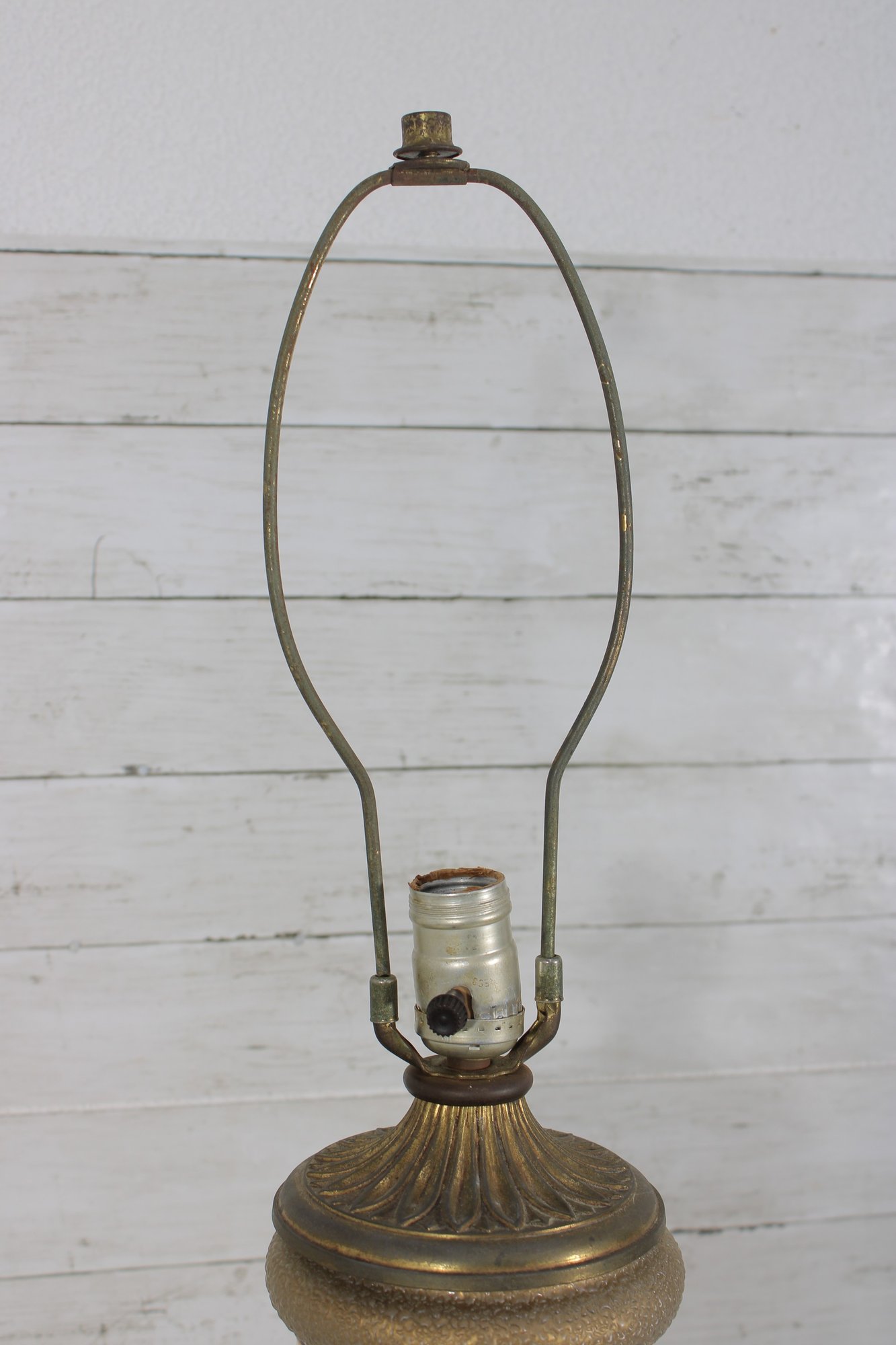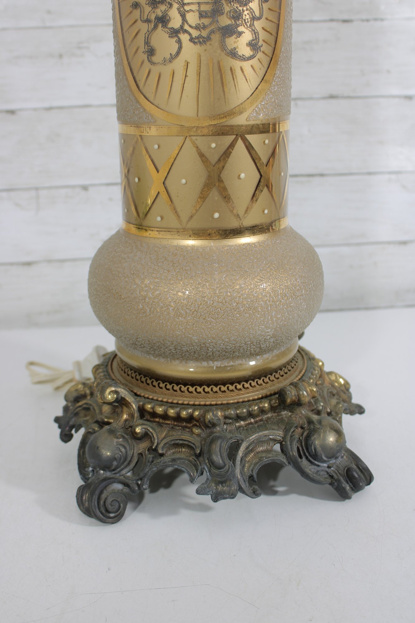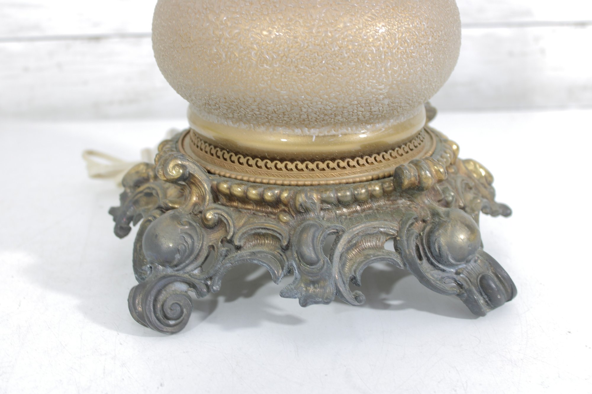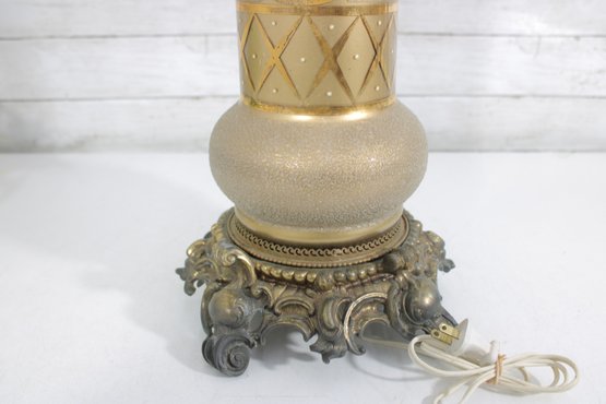 The textured glass body is complemented by gold-tone embellishments and sits atop an elaborate cast metal base adorned with scrollwork and figural detailing, reminiscent of cherubs or baroque styling. The combination of finishes gives this piece a luxurious, old-world aesthetic perfect for traditional