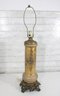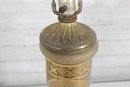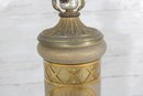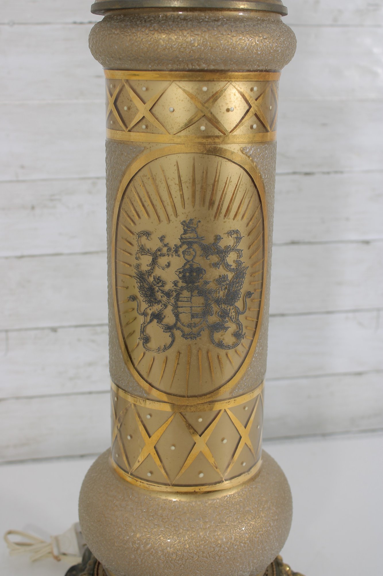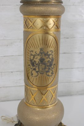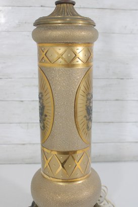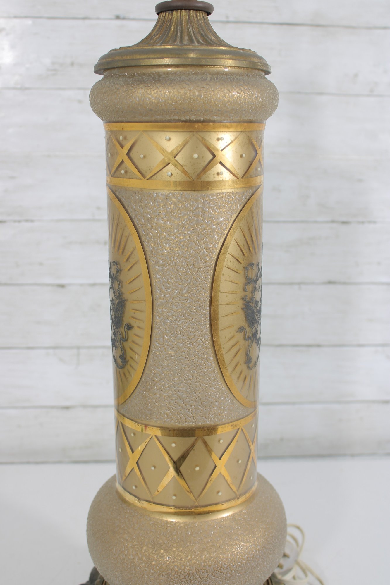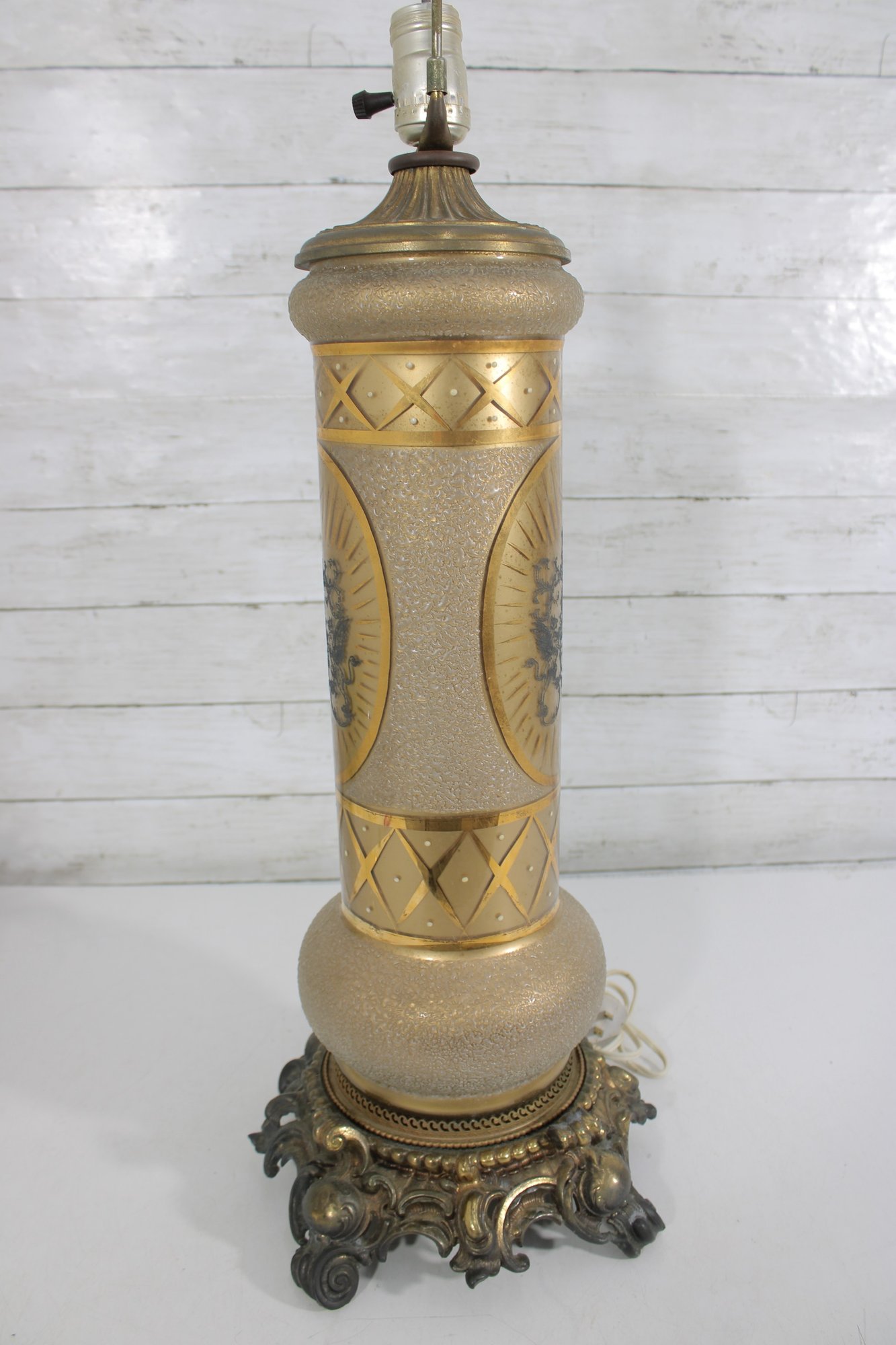 Make a bold statement with this stunning vintage Hollywood Regency table lamp, standing an impressive 33.5 inches tall. Rich in ornate detail, this lamp features a beautifully decorated column body with gilt accents, classical motifs, and a central medallion design that evokes Florentine and neoclassical influences.