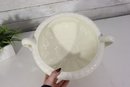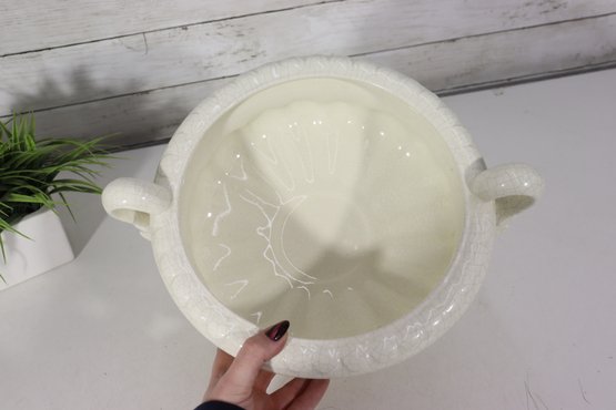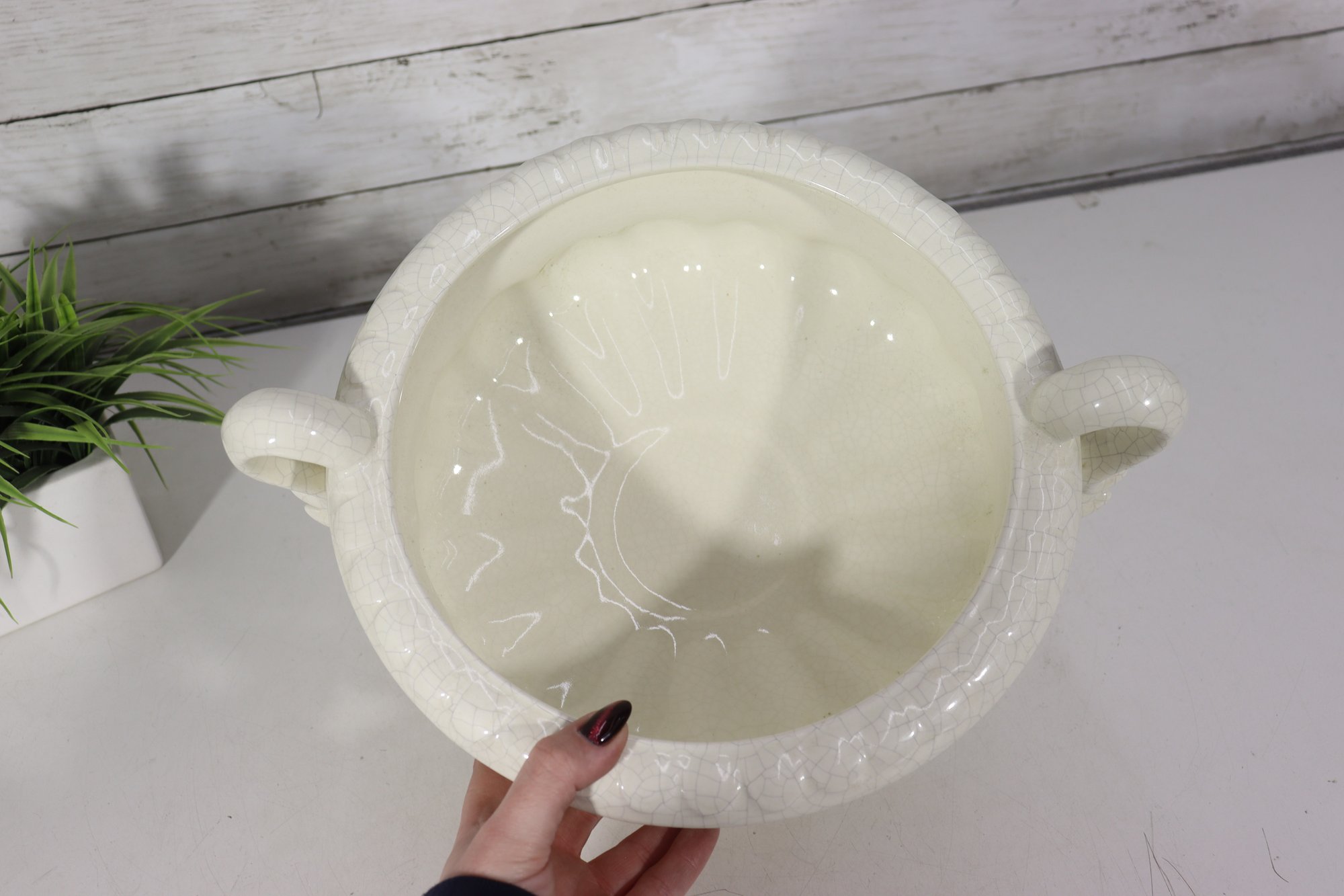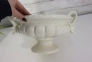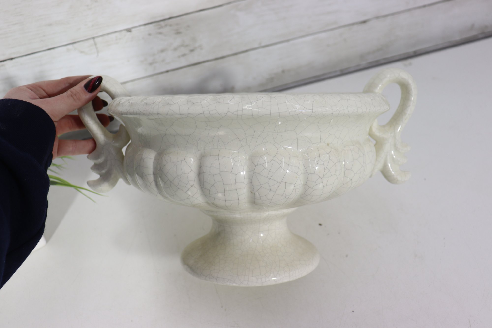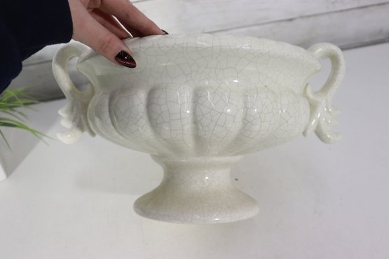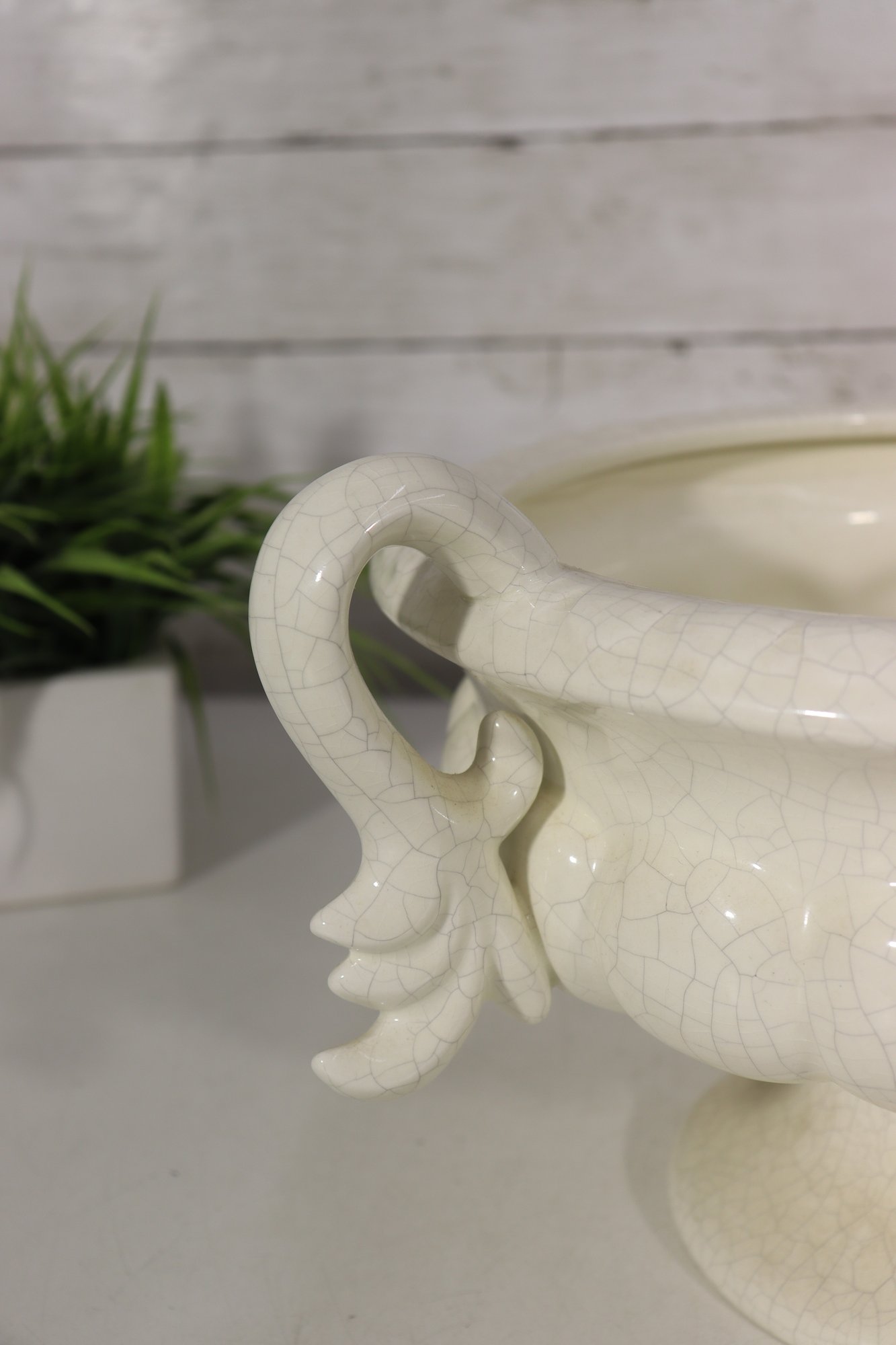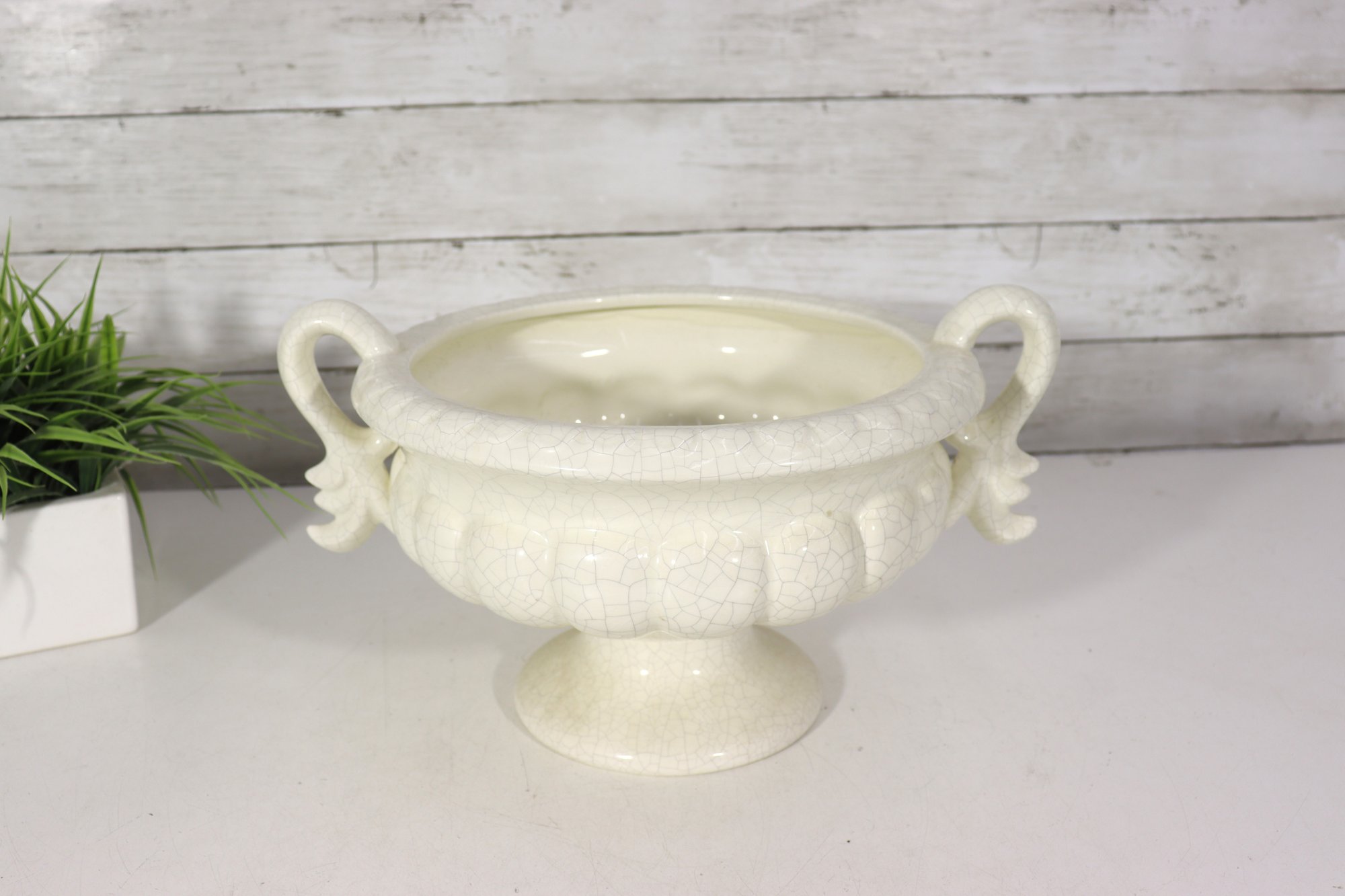 vintage Home Interiors pedestal urn bowl, crafted in white ceramic with a classic crackle glaze finish. This substantial decorative piece features a wide bowl form, scroll handles on each side, and a raised pedestal base, giving it timeless traditional appeal.