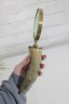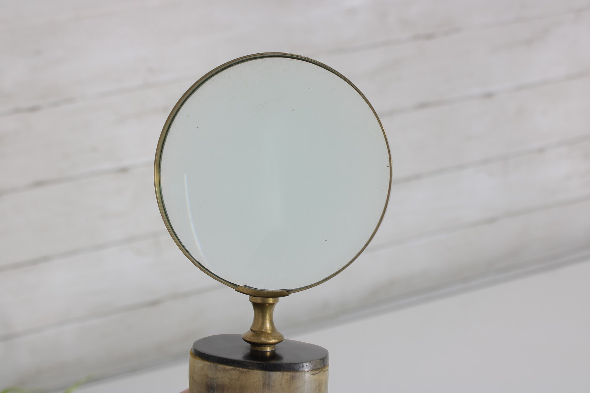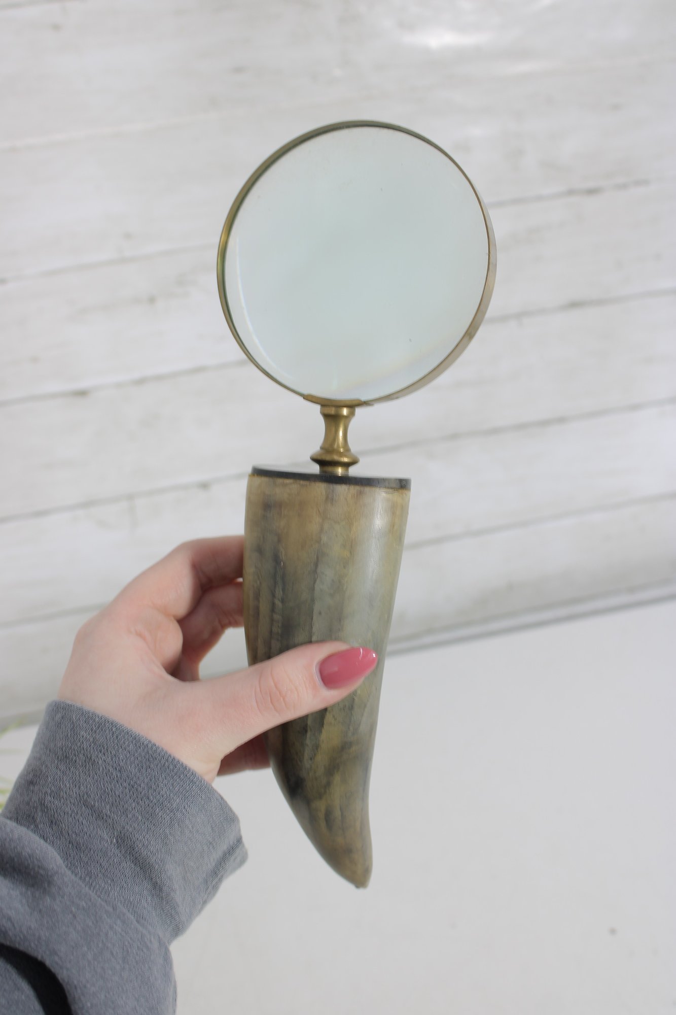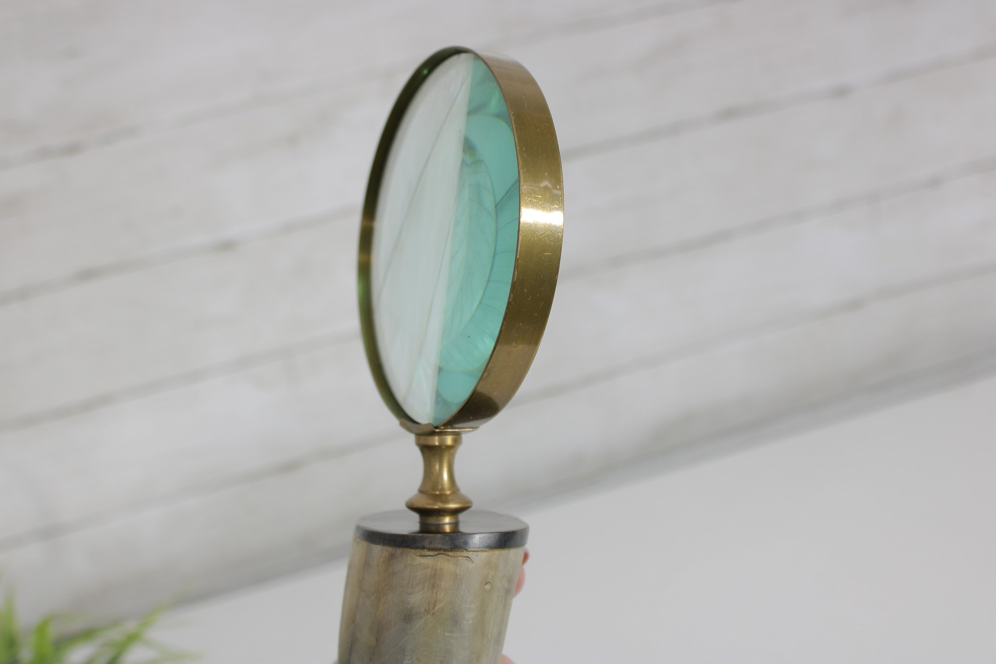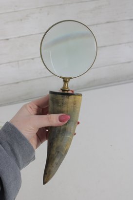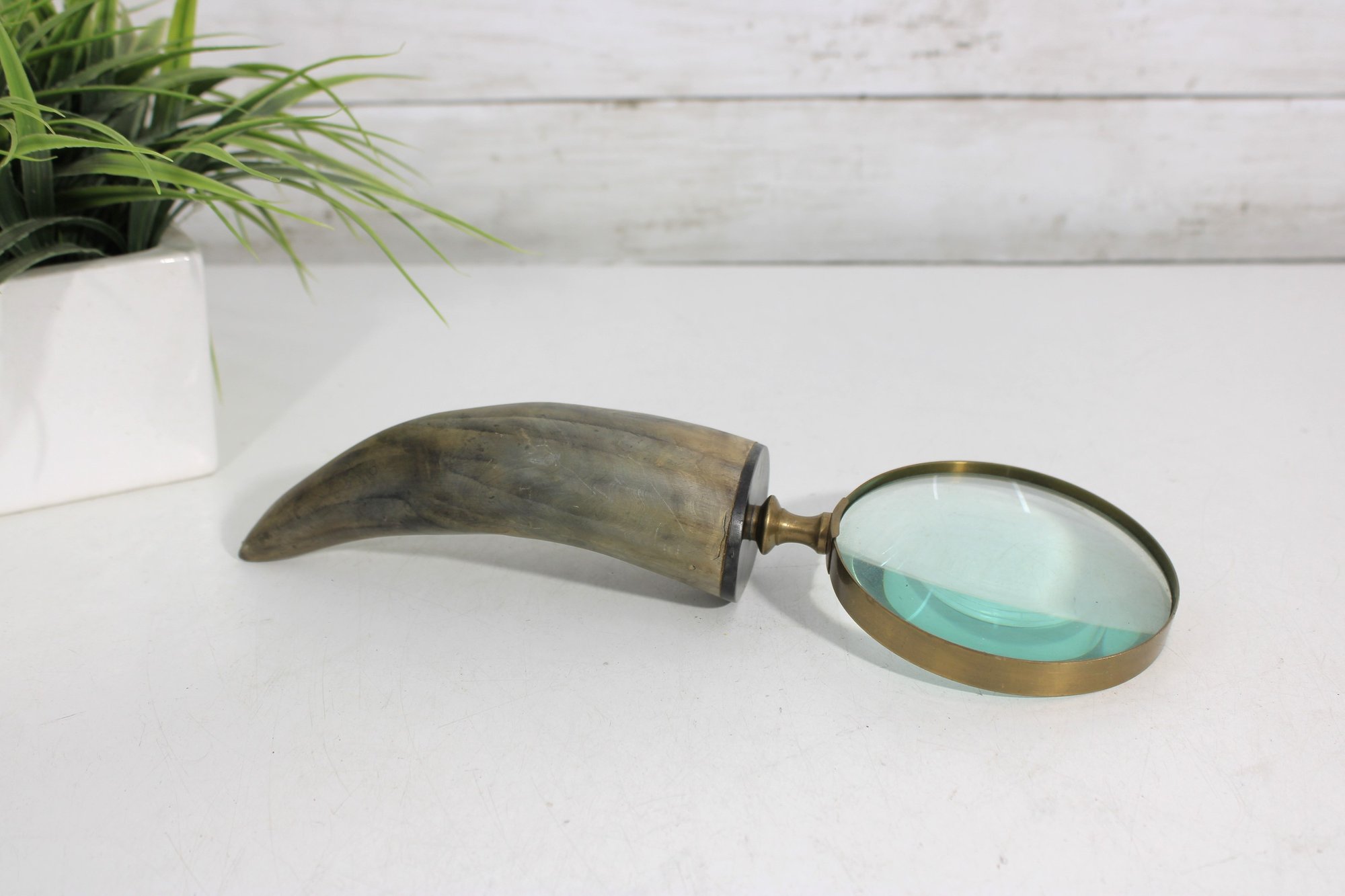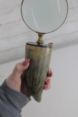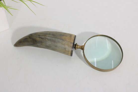 Distinctive vintage magnifying glass featuring a natural horn handle paired with a classic brass frame and green-tinted lens. The curved horn handle gives the piece a unique, organic look, while the brass accents add a refined, antique-style touch.