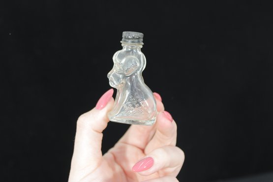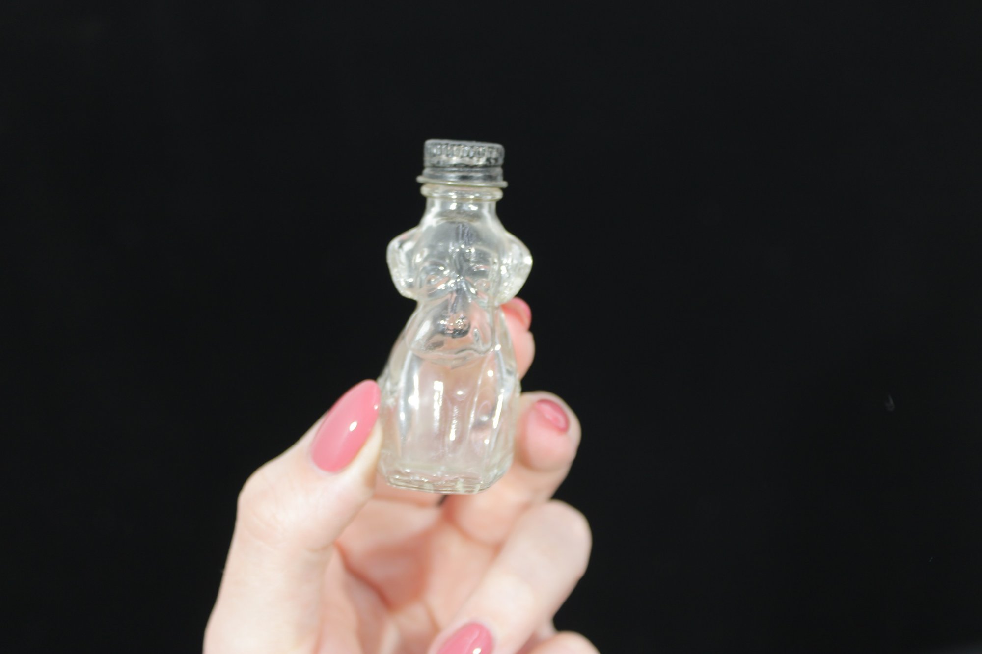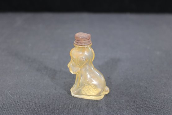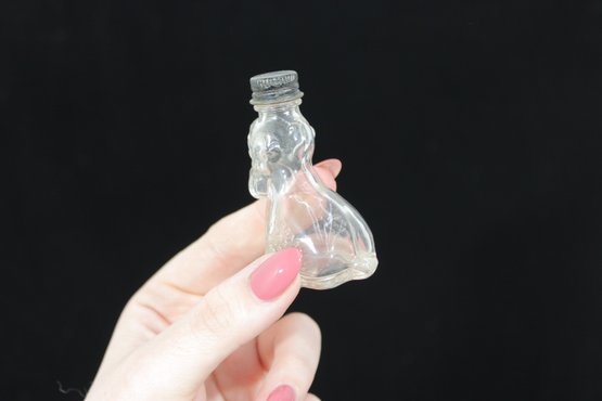 a pair of vintage Hound Pup glass candy containers, dating to 1958. These charming novelty bottles are molded in the shape of a sitting hound dog and were originally used to hold small candies.