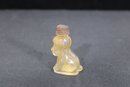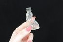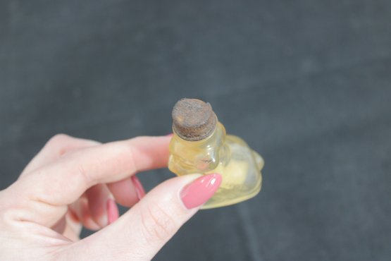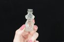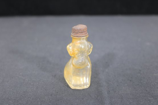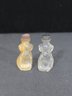 The lot includes two bottles—one clear glass and one amber tinted glass. One bottle retains its original narrow screw cap, while the other is missing the cap. The bottoms are embossed with markings consistent with vintage candy containers from the late 1950s.