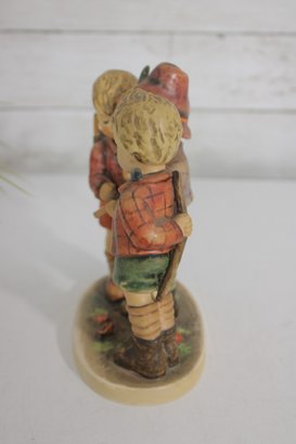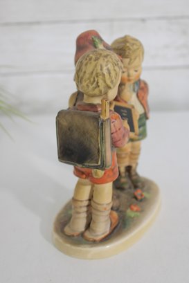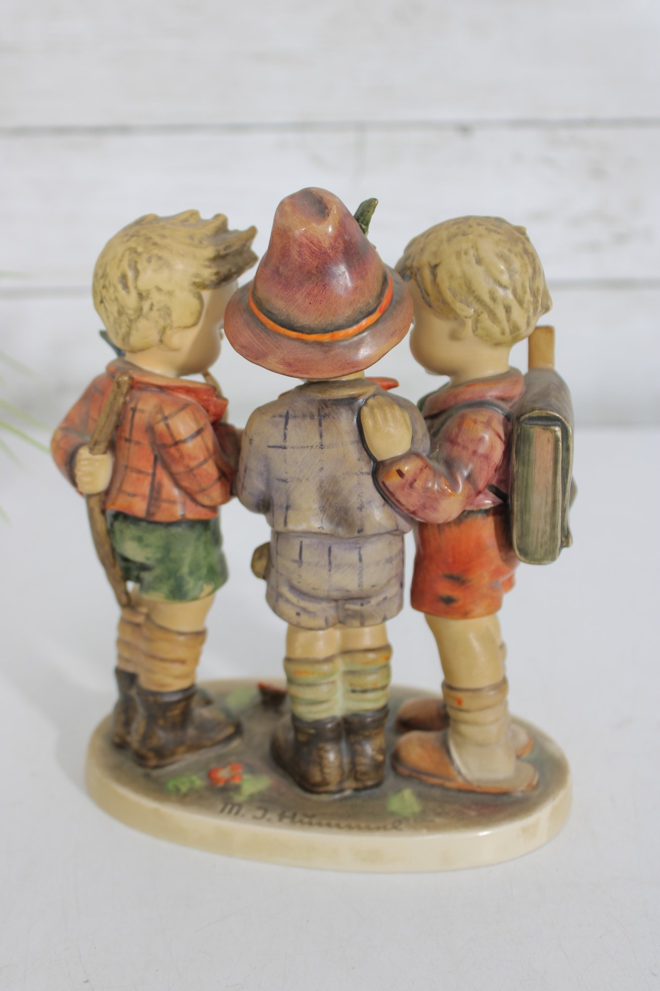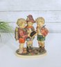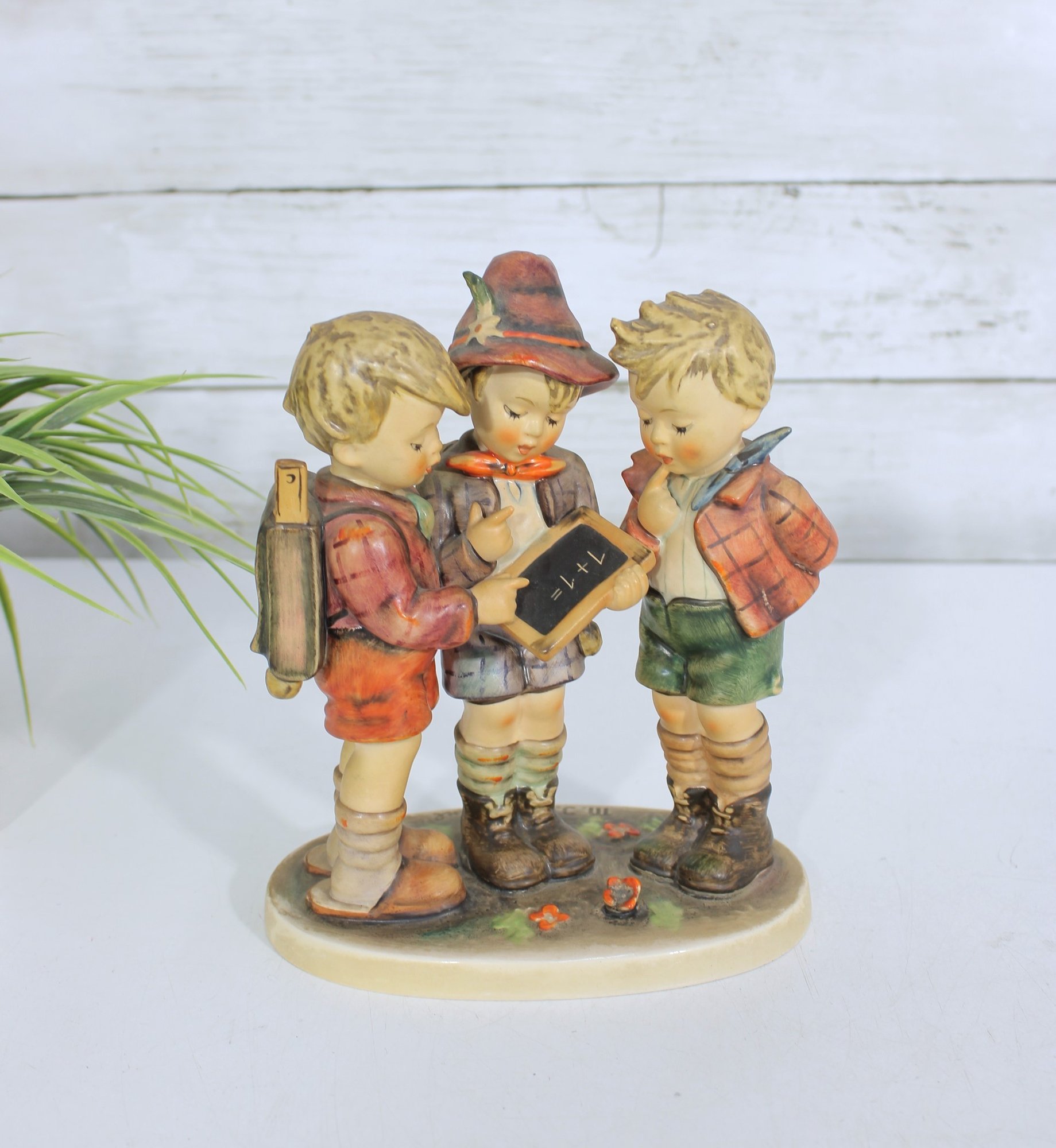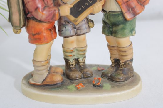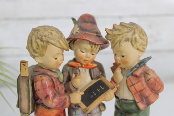 Charming vintage Hummel figurine depicting three school boys gathered together studying a small chalkboard. This classic piece showcases the beloved Hummel style with hand-painted details, soft colors, and expressive features.