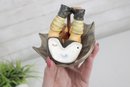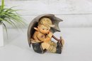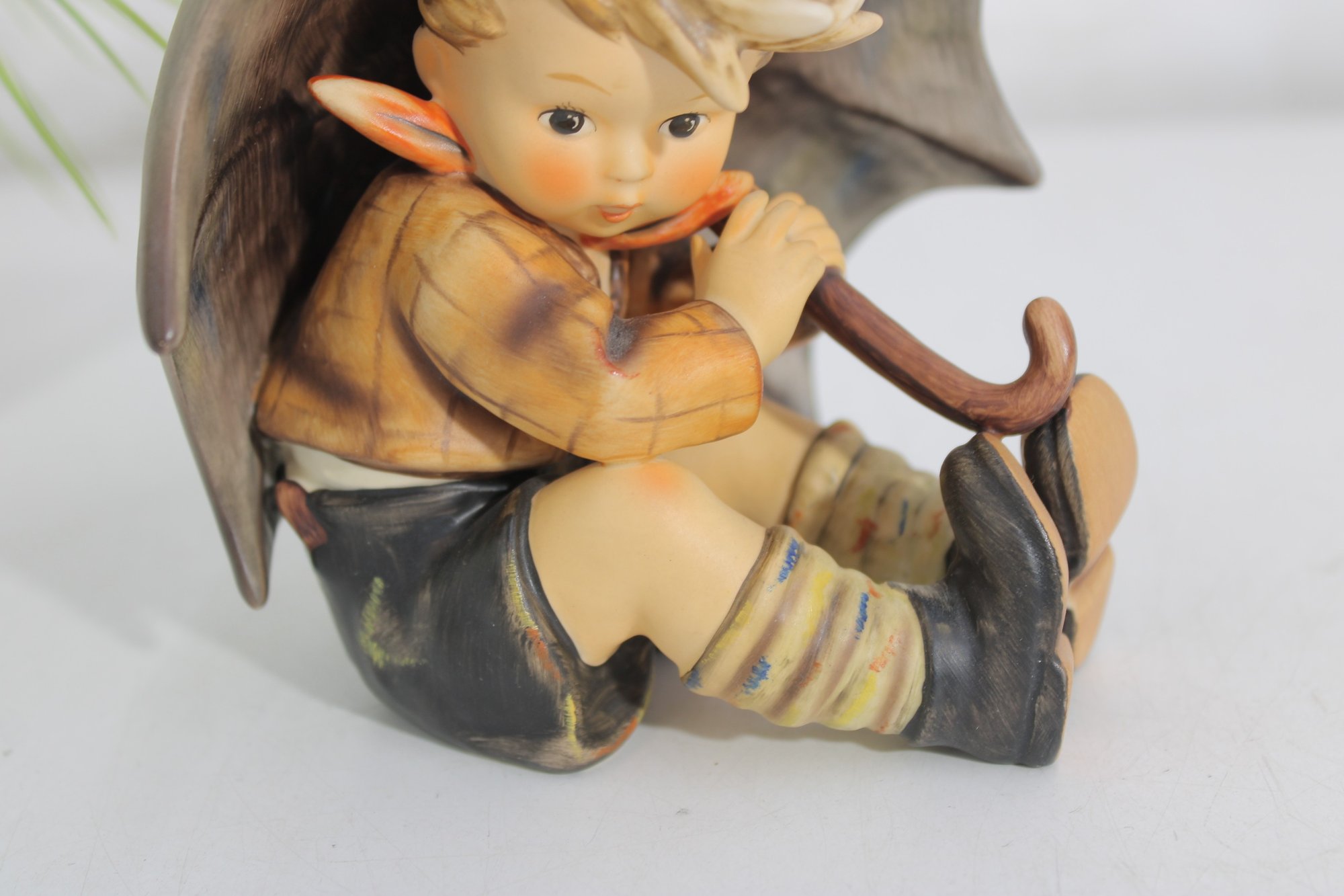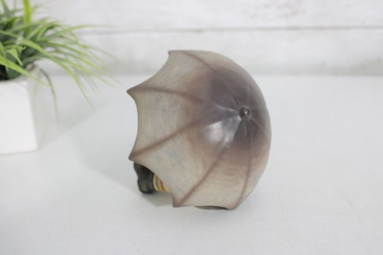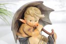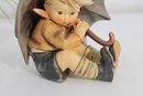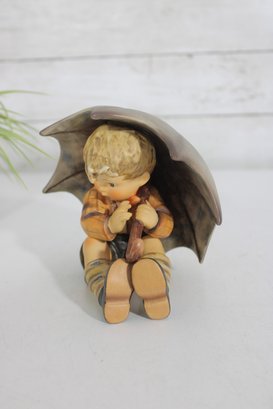 Adorable vintage Hummel figurine featuring a young boy seated under a large umbrella, capturing a sweet and whimsical rainy-day moment. This piece is beautifully hand-painted with soft, muted tones and fine detailing characteristic of classic Hummel craftsmanship.