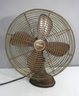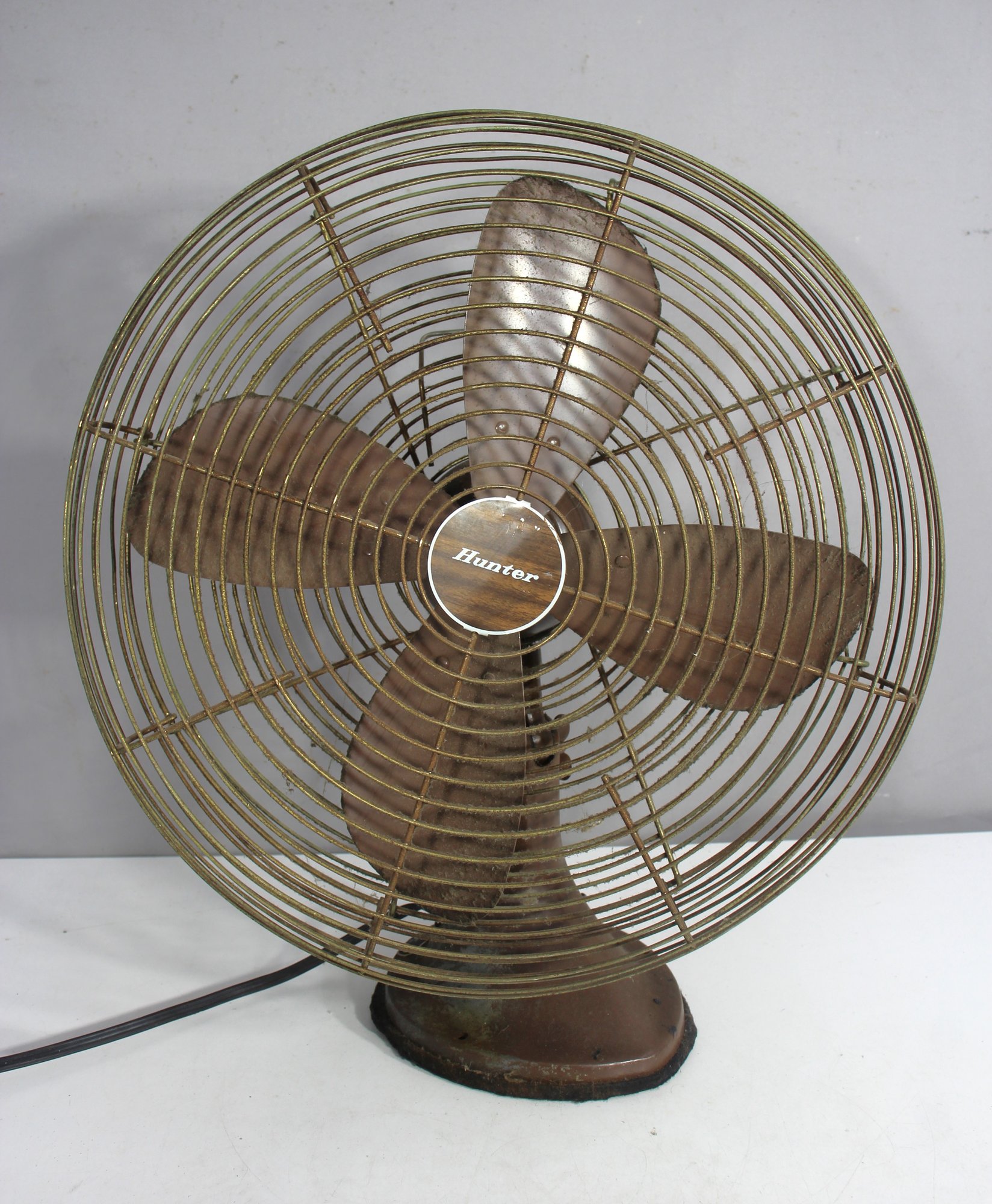 this vintage Hunter 11072 oscillating electric fan, a classic mid-century industrial design with a sturdy all-metal construction. This 16-inch fan features a four-blade design, protective wire cage, and an adjustable tilt base, making it a fantastic decorative piece or restoration project.