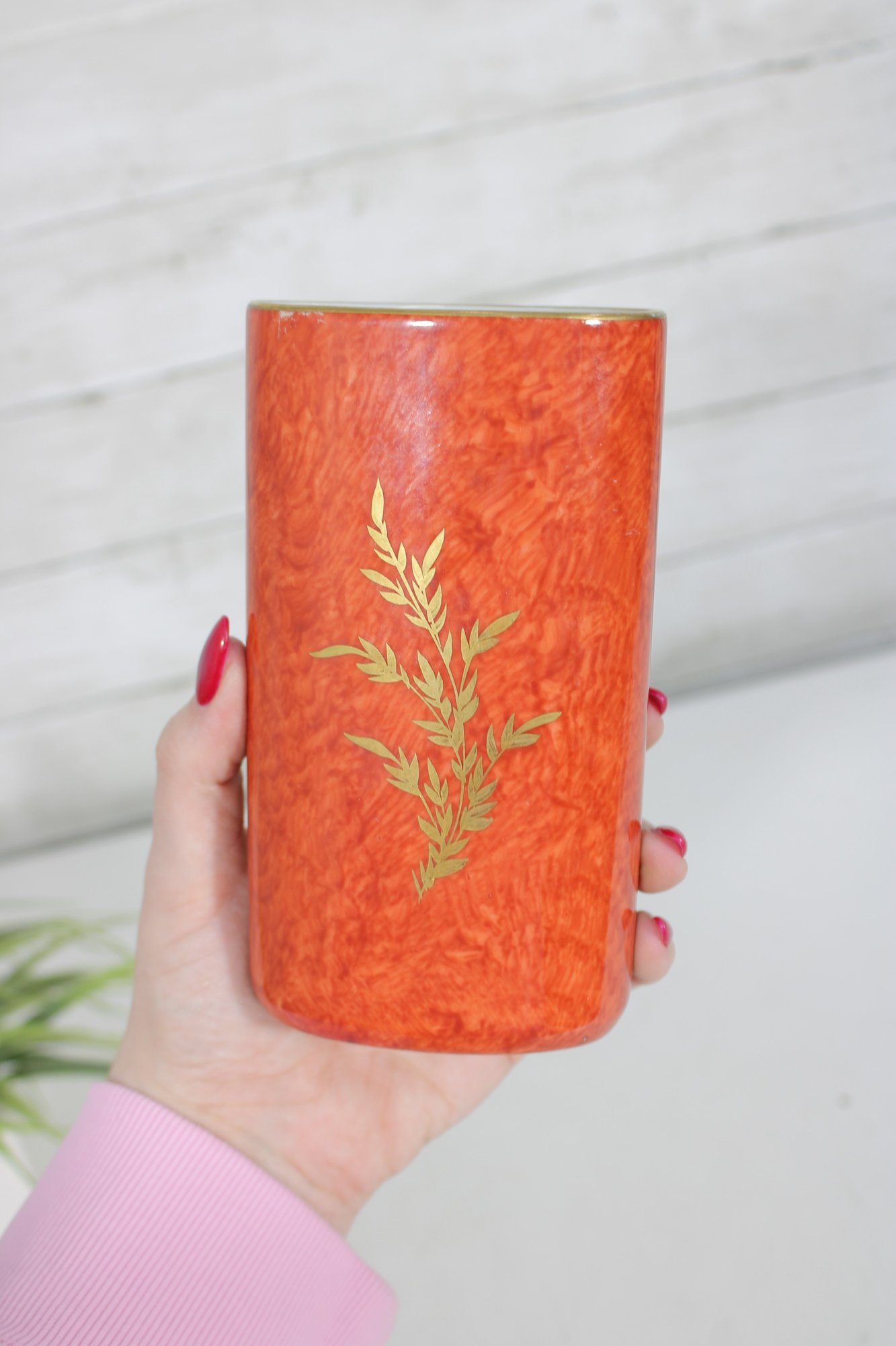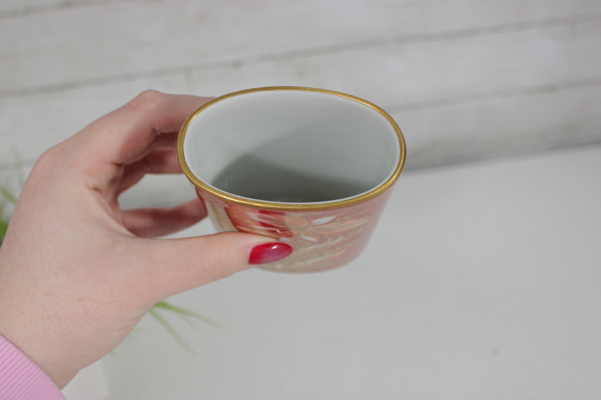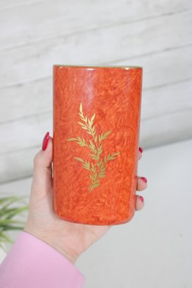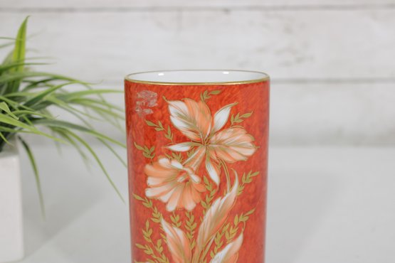 The cylindrical form is accented with delicate gold gilt trim at the rim and intricate botanical detailing that reflects the high-quality craftsmanship associated with Hutschenreuther porcelain. The interior is glazed, making it suitable for display or light functional use.
