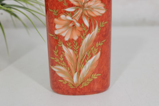 vintage Hutschenreuther porcelain vase, standing approximately 6 inches tall. This elegant piece features a rich red ground adorned with finely hand-painted floral decoration in soft cream, peach, and gold tones.